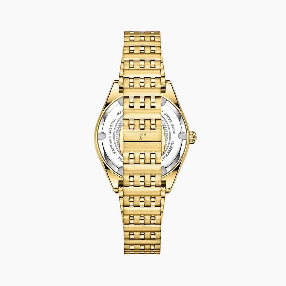 Jacques Philippe Radiante JPQLS682384 — изящная женская модель коллекции Radiante с кварцевым механизмом, сочетающая классический стиль и практичность. Корпус диаметром 33 мм выполнен из нержавеющей стали с PVDPVDУльтратонкое покрытие наносится в технике вакуумного напыления, сочетает в себе нитрид титана особой прочности со слоем золота или оксида хрома. Несёт в себе декоративную или защитную функцию.-покрытием и полированными поверхностями, безельБезельВнешний ободок, закрепляющий стекло. В спортивных часах так называется поворотное кольцо с делениями на циферблате, выполняет роль таймера – замеряет отрезки времени на шкале. Неподвижный безель – элемент декора. Однонаправленно вращающийся безель на дайверских часах позволяет фиксировать моменты погружения и выныривания на поверхность. инкрустирован кристаллами, что придаёт часам утончённый блеск. Водозащита до 5 атм (50 м) позволяет носить модель в повседневных условиях. Выпуклое сапфировое стеклоСапфировое стеклоПрочный и надёжный материал из кристалла сапфира синтетического происхождения, характеризующийся особой твёрдостью и устойчивостью к царапинам и повреждениям. обеспечивает защиту от царапин и сохраняет высокую прозрачность, делая циферблат легко читаемым. Модель оснащена точным швейцарским кварцевым механизмом с индикацией часов, минут и секунд. Циферблат оформлен в лаконичном стиле с аккуратными метками, а браслет из нержавеющей стали с PVDPVDУльтратонкое покрытие наносится в технике вакуумного напыления, сочетает в себе нитрид титана особой прочности со слоем золота или оксида хрома. Несёт в себе декоративную или защитную функцию.-покрытием гармонично завершает образ, подчёркивая универсальность и элегантность этих часов.