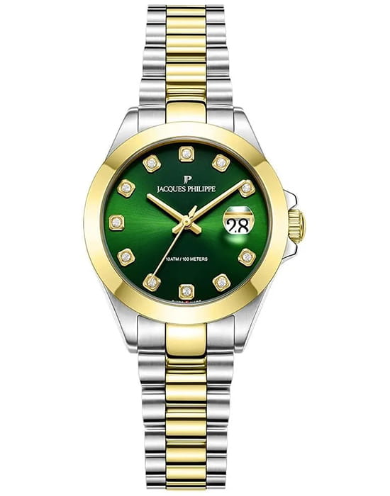 Часы Jacques Philippe JPQLS7373X8 из коллекции Infinitum — элегантные женские  часы, сочетающие в себе швейцарское качество и современный дизайн. Корпус диаметром 30 мм выполнен из нержавеющей стали, а зеленый циферблат защищён сапфировым стекломСапфировое стеклоПрочный и надёжный материал из кристалла сапфира синтетического происхождения, характеризующийся особой твёрдостью и устойчивостью к царапинам и повреждениям.. БезельБезельВнешний ободок, закрепляющий стекло. В спортивных часах так называется поворотное кольцо с делениями на циферблате, выполняет роль таймера – замеряет отрезки времени на шкале. Неподвижный безель – элемент декора. Однонаправленно вращающийся безель на дайверских часах позволяет фиксировать моменты погружения и выныривания на поверхность. с PVD-покрытиемPVDУльтратонкое покрытие наносится в технике вакуумного напыления, сочетает в себе нитрид титана особой прочности со слоем золота или оксида хрома. Несёт в себе декоративную или защитную функцию.. Циферблат инкрустирован кристаллами. Внутри установлен швейцарский кварцевый механизм, обеспечивающий высокую точность хода. Водозащита 100 метров (10 ATM) позволяет использовать часы для плавания и других водных видов спорта. Браслет из нержавеющей стали с PVD-покрытиемPVDУльтратонкое покрытие наносится в технике вакуумного напыления, сочетает в себе нитрид титана особой прочности со слоем золота или оксида хрома. Несёт в себе декоративную или защитную функцию. и застёжкой бабочкаЗастёжка "бабочка"Такой вид застёжки дополняется предохранителями, помогающими избежать случайного раскрытия браслета. Обладают изящным исполнением. обеспечивает комфортное ношение и надёжную фиксацию на запястье. Эти часы идеально подойдут для тех, кто ценит сочетание классического стиля и современных технологий.