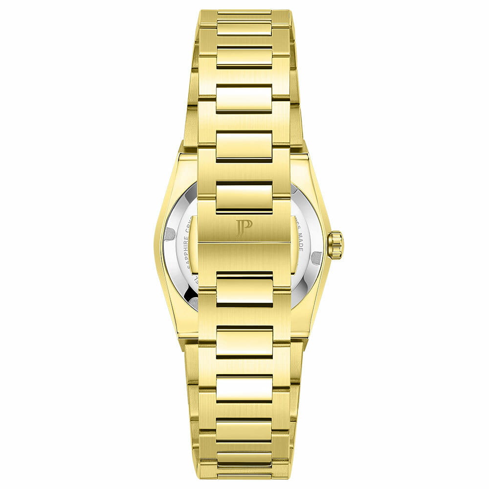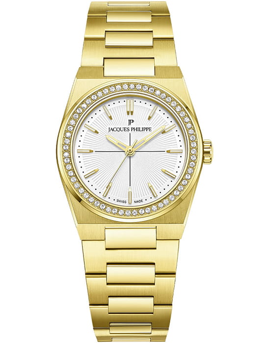 Часы Jacques Philippe JPQLS862324 из коллекции Adastra — элегантные женские часы, сочетающие швейцарское качество и современный дизайн. Корпус диаметром 30 мм выполнен из нержавеющей стали, а циферблат защищён сапфировым стекломСапфировое стеклоПрочный и надёжный материал из кристалла сапфира синтетического происхождения, характеризующийся особой твёрдостью и устойчивостью к царапинам и повреждениям.. БезельБезельВнешний ободок, закрепляющий стекло. В спортивных часах так называется поворотное кольцо с делениями на циферблате, выполняет роль таймера – замеряет отрезки времени на шкале. Неподвижный безель – элемент декора. Однонаправленно вращающийся безель на дайверских часах позволяет фиксировать моменты погружения и выныривания на поверхность. с PVD-покрытиемPVDУльтратонкое покрытие наносится в технике вакуумного напыления, сочетает в себе нитрид титана особой прочности со слоем золота или оксида хрома. Несёт в себе декоративную или защитную функцию. инкрустирован кристаллами.