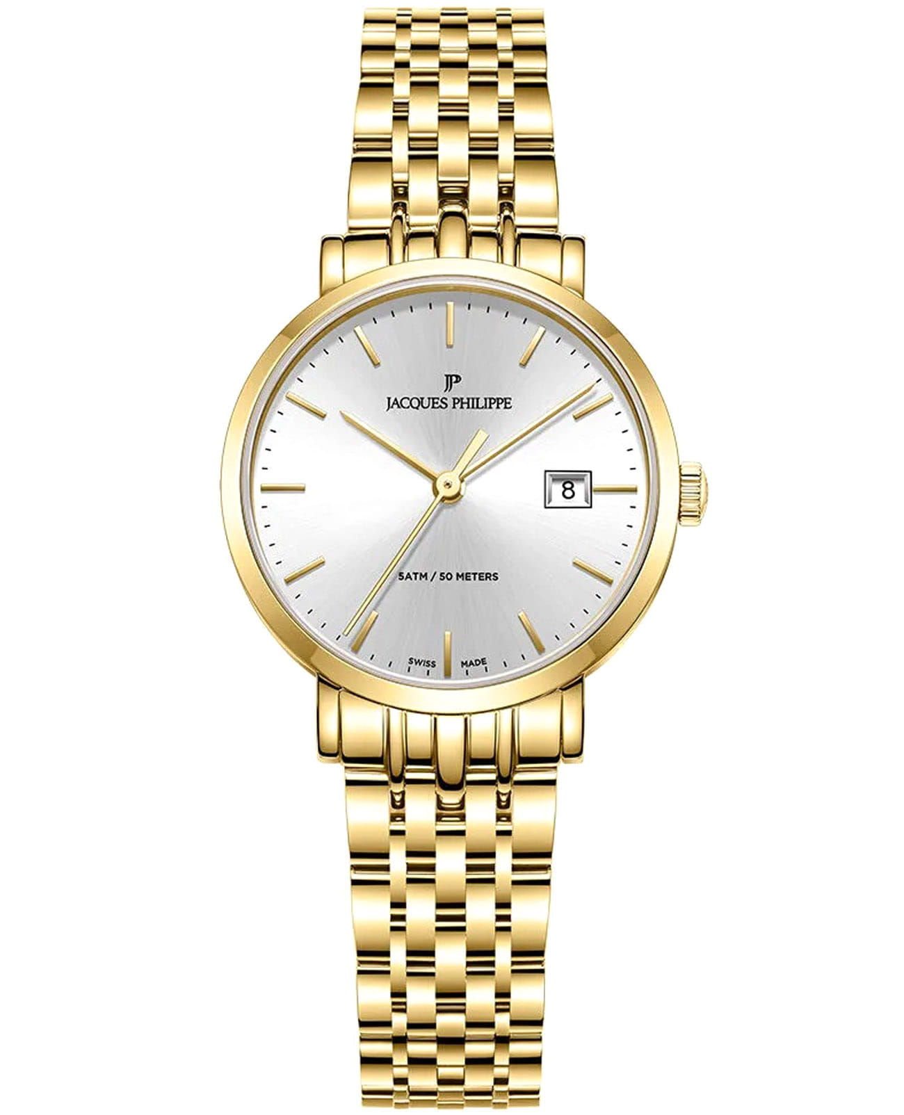 Швейцарские женские часы Jacques Philippe Ligata JPQLS942324 кварцевый механизм с высокой точностью. Прочное сапфировое стеклоСапфировое стеклоПрочный и надёжный материал из кристалла сапфира синтетического происхождения, характеризующийся особой твёрдостью и устойчивостью к царапинам и повреждениям. устойчивое к царапинам и механическим повреждениям. Циферблат серебристого цвета украшен классическими стрелками и метками, что гармонично дополняет общий дизайн модели. Элегантный корпус изготовлен из нержавеющей стали с IP-покрытиемIP-покрытиеМетод ионного напыления. Демонстрирует повышенную устойчивость к истиранию, окислению и химическим веществам. Под воздействием высокого давления и температуры около 1500°C молекулы металла надёжно соединяются с частицами корпуса часов. золотистого цвета, диаметром 29 мм, что делает их устойчивыми к внешним воздействиям и придает благородный вид. Стальной браслет с IP-покрытиемIP-покрытиеМетод ионного напыления. Демонстрирует повышенную устойчивость к истиранию, окислению и химическим веществам. Под воздействием высокого давления и температуры около 1500°C молекулы металла надёжно соединяются с частицами корпуса часов. на застёжке-бабочке с кнопкамиЗастёжка "бабочка"Такой вид застёжки дополняется предохранителями, помогающими избежать случайного раскрытия браслета. Обладают изящным исполнением. обеспечивает комфортное и безопасное ношение. Окошко даты находится в положении 3 часа. Класс водозащиты: 50 метров позволит защитить корпус от случайных брызг или капель дождя. Эти часы станут идеальным выбором для женщин, ценящих стиль, качество и функциональность и элегантность.