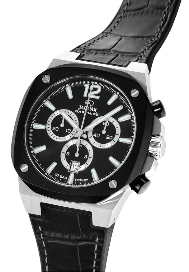 Мужские швейцарские часы Jaguar Rond Carre J1026/4 — это стильное сочетание элегантности и современного дизайна. Корпус из нержавеющей стали диаметром 43 мм идеально сбалансирован и элегантен. Сапфировое стеклоСапфировое стеклоПрочный и надёжный материал из кристалла сапфира синтетического происхождения, характеризующийся особой твёрдостью и устойчивостью к царапинам и повреждениям. с антибликовым покрытием защищает циферблат от царапин и обеспечивает отличную читаемость при любом освещении. Кожаный ремешок на застёжке-бабочке с кнопкамиЗастёжка "бабочка"Такой вид застёжки дополняется предохранителями, помогающими избежать случайного раскрытия браслета. Обладают изящным исполнением. идеально дополняют дизайн часов, обеспечивая комфортное ношение. Стрелки и метки на циферблате имеют люминесцентное покрытиеЛюминесцентное покрытиеПозволяет считывать показания времени в темноте. Производители наносят на стрелки, часовые индексы, безель или поверхность циферблата светонакопительный состав, дающий холодное свечение. позволяющее легко определять время даже в темноте. БезельБезельВнешний ободок, закрепляющий стекло. В спортивных часах так называется поворотное кольцо с делениями на циферблате, выполняет роль таймера – замеряет отрезки времени на шкале. Неподвижный безель – элемент декора. Однонаправленно вращающийся безель на дайверских часах позволяет фиксировать моменты погружения и выныривания на поверхность. с PVD-покрытиемPVDУльтратонкое покрытие наносится в технике вакуумного напыления, сочетает в себе нитрид титана особой прочности со слоем золота или оксида хрома. Несёт в себе декоративную или защитную функцию.. Часы обладают впечатляющей водонепроницаемостью до 10 бар (100 метров), что делает их идеальными для плавания, ныряния и погружений с аквалангом. В часах есть функция хронографаХронографФункция позволяет измерять отрезки времени с особой точностью: часы, минуты, секунды. Верным признаком хронографа является наличие на циферблате 3 дополнительных окошек-счётчиков., с помощью которой вы сможете измерять время с высокой точностью.