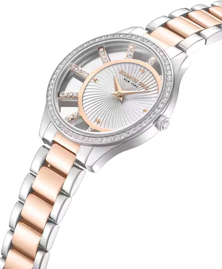 Женские кварцевые часы Kenneth Cole — это элегантный и выразительный аксессуар. Корпус диаметром 36 мм выполнен из нержавеющей стали 316L. Циферблат серебристого гильошированного цвета оформлен точками и украшен цирконами. БезельБезельВнешний ободок, закрепляющий стекло. В спортивных часах так называется поворотное кольцо с делениями на циферблате, выполняет роль таймера – замеряет отрезки времени на шкале. Неподвижный безель – элемент декора. Однонаправленно вращающийся безель на дайверских часах позволяет фиксировать моменты погружения и выныривания на поверхность. инкрустирован кристаллами, придавая изделию особое сияние. Циферблат защищён выпуклым минеральным стекломМинеральное стеклоМинеральное стекло представляет собой искусственно выращенный минерал кварца. Такое стекло отличается особой устойчивостью к повреждениям и царапинам. Уступает по некоторым качествам сапфировому стеклу.. Часы оснащены стальным браслетом с частичным IP-покрытиемIP-покрытиеМетод ионного напыления. Демонстрирует повышенную устойчивость к истиранию, окислению и химическим веществам. Под воздействием высокого давления и температуры около 1500°C молекулы металла надёжно соединяются с частицами корпуса часов. цвета розового золота на раскладной застёжкеРаскладная застёжкаТакой тип застёжки используется только на браслетах из металла. Она никогда не раскрывается полностью, происходит разделение на 2 и более частей. Раскладывающая застёжка снизит вероятность потери часов к минимуму.. Водонепроницаемость 30 м позволяет использовать часы в повседневных условиях. Идеальный выбор для тех, кто ценит стиль, блеск и американское качество.