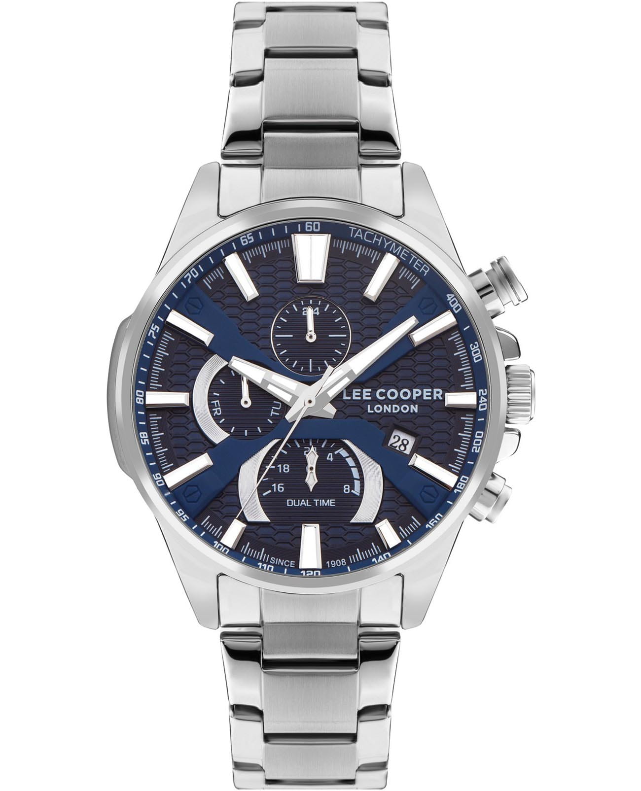 Мужские часы Lee Cooper LC07801.390 выполнены в классическом стиле и сочетают строгий дизайн с расширенным функционалом. Модель оснащена кварцевым механизмом, обеспечивающим точность хода и минимальное обслуживание. Корпус круглой формы имеет размер 46 мм, изготовлен из суперметалла. Циферблат синего цвета дополнен индексами для чёткого отсчёта времени, а также украшен серебристыми стрелками и метками с люминесцентным покрытиемЛюминесцентное покрытиеПозволяет считывать показания времени в темноте. Производители наносят на стрелки, часовые индексы, безель или поверхность циферблата светонакопительный состав, дающий холодное свечение., гармонично дополняющим общий дизайн модели. Часы оснащены функциями отображения даты, дня недели, 24-часового индикатора и второго часового поясаВторой часовой поясФункция, позволяющая отображать время двух часовых поясов одновременно., что делает их особенно удобными для повседневного использования. Защиту циферблата обеспечивает минеральное стеклоМинеральное стеклоМинеральное стекло представляет собой искусственно выращенный минерал кварца. Такое стекло отличается особой устойчивостью к повреждениям и царапинам. Уступает по некоторым качествам сапфировому стеклу., устойчивое к мелким механическим повреждениям. Браслет из стали оснащен раскладной застёжкойРаскладная застёжкаТакой тип застёжки используется только на браслетах из металла. Она никогда не раскрывается полностью, происходит разделение на 2 и более частей. Раскладывающая застёжка снизит вероятность потери часов к минимуму., обеспечивающим комфортное и безопасное ношение. Водозащита 5 АТМ позволяет использовать часы в условиях случайного контакта с водой — например, при мытье рук или под дождём. Это сочетание классического дизайна, прочности материалов и широкой функциональности для уверенных в себе мужчин.