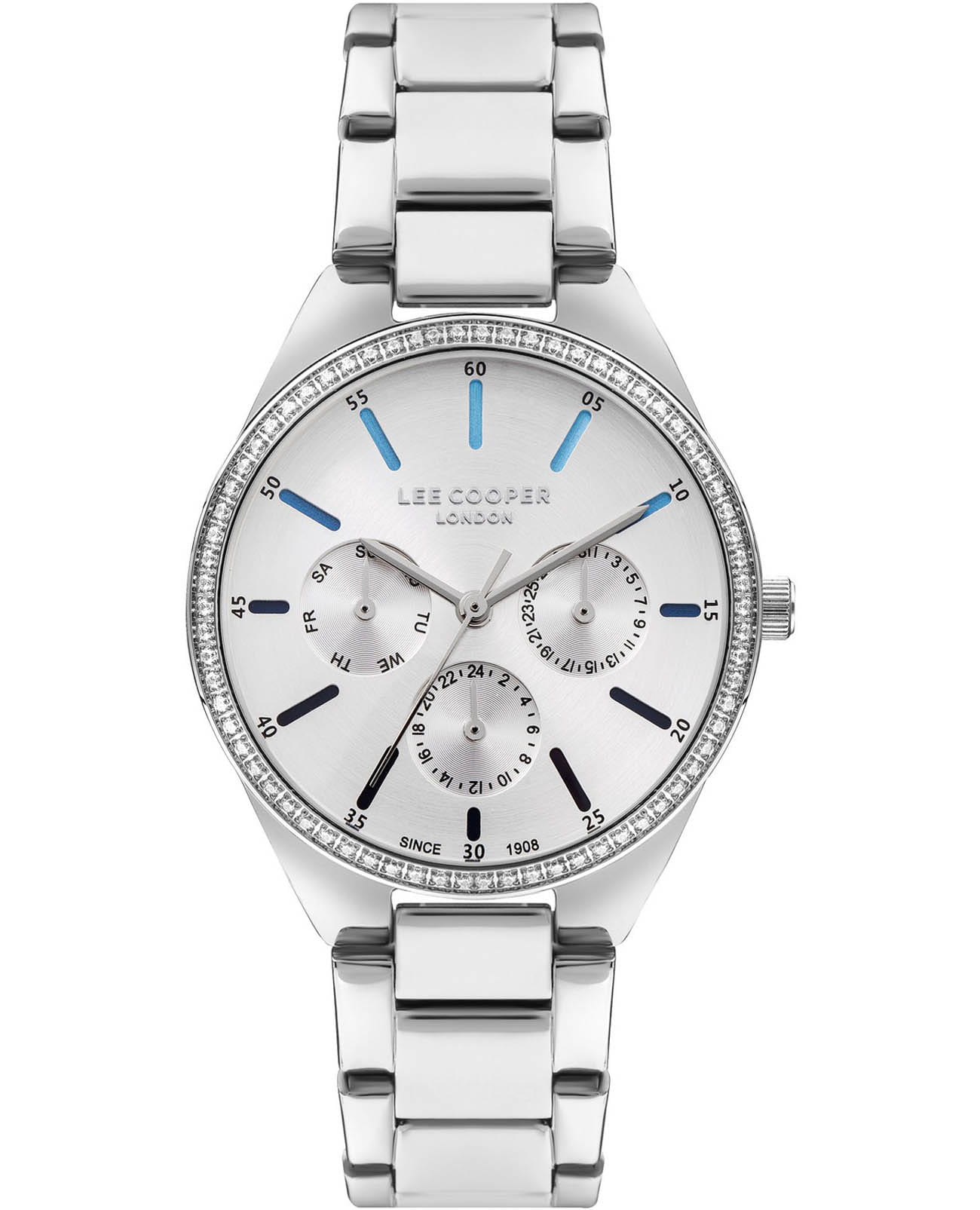 Женские часы Lee Cooper LC07863.390 — это стильное сочетание элегантности и современного дизайна. Круглый корпус диаметром 34 мм выполнен из суперметалла, а неподвижный безельБезельВнешний ободок, закрепляющий стекло. В спортивных часах так называется поворотное кольцо с делениями на циферблате, выполняет роль таймера – замеряет отрезки времени на шкале. Неподвижный безель – элемент декора. Однонаправленно вращающийся безель на дайверских часах позволяет фиксировать моменты погружения и выныривания на поверхность. украшен цирконами, придающими модели особый блеск. Серебристый циферблат защищен минеральным стекломМинеральное стеклоМинеральное стекло представляет собой искусственно выращенный минерал кварца. Такое стекло отличается особой устойчивостью к повреждениям и царапинам. Уступает по некоторым качествам сапфировому стеклу., обеспечивающим устойчивость к царапинам. Метки в виде штрихов. Часы оснащены надежным кварцевым механизмом, а металлический браслет на раскладной застёжкеРаскладная застёжкаТакой тип застёжки используется только на браслетах из металла. Она никогда не раскрывается полностью, происходит разделение на 2 и более частей. Раскладывающая застёжка снизит вероятность потери часов к минимуму. гарантирует комфортную посадку на запястье. Мультифункциональная модель с индикацией даты, дня недели, с дополнительным 24-х часовым индикатором. Водозащита 30 метров защищает модель от случайных брызг и дождя. Lee Cooper  — отличный выбор для тех, кто ценит утонченность и качество.
