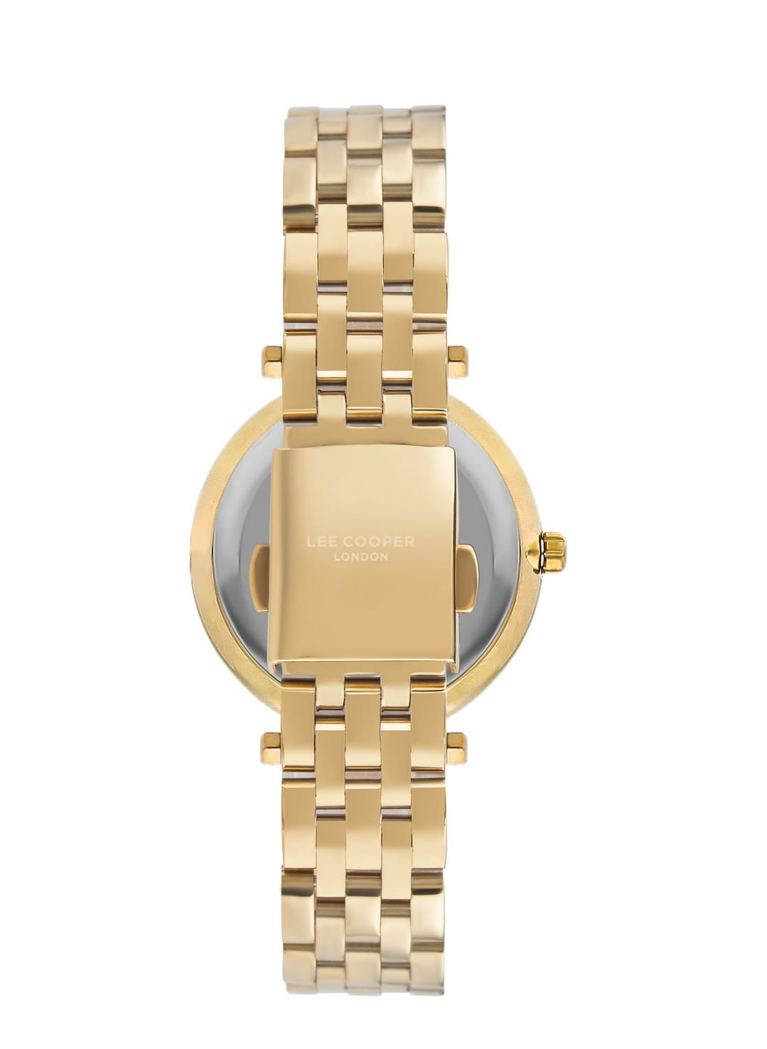 Женские часы Lee Cooper LC07864.160 — это стильное сочетание элегантности и современного дизайна. Круглый корпус диаметром 34 мм выполнен из суперметалла с IP-покрытиемIP-покрытиеМетод ионного напыления. Демонстрирует повышенную устойчивость к истиранию, окислению и химическим веществам. Под воздействием высокого давления и температуры около 1500°C молекулы металла надёжно соединяются с частицами корпуса часов., а неподвижный безельБезельВнешний ободок, закрепляющий стекло. В спортивных часах так называется поворотное кольцо с делениями на циферблате, выполняет роль таймера – замеряет отрезки времени на шкале. Неподвижный безель – элемент декора. Однонаправленно вращающийся безель на дайверских часах позволяет фиксировать моменты погружения и выныривания на поверхность. инкрустирован 140 фианитами, придающими модели особый блеск. Изящный циферблат защищен минеральным стекломМинеральное стеклоМинеральное стекло представляет собой искусственно выращенный минерал кварца. Такое стекло отличается особой устойчивостью к повреждениям и царапинам. Уступает по некоторым качествам сапфировому стеклу., обеспечивающим устойчивость к царапинам. Метки в виде штрихов. Часы оснащены надежным кварцевым механизмом, а стальной браслет с IP-покрытиемIP-покрытиеМетод ионного напыления. Демонстрирует повышенную устойчивость к истиранию, окислению и химическим веществам. Под воздействием высокого давления и температуры около 1500°C молекулы металла надёжно соединяются с частицами корпуса часов. на раскладной застёжкеРаскладная застёжкаТакой тип застёжки используется только на браслетах из металла. Она никогда не раскрывается полностью, происходит разделение на 2 и более частей. Раскладывающая застёжка снизит вероятность потери часов к минимуму. гарантирует комфортную посадку на запястье. Водозащита 30 метров защищает модель от случайных брызг и дождя. Lee Cooper  — отличный выбор для тех, кто ценит утонченность и качество.