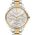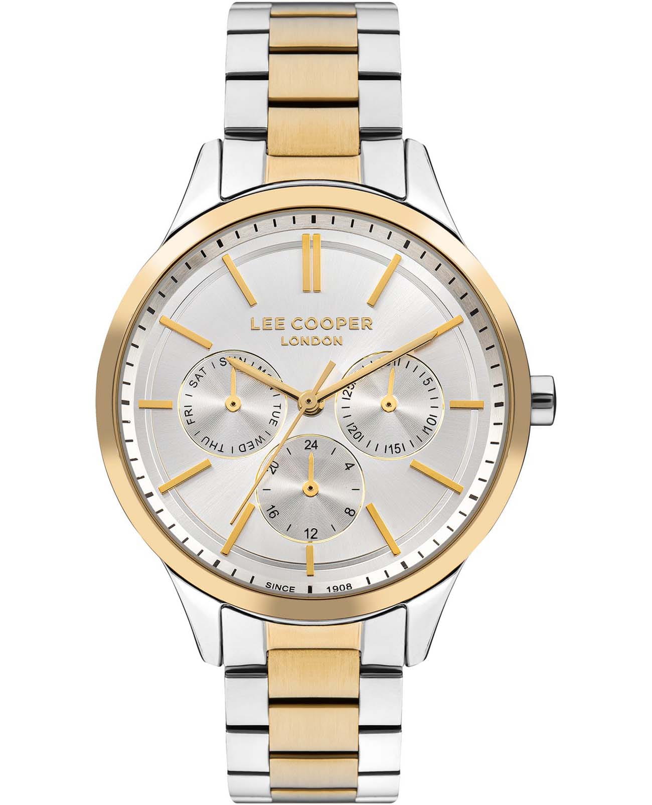 Женские часы Lee Cooper LC07865.230 — это стильное сочетание элегантности и современного дизайна. Круглый корпус диаметром 38 мм выполнен из суперметалла с  безелемБезельВнешний ободок, закрепляющий стекло. В спортивных часах так называется поворотное кольцо с делениями на циферблате, выполняет роль таймера – замеряет отрезки времени на шкале. Неподвижный безель – элемент декора. Однонаправленно вращающийся безель на дайверских часах позволяет фиксировать моменты погружения и выныривания на поверхность. с IP-покрытиемIP-покрытиеМетод ионного напыления. Демонстрирует повышенную устойчивость к истиранию, окислению и химическим веществам. Под воздействием высокого давления и температуры около 1500°C молекулы металла надёжно соединяются с частицами корпуса часов. золотого цвета, придающий модели особый блеск. Серебристый циферблат защищен минеральным стекломМинеральное стеклоМинеральное стекло представляет собой искусственно выращенный минерал кварца. Такое стекло отличается особой устойчивостью к повреждениям и царапинам. Уступает по некоторым качествам сапфировому стеклу., обеспечивающим устойчивость к царапинам. Часы оснащены надежным кварцевым механизмом, а стальной браслет с частичным IP-покрытиемIP-покрытиеМетод ионного напыления. Демонстрирует повышенную устойчивость к истиранию, окислению и химическим веществам. Под воздействием высокого давления и температуры около 1500°C молекулы металла надёжно соединяются с частицами корпуса часов. на раскладной застёжкеРаскладная застёжкаТакой тип застёжки используется только на браслетах из металла. Она никогда не раскрывается полностью, происходит разделение на 2 и более частей. Раскладывающая застёжка снизит вероятность потери часов к минимуму. гарантирует комфортную посадку на запястье. Мультифункциональная модель с индикацией даты, дня недели, с дополнительным 24-х часовым индикатором. Водозащита 30 метров защищает модель от случайных брызг и дождя. Lee Cooper  — отличный выбор для тех, кто ценит утонченность и качество.