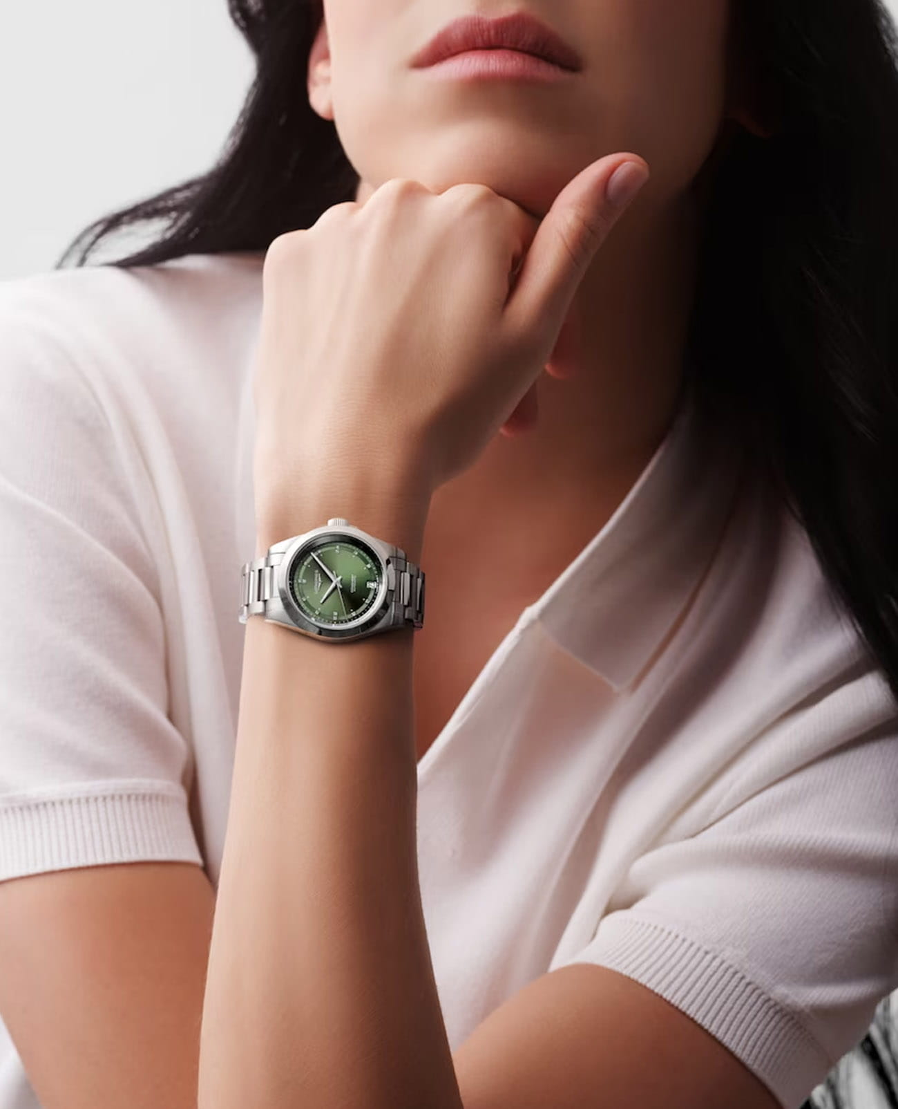 Женские швейцарские механические часы с автоподзаводом Longines Conquest L3.430.4.07.6. Сапфировое стеклоСапфировое стеклоПрочный и надёжный материал из кристалла сапфира синтетического происхождения, характеризующийся особой твёрдостью и устойчивостью к царапинам и повреждениям. устойчивое к появлению царапин, обладающее высокой прозрачностью. Корпус часов изготовлен из нержавеющей стали. Циферблат выполнен по технологии Sunray (солнечные лучи). Циферблат с 14 бриллиантами группы Top Wesselton VS-SI общим весом 0.035 карата. Стрелки с люминесцентным покрытиемЛюминесцентное покрытиеПозволяет считывать показания времени в темноте. Производители наносят на стрелки, часовые индексы, безель или поверхность циферблата светонакопительный состав, дающий холодное свечение.. Окошко даты в положении 6 часов. Прозрачная задняя крышка. Класс водозащиты: 100 метров, позволит плавать, нырять и заниматься другими водными видами спорта. Стальной браслет на раскладной застёжкеРаскладная застёжкаТакой тип застёжки используется только на браслетах из металла. Она никогда не раскрывается полностью, происходит разделение на 2 и более частей. Раскладывающая застёжка снизит вероятность потери часов к минимуму..