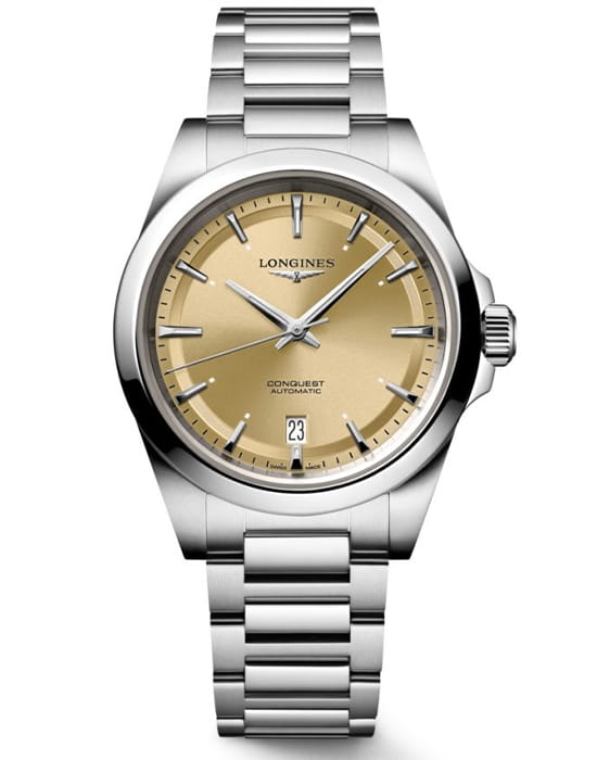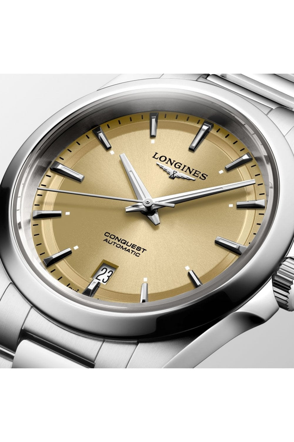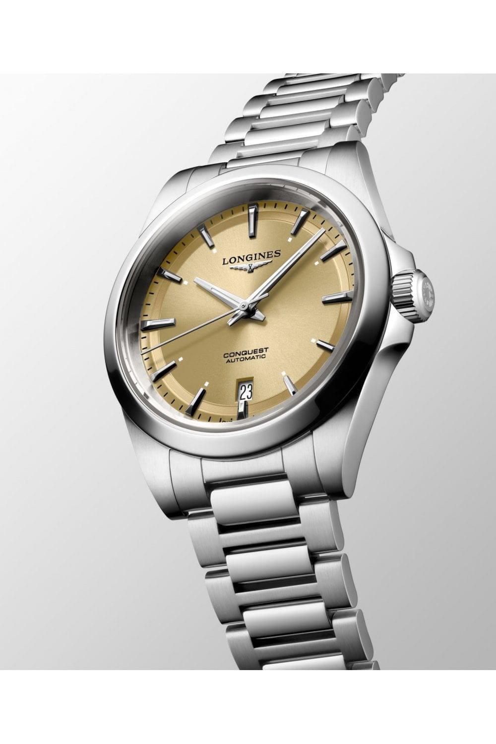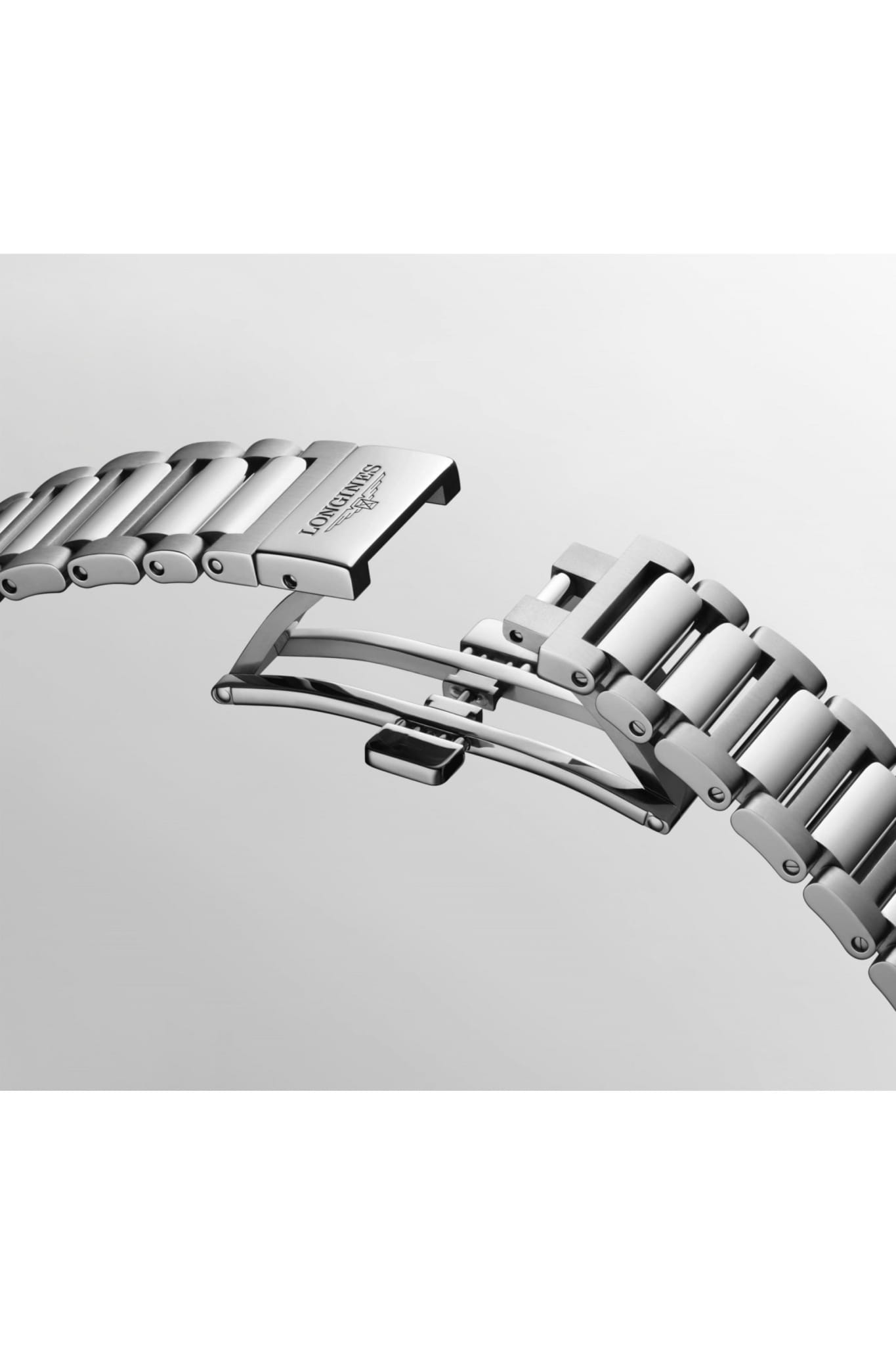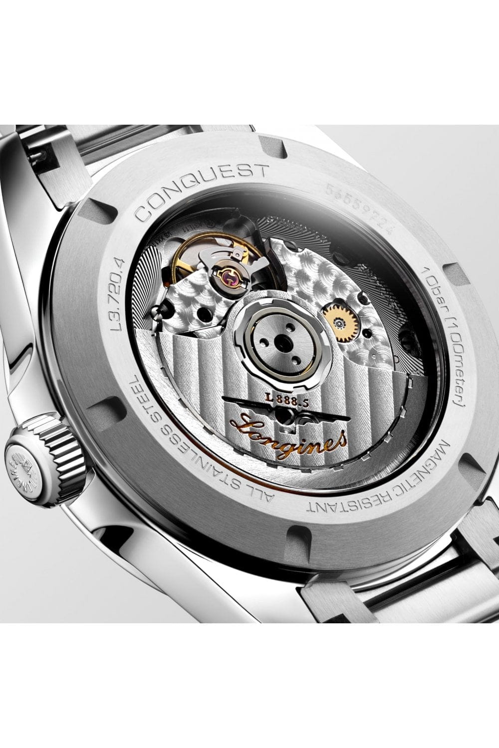 Женские швейцарские механические часы с автоподзаводом Longines Conquest L3.720.4.62.6. Сапфировое стеклоСапфировое стеклоПрочный и надёжный материал из кристалла сапфира синтетического происхождения, характеризующийся особой твёрдостью и устойчивостью к царапинам и повреждениям. устойчивое к появлению царапин, обладающее высокой прозрачностью. Корпус часов изготовлен из нержавеющей стали. Циферблат выполнен по технологии Sunray (солнечные лучи). Стрелки с люминесцентным покрытиемЛюминесцентное покрытиеПозволяет считывать показания времени в темноте. Производители наносят на стрелки, часовые индексы, безель или поверхность циферблата светонакопительный состав, дающий холодное свечение.. Окошко даты в положении 6 часов. Прозрачная задняя крышка. Класс водозащиты: 100 метров, позволит плавать, нырять и заниматься другими водными видами спорта. Стальной браслет на застёжке-бабочке с кнопкамиЗастёжка "бабочка"Такой вид застёжки дополняется предохранителями, помогающими избежать случайного раскрытия браслета. Обладают изящным исполнением. .