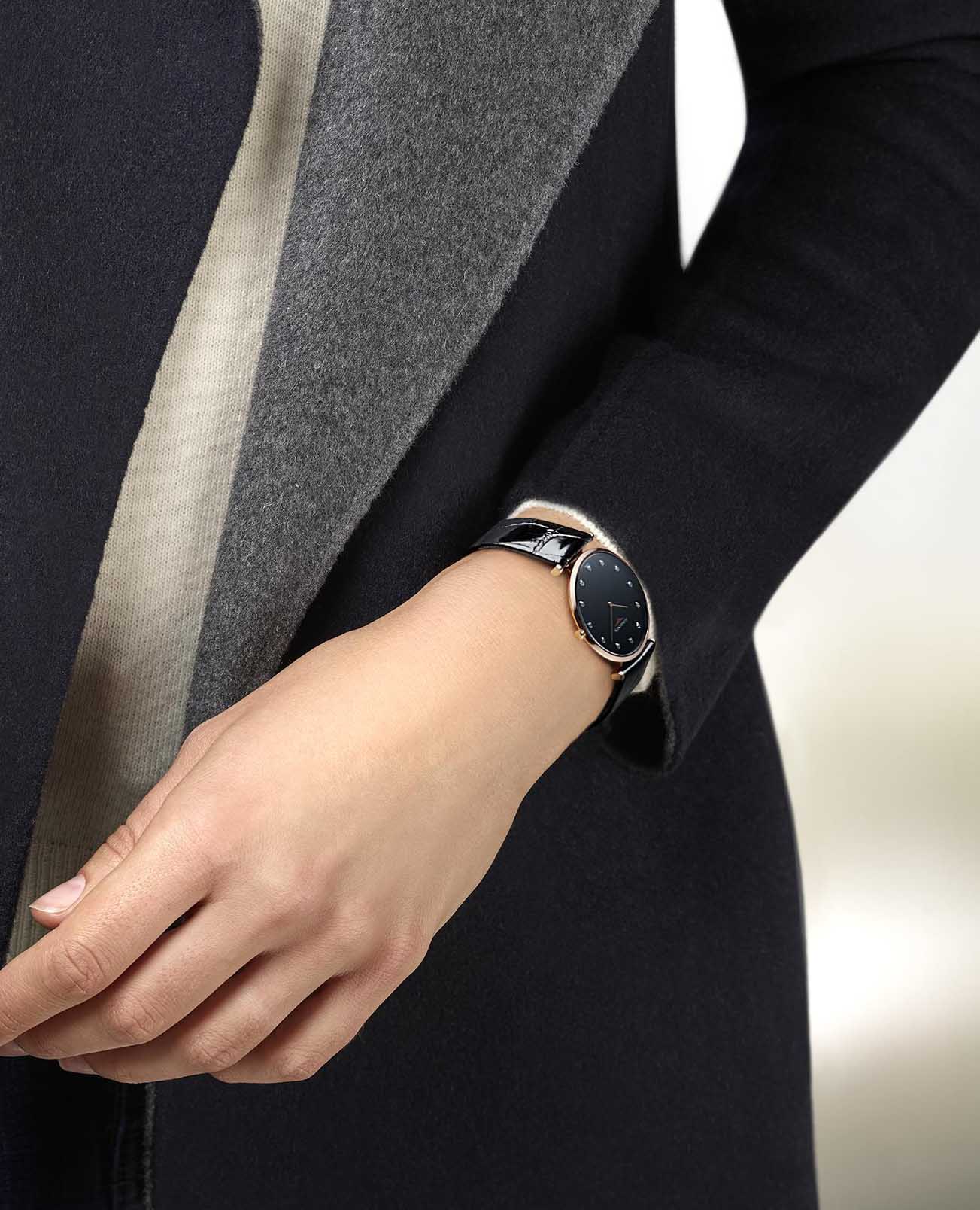 Компактный чёрный циферблат украшен 12 бриллиантами общим весом 0,081 карата. Элегантным дополнением стал ремешок из кожи аллигатора.PVD-покрытиеPVDУльтратонкое покрытие наносится в технике вакуумного напыления, сочетает в себе нитрид титана особой прочности со слоем золота или оксида хрома. Несёт в себе декоративную или защитную функцию. устойчиво к царапинам и износу. Швейцарский кварцевый калибр L420 обеспечивает высокую точность хода. Сапфировое стекло не допускает появления царапин на поверхности.