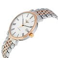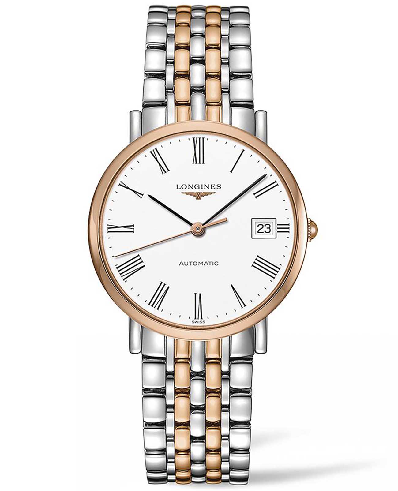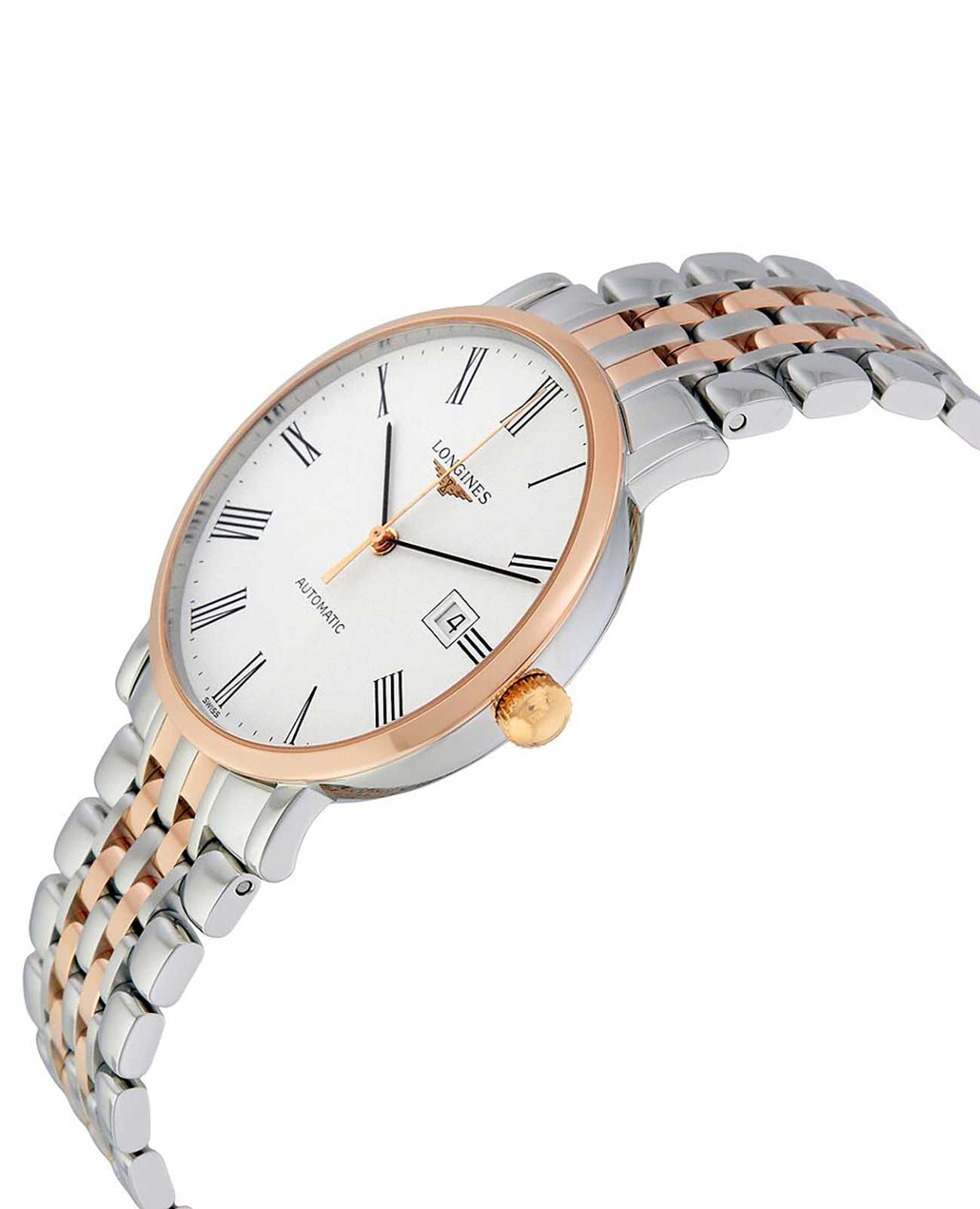 Мужские швейцарские часы Longines Longines Elegant Collection L4.810.5.11.7 – образец классического стиля. Белый матовый циферблат дополнен контрастными стрелками и римскими цифрами. Корпус выполнен из нержавеющей стали 316L и 18 каратного розового золота18-каратное золотоОбозначение по каратной системе пробирования, оно показывает, сколько драгоценного металла содержится в изделии. 18 карат - в составе 75% чистого золота, соответствует 750 пробе.