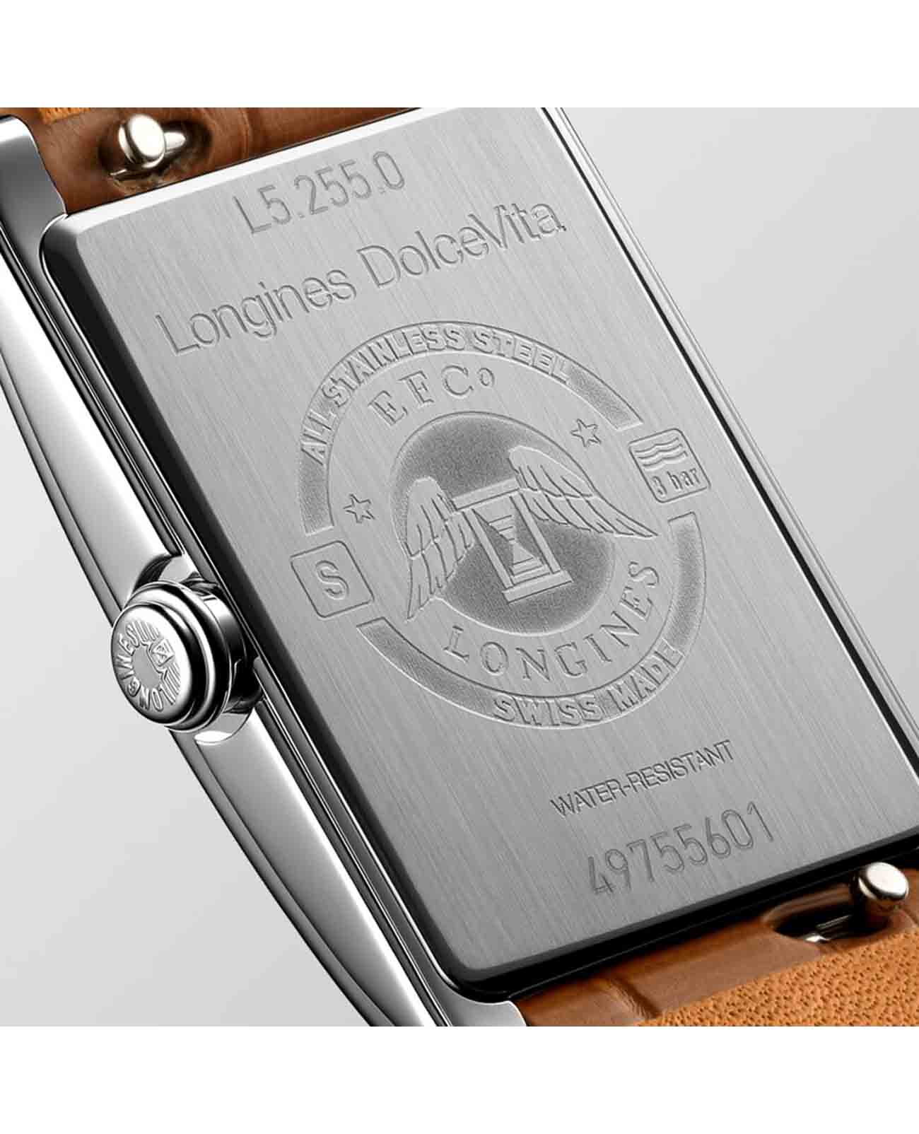 Женские швейцарские часы Longines DolceVita L5.255.0.71.4, кварцевый механизм с высокой точностью. Сапфировое стеклоСапфировое стеклоПрочный и надёжный материал из кристалла сапфира синтетического происхождения, характеризующийся особой твёрдостью и устойчивостью к царапинам и повреждениям. устойчивое к появлению царапин, обладающее высокой прозрачностью. Корпусиз нержавеющей стали с 46 бриллиантами группы Top Wesselton IF-VVS общим весом 0.386 карата. Циферблат украшен римскими цифрами. Малая секундная стрелка в положении 6 часов. Класс водозащиты: 30 метров, позволит защитить корпус от случайных брызг или капель дождя. Ремешок из кожи аллигатора на стандартной застежке.