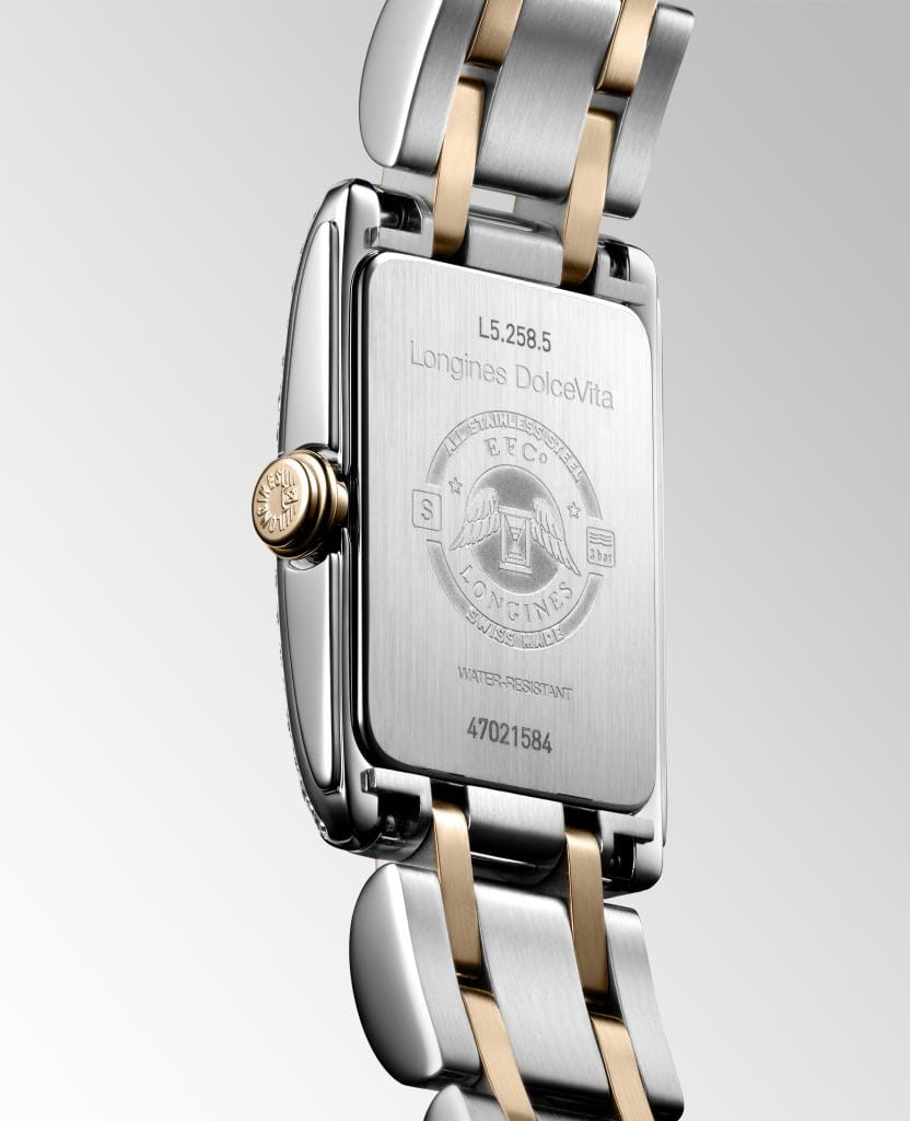 Женские швейцарские часы Longines DolceVita L5.258.5.79.7, кварцевый механизм с высокой точностью. Сапфировое стеклоСапфировое стеклоПрочный и надёжный материал из кристалла сапфира синтетического происхождения, характеризующийся особой твёрдостью и устойчивостью к царапинам и повреждениям. устойчивое к появлению царапин, обладающее высокой прозрачностью. Корпус с 36 бриллиантами группы Top Wesselton IF-VVS общим весом 0.280 карата. Класс водозащиты: 30 метров, позволит защитить корпус от случайных брызг или капель дождя. Браслет из нержавеющей стали и 18-каратного золота18-каратное золотоОбозначение по каратной системе пробирования, оно показывает, сколько драгоценного металла содержится в изделии. 18 карат - в составе 75% чистого золота, соответствует 750 пробе.