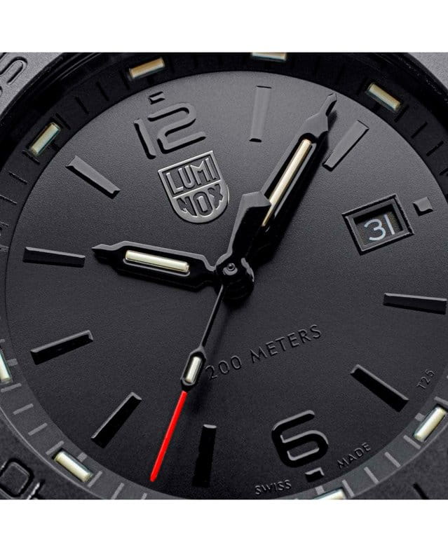 Мужские наручные часы Luminox XS.3121.BO.1 из коллекции Pacific Diver сочетают в себе спортивный дизайн и надежность швейцарского качества . Модель обладает круглым корпусом диаметром 44 мм, изготовленным из нержавеющей стали с PVD-покрытиемPVDУльтратонкое покрытие наносится в технике вакуумного напыления, сочетает в себе нитрид титана особой прочности со слоем золота или оксида хрома. Несёт в себе декоративную или защитную функцию., что обеспечивает высокую устойчивость к внешним воздействиям и долговечность . Циферблат черного цвета украшен контрастными метками и стрелками с люминесцентным покрытиемЛюминесцентное покрытиеПозволяет считывать показания времени в темноте. Производители наносят на стрелки, часовые индексы, безель или поверхность циферблата светонакопительный состав, дающий холодное свечение., гарантирующим постоянную видимость времени даже в условиях низкой освещенности благодаря системе LLTLLTLLT — это автономный механизм подсветки, основанный на использовании микроскопических газонаполненных элементов. Специальные герметичные капсулы из боросиликатного стекла, интегрированные в циферблат, генерируют свечение без необходимости подключения к внешним источникам энергии. Для их работы не требуется ни дополнительный свет, ни механическое воздействие (например, нажатие кнопки). Свечение возникает благодаря химическому процессу: реакция между тритием, заключенным в капсулах, и люминофорным покрытием создает стабильное автономное освещение. Технология обеспечивает энергетическую независимость и долговечность подсветки. (микрогазовые огни) . Часы оснащены кварцевым механизмом швейцарского производства Ronda 515, обеспечивающим точность хода ±15 секунд в месяц . Защиту циферблата обеспечивает прочное сапфировое стеклоСапфировое стеклоПрочный и надёжный материал из кристалла сапфира синтетического происхождения, характеризующийся особой твёрдостью и устойчивостью к царапинам и повреждениям. с антибликовым покрытиемАнтибликовое покрытиеСлой оксида металла в 0,13-0,3 микрон, благодаря которому стекло часов не бликует и не отражает свет. Антибликовое покрытие уменьшает отражение света в 10 раз, обеспечивая отличную читаемость показателей циферблата., устойчивое к царапинам и механическим повреждениям. Водонепроницаемость модели достигает 20 атмосфер (200 метров), что делает их подходящими для плавания и активного отдыха на воде, включая дайвинг . Модель также оснащена безелемБезельВнешний ободок, закрепляющий стекло. В спортивных часах так называется поворотное кольцо с делениями на циферблате, выполняет роль таймера – замеряет отрезки времени на шкале. Неподвижный безель – элемент декора. Однонаправленно вращающийся безель на дайверских часах позволяет фиксировать моменты погружения и выныривания на поверхность. из карбонаКарбонОт «carbon», «carbone» - углерод, углепластик - полимерный композиционный материал из переплетённых под определенным углом между собой нитей углеродного волокна, применяется для изготовления лёгких, но прочных деталей. В часах часто используют для украшения циферблатов и ремешков. Так же карбон используется в изготовлении корпусов. Такие корпуса обладают антикоррозионным свойством, не поддаются электромагнитному излучению, обладают повышенной прочностью и противоударностью. (CARBONOX™
