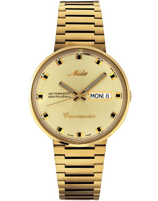 Циферблат с фирменным логотипом Mido 1950-х годов украшен накладными индексами и стрелками  с люминесцентным покрытиемЛюминесцентное покрытиеПозволяет считывать показания времени в темноте. Производители наносят на стрелки, часовые индексы, безель или поверхность циферблата светонакопительный состав, дающий холодное свечение., обеспечивающим читаемость даже в условиях слабого освещения. На «3 часах» расположено двойное окошко календаря — день недели и дата. Стальной браслет с PVD-покрытиемPVDУльтратонкое покрытие наносится в технике вакуумного напыления, сочетает в себе нитрид титана особой прочности со слоем золота или оксида хрома. Несёт в себе декоративную или защитную функцию. на раскладной застёжкеРаскладная застёжкаТакой тип застёжки используется только на браслетах из металла. Она никогда не раскрывается полностью, происходит разделение на 2 и более частей. Раскладывающая застёжка снизит вероятность потери часов к минимуму..
