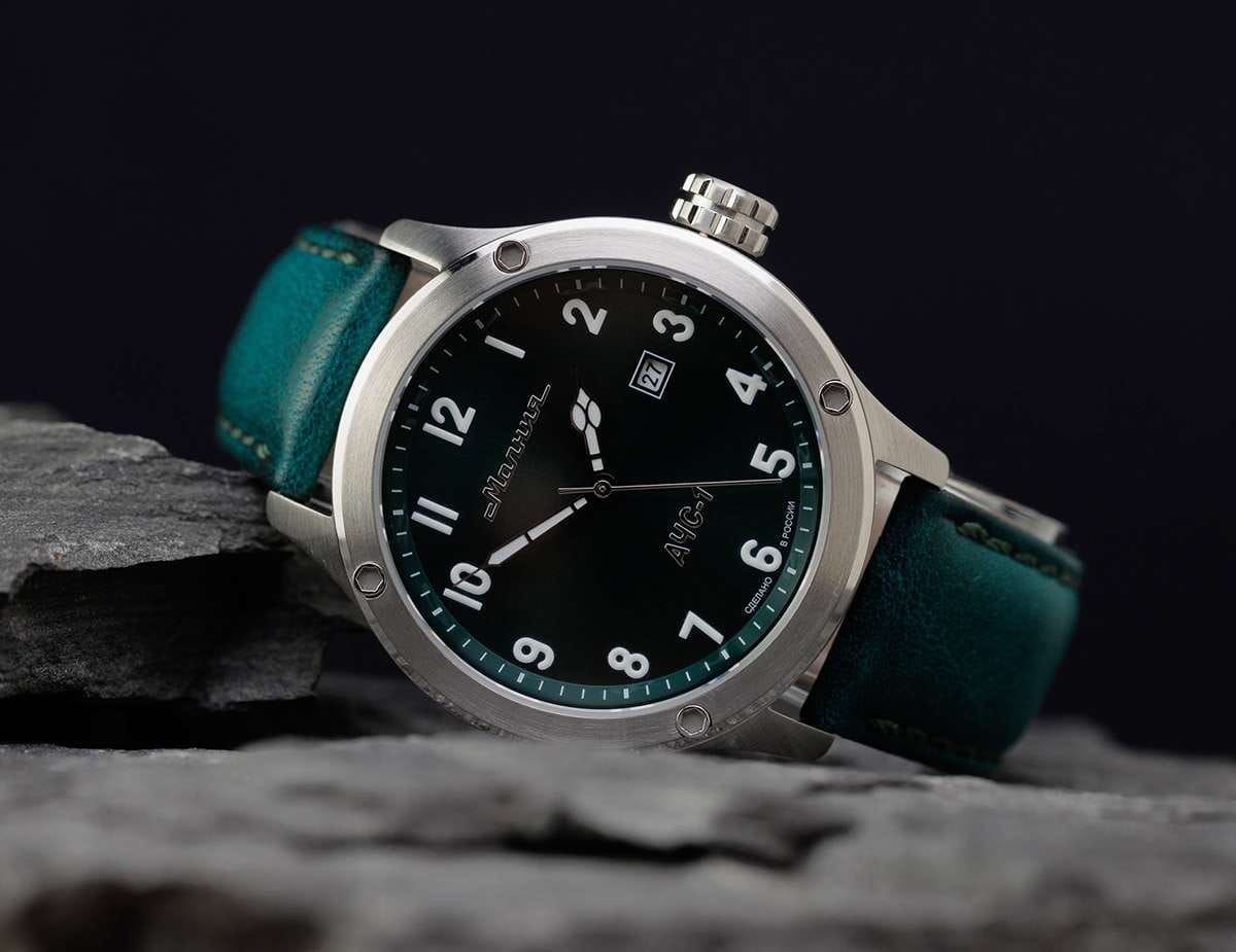 Мужские механические часы с автоподзаводом — это надёжный аксессуар от легендарного бренда «МОЛНИЯ», созданного на Челябинском часовом заводе. Корпус диаметром 44 мм и высотой 12 мм выполнен из нержавеющей стали 316L с матовой полировкой. БезельБезельВнешний ободок, закрепляющий стекло. В спортивных часах так называется поворотное кольцо с делениями на циферблате, выполняет роль таймера – замеряет отрезки времени на шкале. Неподвижный безель – элемент декора. Однонаправленно вращающийся безель на дайверских часах позволяет фиксировать моменты погружения и выныривания на поверхность. также выполнен из стали с матовой отделкой. Циферблат зелёного цвета матовый, оформлен стрелками и индексами с люминесцентным покрытиемЛюминесцентное покрытиеПозволяет считывать показания времени в темноте. Производители наносят на стрелки, часовые индексы, безель или поверхность циферблата светонакопительный состав, дающий холодное свечение. Super-LumiNova. Окошко даты расположено в положении 3 часов. Циферблат защищён сапфировым стекломСапфировое стеклоПрочный и надёжный материал из кристалла сапфира синтетического происхождения, характеризующийся особой твёрдостью и устойчивостью к царапинам и повреждениям. толщиной 1,5 мм. Механизм — японский автоматический калибр Miyota 8215 с функцией и запасом хода 42 часа. Часы оснащены кожаным ремешком зелёного цвета шириной 22 мм с классической пряжкой. Водонепроницаемость 100 м позволяет использовать часы для плавания и повседневного ношения. Идеальный выбор для тех, кто ценит российское качество и мужественный дизайн.
