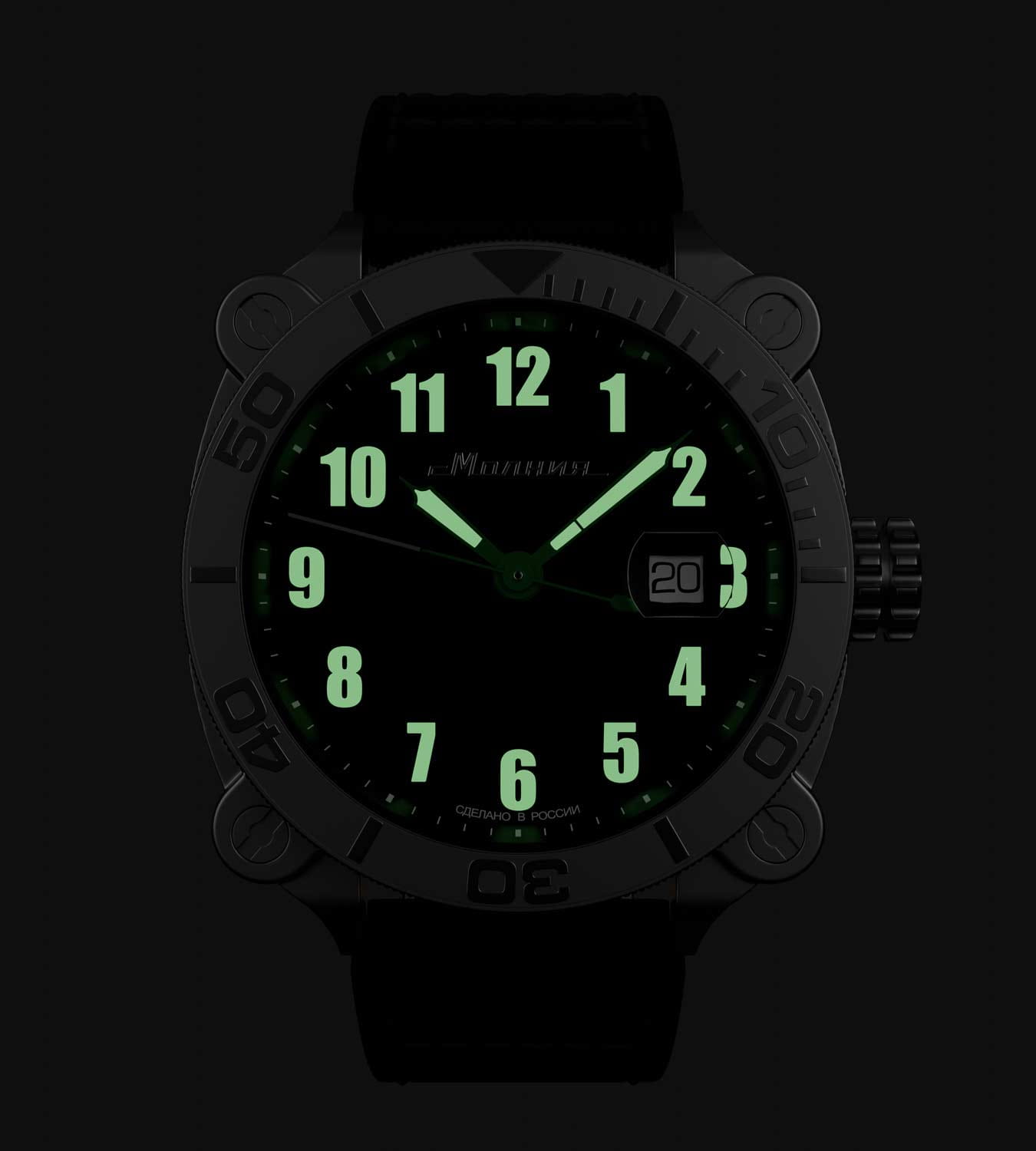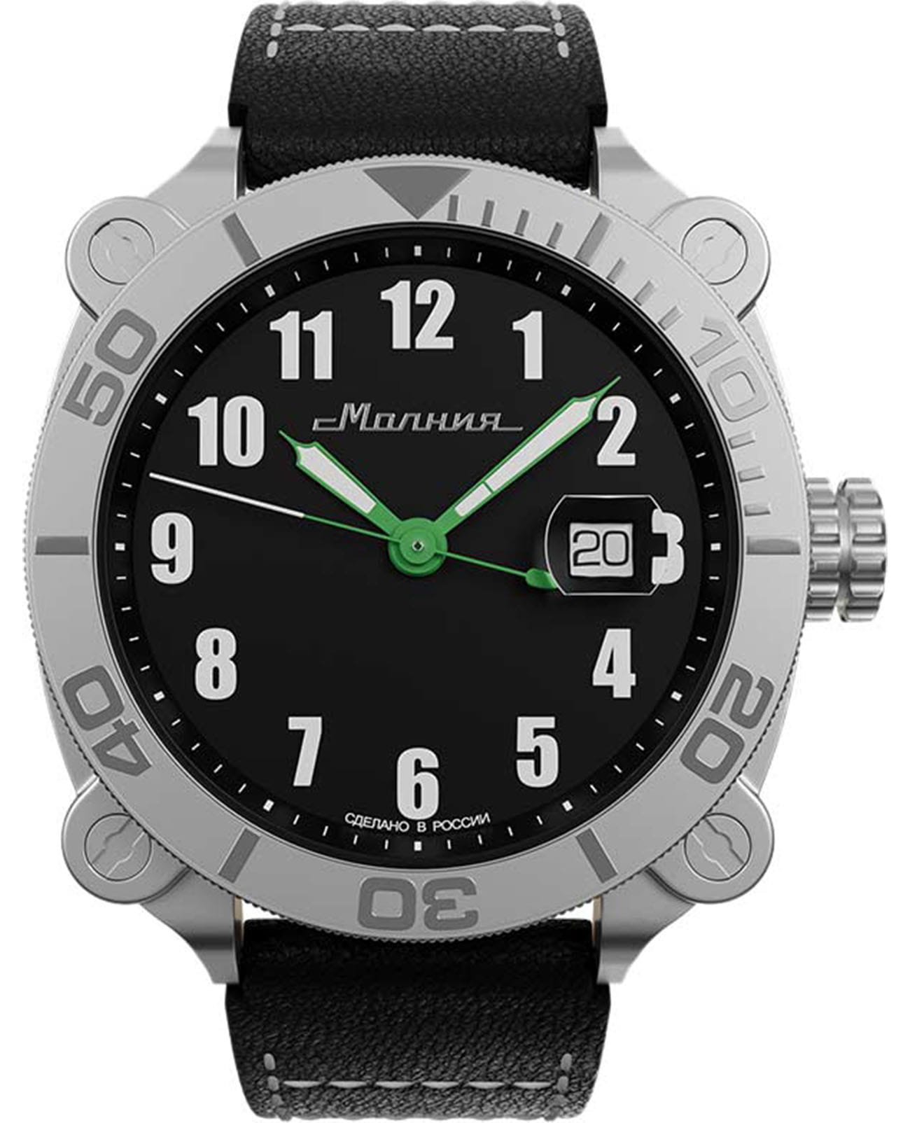 Мужские механические часы с автоподзаводом от бренда «МОЛНИЯ» — это стильный аксессуар, вдохновлённый дизайном приборной панели легендарного танка Т-72. Корпус диаметром 42 мм и толщиной 12 мм выполнен из нержавеющей стали 316L с матовой полировкой. БезельБезельВнешний ободок, закрепляющий стекло. В спортивных часах так называется поворотное кольцо с делениями на циферблате, выполняет роль таймера – замеряет отрезки времени на шкале. Неподвижный безель – элемент декора. Однонаправленно вращающийся безель на дайверских часах позволяет фиксировать моменты погружения и выныривания на поверхность. однонаправленный, вращающийся. Циферблат чёрного цвета оформлен арабскими цифрами и логотипом бренда. Окошко даты расположено в положении 3 часов и оснащено увеличительным стеклом. Стрелки и метки с люминесцентным покрытиемЛюминесцентное покрытиеПозволяет считывать показания времени в темноте. Производители наносят на стрелки, часовые индексы, безель или поверхность циферблата светонакопительный состав, дающий холодное свечение. Super-LumiNova. Циферблат защищён сапфировым стекломСапфировое стеклоПрочный и надёжный материал из кристалла сапфира синтетического происхождения, характеризующийся особой твёрдостью и устойчивостью к царапинам и повреждениям. с антибликовым покрытиемАнтибликовое покрытиеСлой оксида металла в 0,13-0,3 микрон, благодаря которому стекло часов не бликует и не отражает свет. Антибликовое покрытие уменьшает отражение света в 10 раз, обеспечивая отличную читаемость показателей циферблата.. Механизм — японский автоматический калибр Miyota 8215 запас хода до 42 часов. Заводная головка стилизована под гусеничную ленту, задняя крышка с гравировкой танка Т-72. Часы оснащены кожаным ремешком чёрного цвета с классической пряжкой и системой быстрой замены. Водонепроницаемость 100 м позволяет использовать часы для плавания и повседневного ношения. Идеальный выбор для тех, кто ценит инженерное наследие и мощный дизайн.