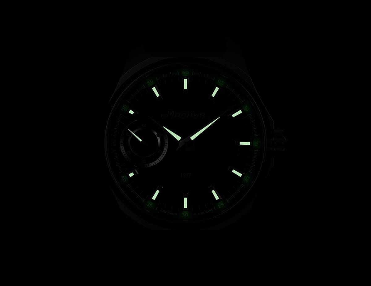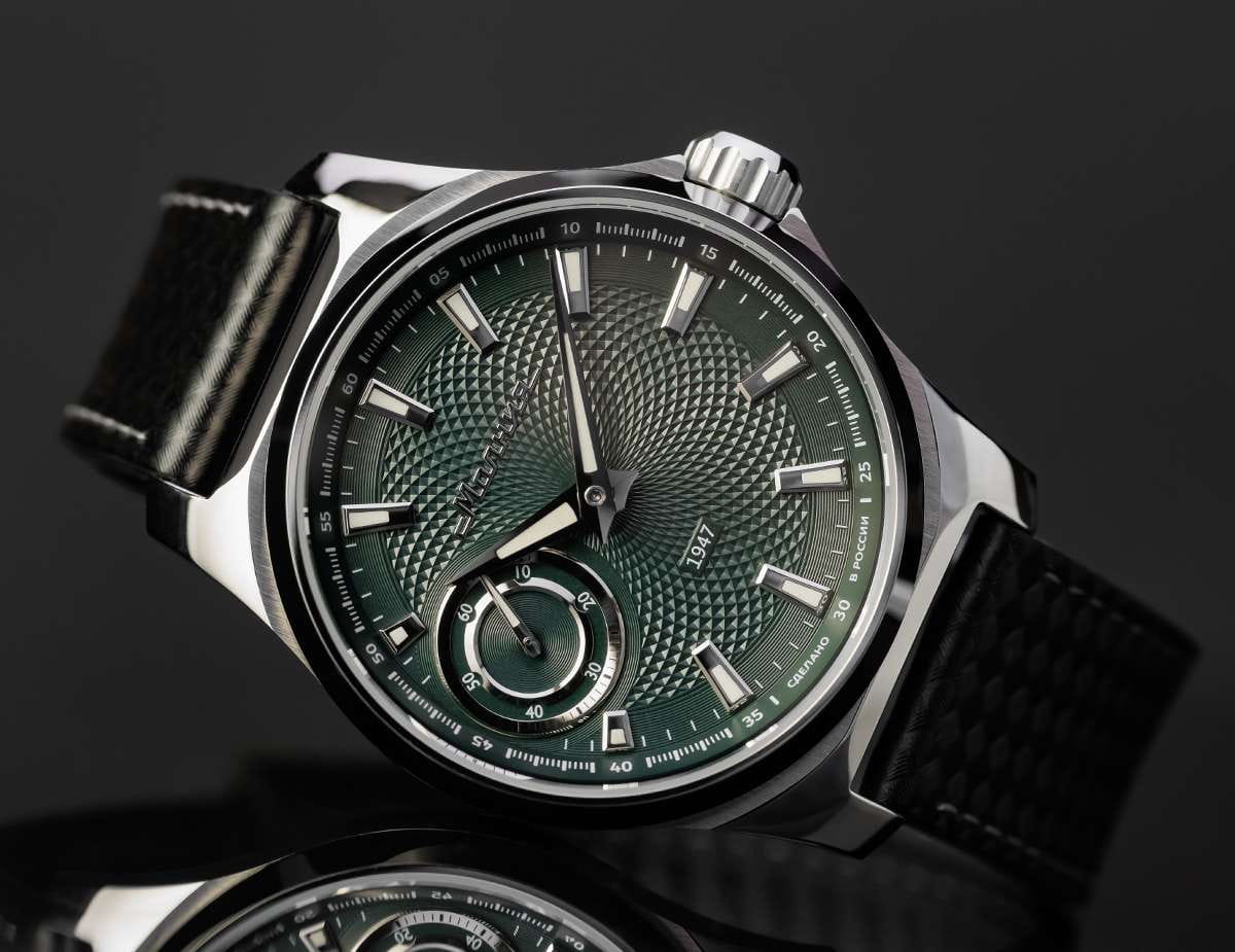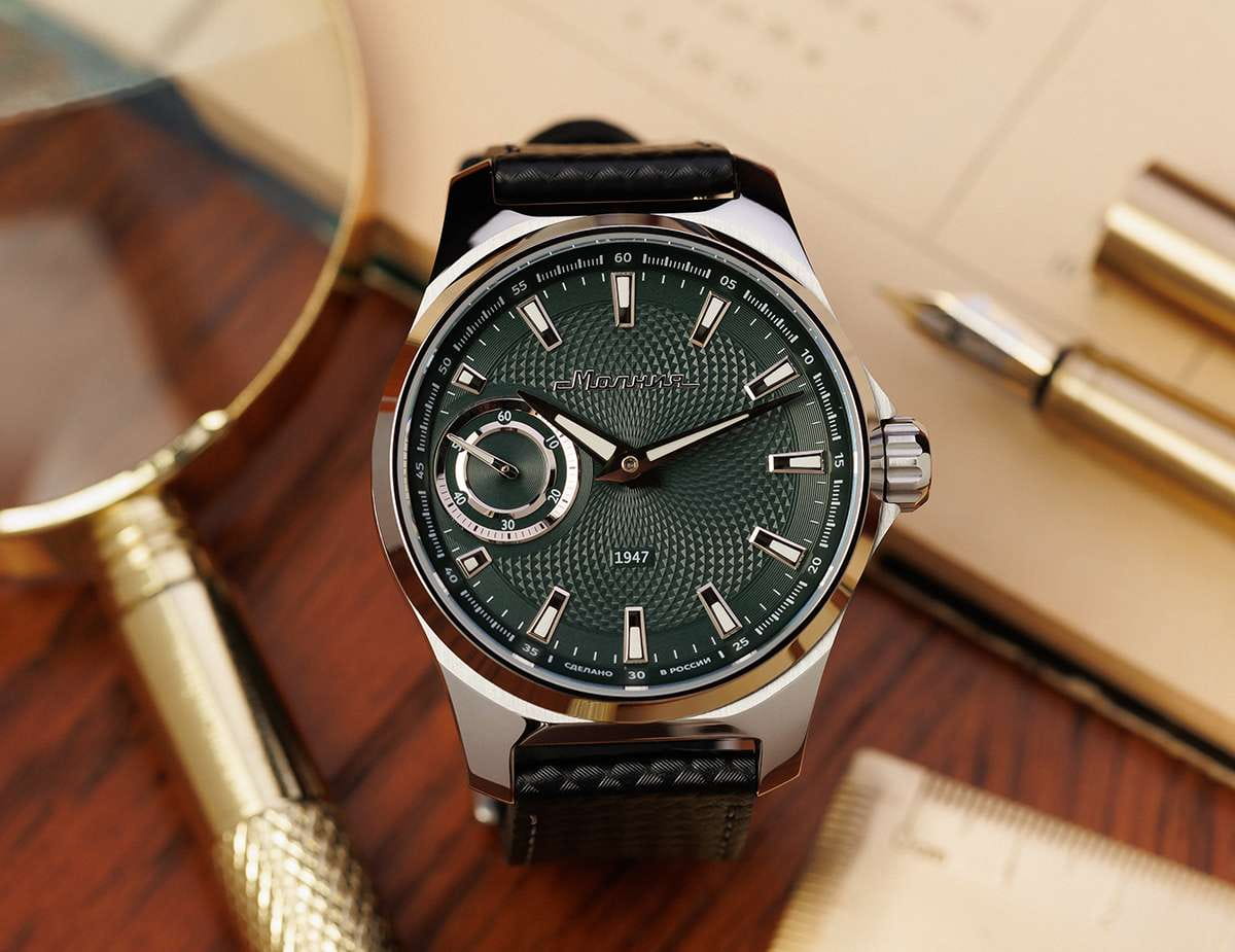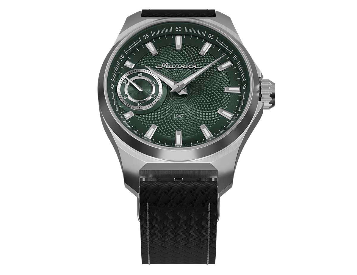 Мужские механические часы с ручным подзаводом — это аксессуар от легендарного бренда «МОЛНИЯ», созданный на Челябинском часовом заводе. Корпус диаметром 42 мм выполнен из нержавеющей стали 316L с зеркальной полировкой. БезельБезельВнешний ободок, закрепляющий стекло. В спортивных часах так называется поворотное кольцо с делениями на циферблате, выполняет роль таймера – замеряет отрезки времени на шкале. Неподвижный безель – элемент декора. Однонаправленно вращающийся безель на дайверских часах позволяет фиксировать моменты погружения и выныривания на поверхность. также выполнен из стали с зеркальной отделкой. Циферблат зелёного цвета оформлен индексами и стрелками. Малая секундная стрелка вынесена на позицию 9 часов. Стрелки и метки с люминесцентным покрытиемЛюминесцентное покрытиеПозволяет считывать показания времени в темноте. Производители наносят на стрелки, часовые индексы, безель или поверхность циферблата светонакопительный состав, дающий холодное свечение. Super-LumiNova, обеспечивающим хорошую читаемость в темноте. Циферблат защищён сапфировым стекломСапфировое стеклоПрочный и надёжный материал из кристалла сапфира синтетического происхождения, характеризующийся особой твёрдостью и устойчивостью к царапинам и повреждениям. с антибликовым покрытиемАнтибликовое покрытиеСлой оксида металла в 0,13-0,3 микрон, благодаря которому стекло часов не бликует и не отражает свет. Антибликовое покрытие уменьшает отражение света в 10 раз, обеспечивая отличную читаемость показателей циферблата.. Механизм — мануфактурный калибр 3603, собранный вручную, с запасом хода до 40 часов. Прозрачная задняя крышка позволяет наблюдать за работой механизма. Часы оснащены силиконовым ремешком чёрного цвета с классической пряжкой, а также системой быстрой замены. Водонепроницаемость 100 м позволяет использовать часы для плавания и повседневного ношения. Идеальный выбор для тех, кто ценит российское качество и традиции.