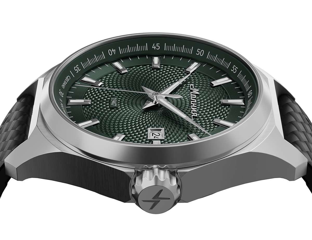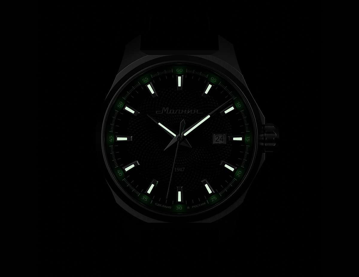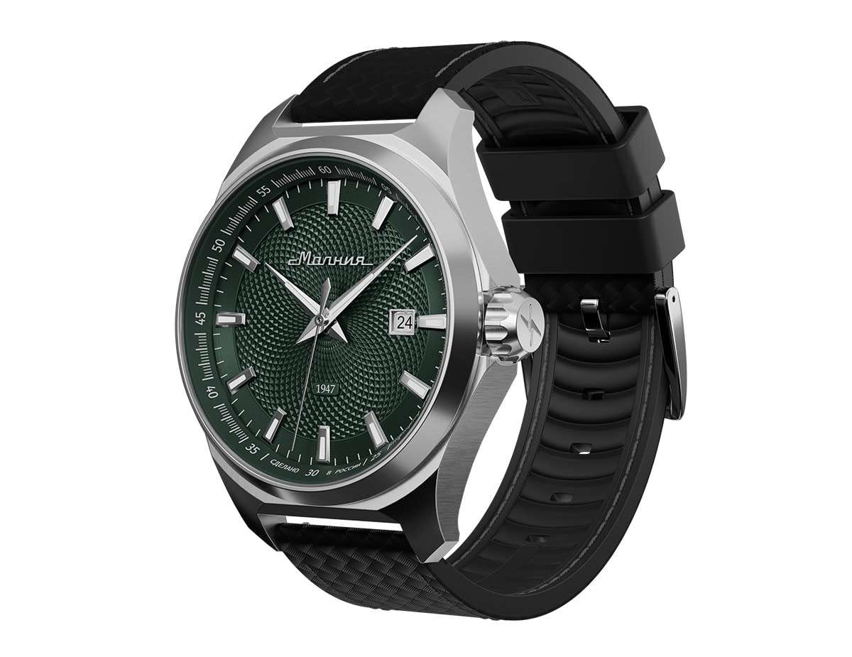 Мужские механические часы с автоподзаводом — это надёжный аксессуар от легендарного бренда «МОЛНИЯ», созданный на Челябинском часовом заводе. Корпус диаметром 42 мм выполнен из нержавеющей стали 316L с зеркальной полировкой. БезельБезельВнешний ободок, закрепляющий стекло. В спортивных часах так называется поворотное кольцо с делениями на циферблате, выполняет роль таймера – замеряет отрезки времени на шкале. Неподвижный безель – элемент декора. Однонаправленно вращающийся безель на дайверских часах позволяет фиксировать моменты погружения и выныривания на поверхность. также выполнен из стали с зеркальной отделкой. Циферблат зелёного цвета оформлен индексами и стрелками. Окошко даты расположено в положении 3 часов. Стрелки и метки с люминесцентным покрытиемЛюминесцентное покрытиеПозволяет считывать показания времени в темноте. Производители наносят на стрелки, часовые индексы, безель или поверхность циферблата светонакопительный состав, дающий холодное свечение. Super-LumiNova, обеспечивающим хорошую читаемость в темноте. Циферблат защищён сапфировым стекломСапфировое стеклоПрочный и надёжный материал из кристалла сапфира синтетического происхождения, характеризующийся особой твёрдостью и устойчивостью к царапинам и повреждениям. с антибликовым покрытиемАнтибликовое покрытиеСлой оксида металла в 0,13-0,3 микрон, благодаря которому стекло часов не бликует и не отражает свет. Антибликовое покрытие уменьшает отражение света в 10 раз, обеспечивая отличную читаемость показателей циферблата.. Механизм — японский автоматический калибр Miyota 8215 с функцией и запасом хода до 42 часов. Прозрачная задняя крышка позволяет наблюдать за работой механизма с кастомным ротором. Часы оснащены кожаным ремешком чёрного цвета с подкладкой из фтористого каучука и классической пряжкой, а также системой быстрой замены. Водонепроницаемость 100 м позволяет использовать часы для плавания и повседневного ношения. Идеальный выбор для тех, кто ценит качество, точность и стиль.