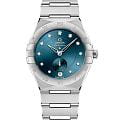Драматичный и яркий дизайн часов OMEGA Constellation характеризуется знаменитыми гранями полумесяца, а также «скобами» на боковых сторонах корпуса. Эта 34-миллиметровая модель из нержавеющей стали оснащена безелемБезельВнешний ободок, закрепляющий стекло. В спортивных часах так называется поворотное кольцо с делениями на циферблате, выполняет роль таймера – замеряет отрезки времени на шкале. Неподвижный безель – элемент декора. Однонаправленно вращающийся безель на дайверских часах позволяет фиксировать моменты погружения и выныривания на поверхность. с выгравированными римскими цифрами, циферблатом павлиньего синего цвета и круглым окошком даты в положении «6 часов». Инкрементные бриллиантовые часовые индексы представлены в держателях из белого золота 18 карат18-каратное золотоОбозначение по каратной системе пробирования, оно показывает, сколько драгоценного металла содержится в изделии. 18 карат - в составе 75% чистого золота, соответствует 750 пробе.