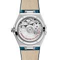 . Часы, представленные на ремешке павлиньего цвета, приводятся в движение коаксиальным хронометром OMEGA 8802, который виден через куполообразное сапфировое стеклоСапфировое стеклоПрочный и надёжный материал из кристалла сапфира синтетического происхождения, характеризующийся особой твёрдостью и устойчивостью к царапинам и повреждениям., устойчивое к царапинам.