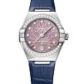Легендарные высокоточные часы OMEGA Constellation, вдохновленные загадочным мерцанием звезд в ночном небе, заключены в корпус узнаваемой формы с полукруглыми скосами и полированными скобами по бокам. Модель диаметром 29 мм выполнена из нержавеющей стали и оснащена сияющим безелемБезельВнешний ободок, закрепляющий стекло. В спортивных часах так называется поворотное кольцо с делениями на циферблате, выполняет роль таймера – замеряет отрезки времени на шкале. Неподвижный безель – элемент декора. Однонаправленно вращающийся безель на дайверских часах позволяет фиксировать моменты погружения и выныривания на поверхность. с бриллиантовым паве. Циферблат сиреневого цвета с PVDPVDУльтратонкое покрытие наносится в технике вакуумного напыления, сочетает в себе нитрид титана особой прочности со слоем золота или оксида хрома. Несёт в себе декоративную или защитную функцию.-покрытием и фирменным узором Supernova, нанесенным методом электрохимического травления, дополнен окошком даты в положении «6 часов», стрелками и звездой из 18-каратного белого золота18-каратное золотоОбозначение по каратной системе пробирования, оно показывает, сколько драгоценного металла содержится в изделии. 18 карат - в составе 75% чистого золота, соответствует 750 пробе.