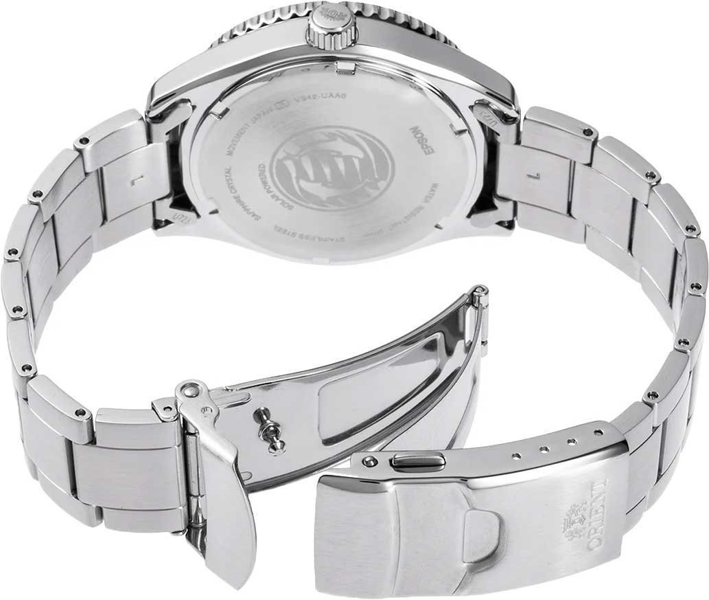 Мужские элегантные кварцевые часы Orient Mako Kamasu RA-WJ0003S выполнены в классическом спортивном стиле и оснащены солнечной батареей. Циферблат оформлен с использованием технологии Sunray (солнечные лучи), обеспечивая эффектный визуальный блеск. Метки в виде штрихов и арабских цифр. Эта изысканная модель имеет люминесцентное покрытиеЛюминесцентное покрытиеПозволяет считывать показания времени в темноте. Производители наносят на стрелки, часовые индексы, безель или поверхность циферблата светонакопительный состав, дающий холодное свечение. на стрелках и метках для отличной читаемости в темноте. Окошко даты расположено в положении 3 часов. Корпус изготовлен из стали. Часы оснащены вращающимся в одном направлении безелемБезельВнешний ободок, закрепляющий стекло. В спортивных часах так называется поворотное кольцо с делениями на циферблате, выполняет роль таймера – замеряет отрезки времени на шкале. Неподвижный безель – элемент декора. Однонаправленно вращающийся безель на дайверских часах позволяет фиксировать моменты погружения и выныривания на поверхность. с алюминиевой вставкой, который удобен при подсчёте времени. Защиту циферблата обеспечивает сапфировое стеклоСапфировое стеклоПрочный и надёжный материал из кристалла сапфира синтетического происхождения, характеризующийся особой твёрдостью и устойчивостью к царапинам и повреждениям., устойчивое к царапинам и повреждениям. Водозащита 200 WR позволяет использовать часы даже при активных водных занятиях. Часы установлены на стальной браслет с раскладной застёжкойРаскладная застёжкаТакой тип застёжки используется только на браслетах из металла. Она никогда не раскрывается полностью, происходит разделение на 2 и более частей. Раскладывающая застёжка снизит вероятность потери часов к минимуму., обеспечивающей надёжную фиксацию на руке. Это сочетание технологичности, прочности и эргономики для уверенных в себе людей.
