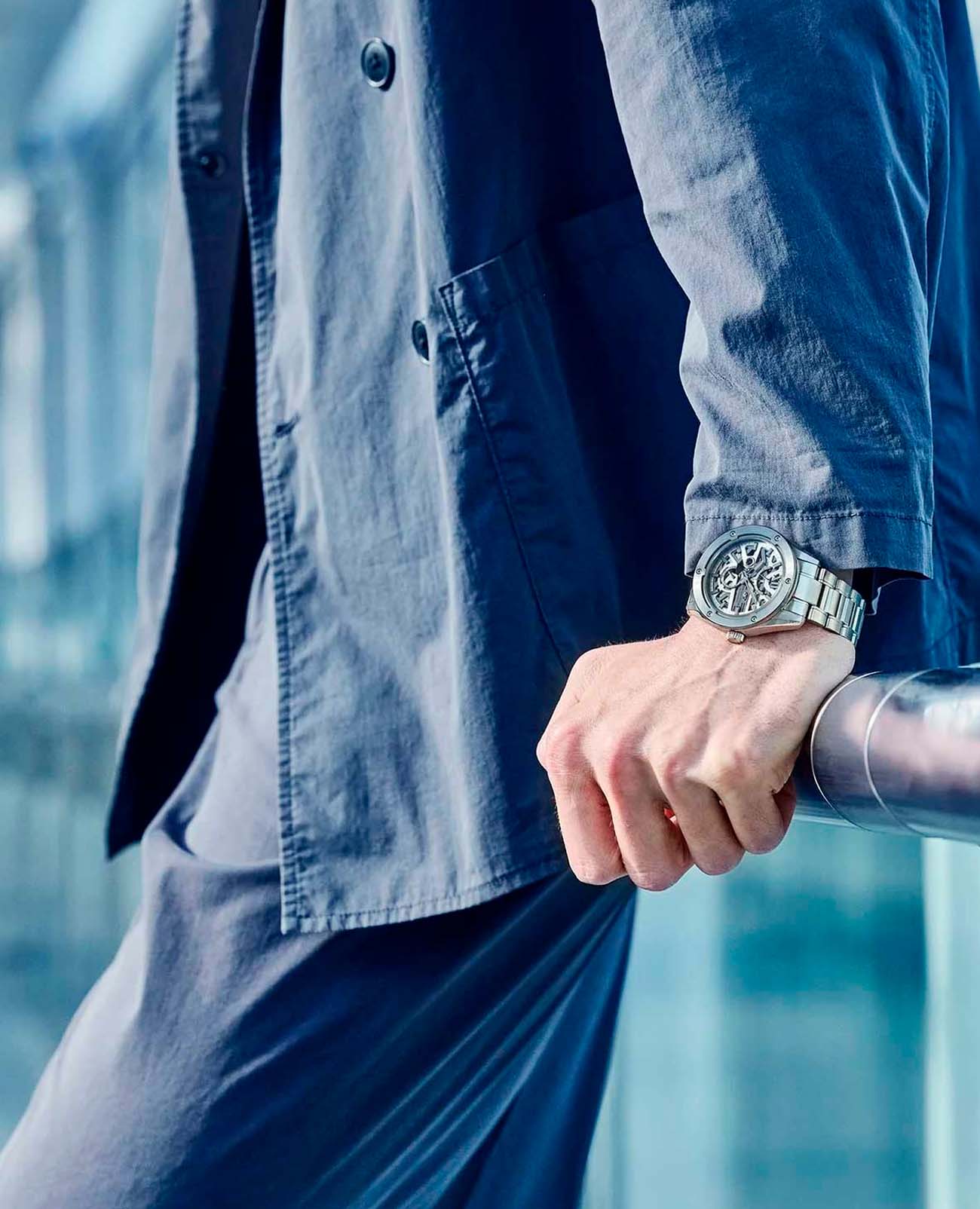 Частично скелетонизированный циферблат открывает вид на внутренний механизм, добавляя часам элемент технической изысканности. Верхняя пластина циферблата с контрастными индексами и текстурами создает эффект глубины, а секундная стрелка выделяется на фоне, подчеркивая динамичность дизайна. Стрелки часов оснащены люминесцентным покрытиемЛюминесцентное покрытиеПозволяет считывать показания времени в темноте. Производители наносят на стрелки, часовые индексы, безель или поверхность циферблата светонакопительный состав, дающий холодное свечение., обеспечивающим подсветку в темноте, что позволяет легко считывать время даже в условиях недостаточной освещенности.
