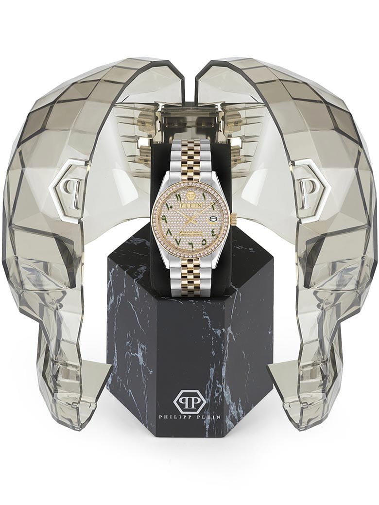 Яркие женские часы Philipp Plein Date Superlative PWYAA0823 c с минеральным стекломМинеральное стеклоМинеральное стекло представляет собой искусственно выращенный минерал кварца. Такое стекло отличается особой устойчивостью к повреждениям и царапинам. Уступает по некоторым качествам сапфировому стеклу.. Особенные часы для особенных женщин! Ослепительный аксессуар, демонстрирующий роскошь и изысканность.Часы с круглым стальным корпусом с IP-покрытиемIP-покрытиеМетод ионного напыления. Демонстрирует повышенную устойчивость к истиранию, окислению и химическим веществам. Под воздействием высокого давления и температуры около 1500°C молекулы металла надёжно соединяются с частицами корпуса часов.. Перламутровый циферблат с метками в виде точек, украшенных кристаллами. Люминесцентное покрытиеЛюминесцентное покрытиеПозволяет считывать показания времени в темноте. Производители наносят на стрелки, часовые индексы, безель или поверхность циферблата светонакопительный состав, дающий холодное свечение. стрелок. Окошко даты с увеличительным стеклом находится в положении 3 часа. Рифленая заводная головка. Стальной браслет на застёжке бабочка с кнопкамиЗастёжка "бабочка"Такой вид застёжки дополняется предохранителями, помогающими избежать случайного раскрытия браслета. Обладают изящным исполнением.