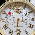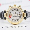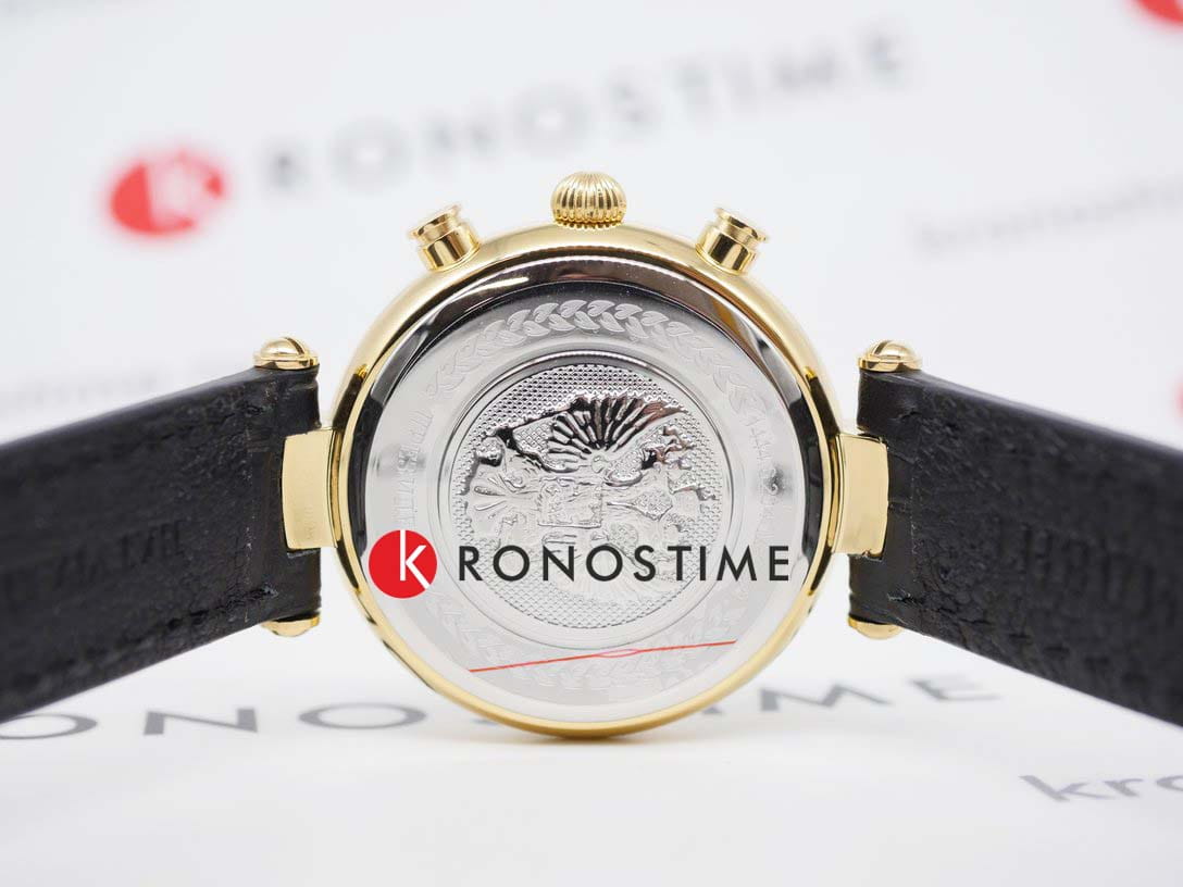 Часы «Президент» модели 14446204 — это мужские кварцевые наручные часы с хронографом, сочетающие классический дизайн и функциональность. Механизм: кварцевый хронограф Miyota OS21, обеспечивающий точность и надёжность. Функции: часы, минуты, секунды, дата, хронограф (секундомер). Корпус: из нержавеющей стали с PVD-покрытиемPVDУльтратонкое покрытие наносится в технике вакуумного напыления, сочетает в себе нитрид титана особой прочности со слоем золота или оксида хрома. Несёт в себе декоративную или защитную функцию. цвета жёлтого золота, диаметр 42,5 мм, толщина 14 мм. Циферблат: белый с позолоченными римскими цифрами, придающими элегантный вид. Стекло: сапфировое стеклоСапфировое стеклоПрочный и надёжный материал из кристалла сапфира синтетического происхождения, характеризующийся особой твёрдостью и устойчивостью к царапинам и повреждениям., устойчивое к царапинам. Водонепроницаемость: 5 ATM (50 метров), что позволяет использовать часы при мытье рук и в дождливую погоду. Ремешок: кожаный, шириной 20 мм, с классической застёжкой. Эти часы — идеальный выбор для деловых людей, ценящих стиль и функциональность.