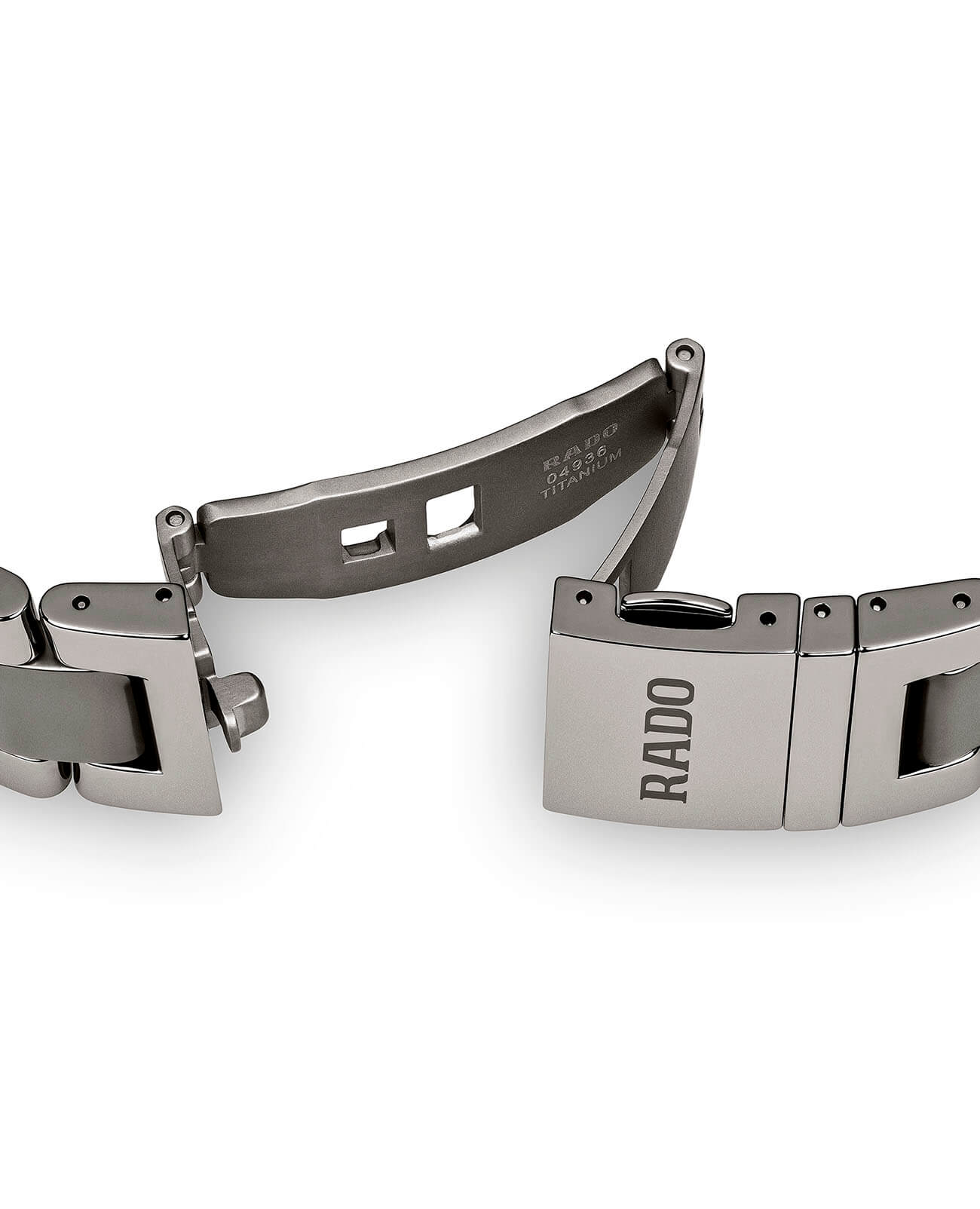 Классический хронографХронографФункция позволяет измерять отрезки времени с особой точностью: часы, минуты, секунды. Верным признаком хронографа является наличие на циферблате 3 дополнительных окошек-счётчиков. с элементами спортивного дизайна идеально подойдёт к образу солидного и делового мужчины. Винтажным элементом стал оригинальный дизайн «panda-style». Серебристо-чёрная расцветка позволяет носить часы при любых обстоятельствах. Модель оснащена швейцарским автоматическим механизмом ETA A05.H21, запас хода которого увеличен до 54 часов. Скелетонизированная задняя крышка корпуса. Стекло из сапфира с антибликовым покрытием. Корпус и браслет из стали 316L с антикоррозионными свойствами. Чёрный безельБезельВнешний ободок, закрепляющий стекло. В спортивных часах так называется поворотное кольцо с делениями на циферблате, выполняет роль таймера – замеряет отрезки времени на шкале. Неподвижный безель – элемент декора. Однонаправленно вращающийся безель на дайверских часах позволяет фиксировать моменты погружения и выныривания на поверхность. из высокотехнологичной керамикиВысокотехнологичная керамикаИнновационный запатентованный Rado материал с гладкой или матовой поверхностью. Керамика за счёт кристаллической структуры обладает повышенной устойчивостью от возникновения царапин. Материал способен принимать температуру тела человека, обеспечивая невероятный комфорт при ношении.. Люминесцентная подсветкаЛюминесцентное покрытиеПозволяет считывать показания времени в темноте. Производители наносят на стрелки, часовые индексы, безель или поверхность циферблата светонакопительный состав, дающий холодное свечение. стрелок. Водонепроницаемость 100 метров. Секундомер, отображение даты, шкала тахиметраТахиметрРазмеченная шкала, располагается на ободке или безеле часов. Тахиметр позволяет рассчитать скорость на определённом участке пути, расстояние измеряется в километрах или милях.. . Диаметр корпуса: 44 мм.