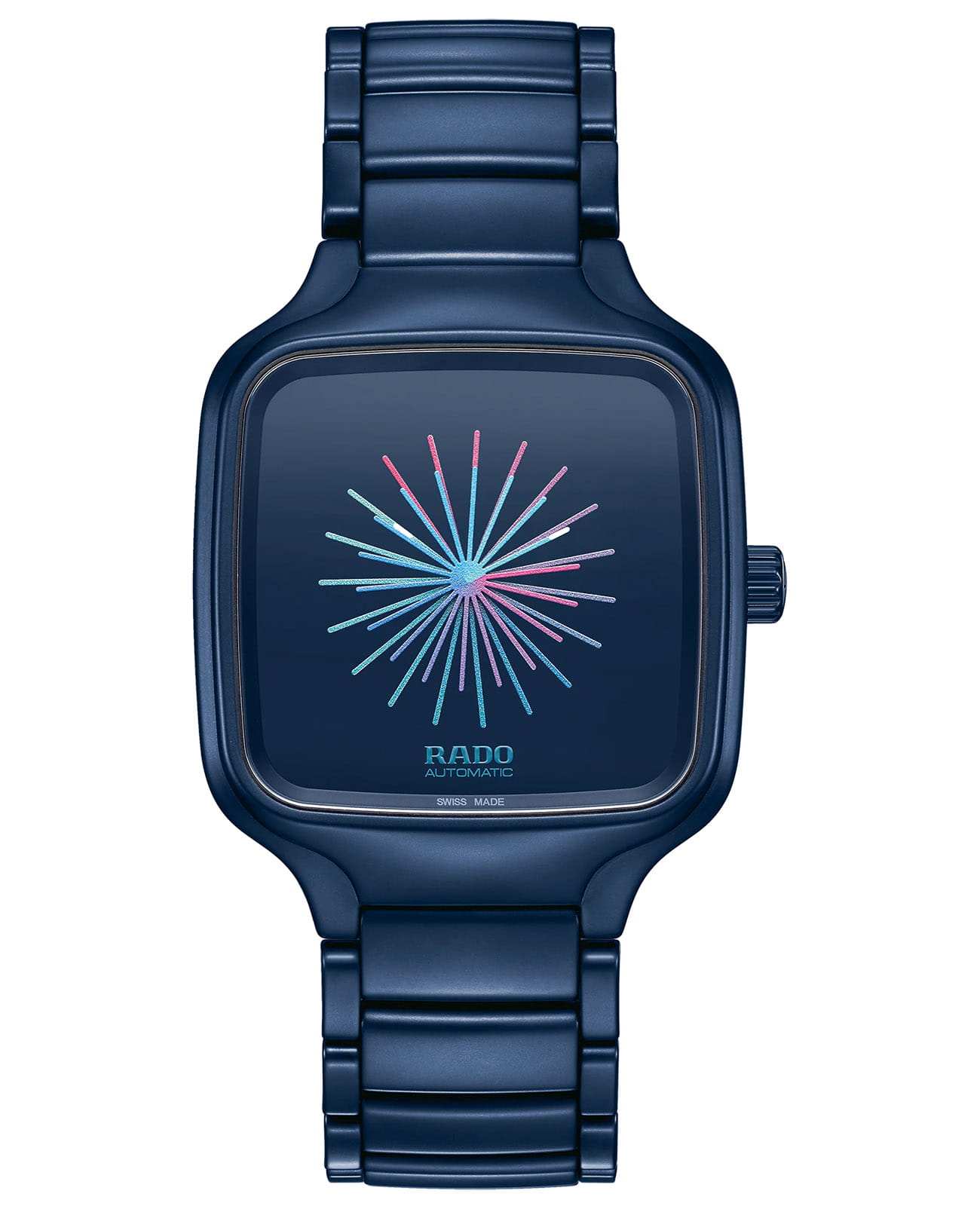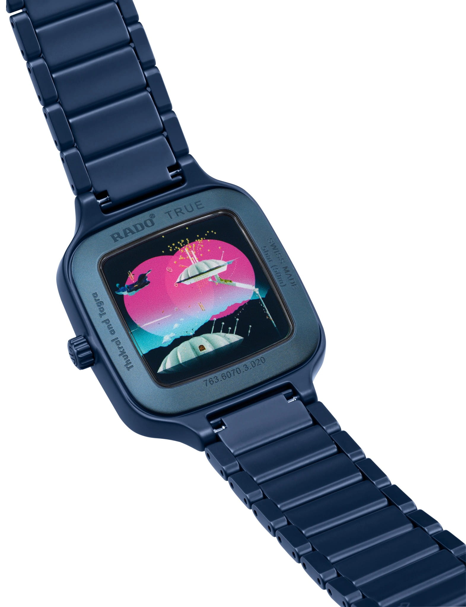 Компания Rado вновь с гордостью сообщает о пополнении коллекции True Square новой моделью часов True Square Over the Abyss. Это результат сотрудничества с дизайнерским дуэтом из Нью Дели Thukral and Tagra. Часы подчеркивают временность всего и акцентируют внимание на важности общения с другими людьми. Индийский дуэт обратился к концепции социального дизайна, чтобы вместе с экспертом в материалах создать часы с уникальным отображением времени, которые показывали бы не только местное время владельца часов, но также время в других часовых поясах мира. Эти часовые пояса обозначены при помощи 37 стрелок, окрашенных в цвета, плавно перетекающие из одного в другой — от синего до розового — и создающие эффект сказочного фейерверка в центре циферблата. Два отдельных, но заметных индикатора в виде точек SuperLuminova указывают на местное время. Циферблат с цветными акцентами облачен в квадратный корпус из матовой высокотехнологичной керамики синего цвета диаметром 38 мм — культовые дизайн и форма Rado родом из 70-х, обновленные в духе ХХІ века. Задняя крышка корпуса украшена рисунком под названием Dominus Aeries, созданным дуэтом, который сочетает в себе взгляд на будущее и воспоминания из прошлого. Поэтому верхняя и задняя часть часов являются прекрасными произведениями искусства в исполнении Thukral and Tagra.
