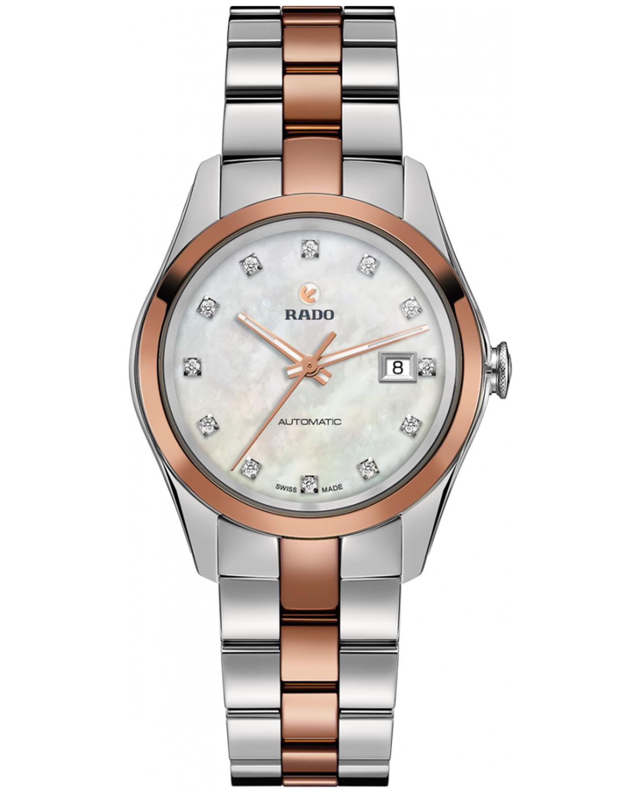 Женские швейцарские механические часы с автоподзаводом Rado Hyperchrome Automatic R32087902. Сапфировое стеклоСапфировое стеклоПрочный и надёжный материал из кристалла сапфира синтетического происхождения, характеризующийся особой твёрдостью и устойчивостью к царапинам и повреждениям. устойчивое к мелким механическим повреждениям. Корпус часов изготовлен из нержавеющей стали. БезельБезельВнешний ободок, закрепляющий стекло. В спортивных часах так называется поворотное кольцо с делениями на циферблате, выполняет роль таймера – замеряет отрезки времени на шкале. Неподвижный безель – элемент декора. Однонаправленно вращающийся безель на дайверских часах позволяет фиксировать моменты погружения и выныривания на поверхность. из нержавеющей стали с PVD-покрытиемPVDУльтратонкое покрытие наносится в технике вакуумного напыления, сочетает в себе нитрид титана особой прочности со слоем золота или оксида хрома. Несёт в себе декоративную или защитную функцию.. Стрелки с люминесцентным покрытиемЛюминесцентное покрытиеПозволяет считывать показания времени в темноте. Производители наносят на стрелки, часовые индексы, безель или поверхность циферблата светонакопительный состав, дающий холодное свечение.. Циферблат украшен бриллиантами. Окошко даты находится в положении 3 часа. Класс водозащиты: 50 метров, позволит защитить корпус от случайных брызг или капель дождя. Стальной браслет с частичным PVD-покрытиемPVDУльтратонкое покрытие наносится в технике вакуумного напыления, сочетает в себе нитрид титана особой прочности со слоем золота или оксида хрома. Несёт в себе декоративную или защитную функцию. на раскладной застёжкеРаскладная застёжкаТакой тип застёжки используется только на браслетах из металла. Она никогда не раскрывается полностью, происходит разделение на 2 и более частей. Раскладывающая застёжка снизит вероятность потери часов к минимуму..