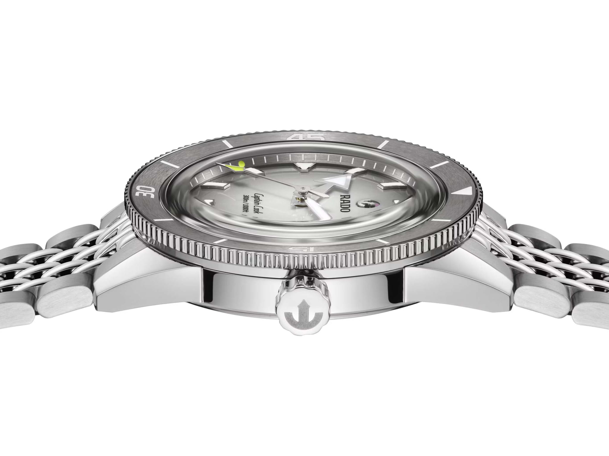 Мужские механические часы с автоподзаводом Rado Captain Cook X Tennis Limited Edition — это дань уважения 40-летнему партнерству бренда с теннисом. Лимитированная серия из 1985 экземпляров отсылает к первой спонсорской поддержке Rado на Swiss Open в Гштааде в 1985 году. Корпус диаметром 39 мм и толщиной 12 мм выполнен из полированной нержавеющей стали. БезельБезельВнешний ободок, закрепляющий стекло. В спортивных часах так называется поворотное кольцо с делениями на циферблате, выполняет роль таймера – замеряет отрезки времени на шкале. Неподвижный безель – элемент декора. Однонаправленно вращающийся безель на дайверских часах позволяет фиксировать моменты погружения и выныривания на поверхность. — вращающийся, стальной, с инкрустированным кольцом из высокотехнологичной плазменной керамикиВысокотехнологичная плазменная керамикаИнновационный материал, технология запатентована. Выплавление керамики осуществляется в печи при 20 000 °C, белоснежный материал под воздействием ультравысокой температуры приобретает уникальный блеск, присущий металлам., на котором нанесены метки, цифры и треугольник с белым люминесцентным покрытиемЛюминесцентное покрытиеПозволяет считывать показания времени в темноте. Производители наносят на стрелки, часовые индексы, безель или поверхность циферблата светонакопительный состав, дающий холодное свечение. Super-Luminova®. Циферблат серого цвета с градиентом от тёмного к светлому оформлен накладными индексами цвета родия и стрелками с люминесцентным покрытиемЛюминесцентное покрытиеПозволяет считывать показания времени в темноте. Производители наносят на стрелки, часовые индексы, безель или поверхность циферблата светонакопительный состав, дающий холодное свечение. Super-Luminova®. На ободе — жёлтые люминесцентные точки в положениях 3, 6, 8 и 12 часов, символизирующие счёт в теннисе (15, 30, 40, гейм). Секундная стрелка с тёмно-жёлтым покрытием Super-Luminova®. Циферблат защищён сапфировым стекломСапфировое стеклоПрочный и надёжный материал из кристалла сапфира синтетического происхождения, характеризующийся особой твёрдостью и устойчивостью к царапинам и повреждениям. с антибликовым покрытиемАнтибликовое покрытиеСлой оксида металла в 0,13-0,3 микрон, благодаря которому стекло часов не бликует и не отражает свет. Антибликовое покрытие уменьшает отражение света в 10 раз, обеспечивая отличную читаемость показателей циферблата. с обеих сторон. Механизм — автоматический калибр R763 с антимагнитной пружиной Nivachron™Nivachron™Специально разработанный инновационный сплав Nivachron™ повышает устойчивость часов к воздействию магнитных полей., отрегулированный в пяти положениях, с запасом хода 80 часов. Окошко даты расположено в положении 3 часов. Часы оснащены стальным браслетом «рисовый узор» с трёхсекционной застёжкой и системой быстрой смены EasyClip. В комплекте — три текстильных ремешка в стиле NATO (синий, зелёный, оранжевый) с пряжками из нержавеющей стали. Водонепроницаемость 300 м позволяет использовать часы для профессионального плавания и дайвинга. Гарантия — 2 года. Идеальный выбор для ценителей спортивного стиля, точности и эксклюзивности.