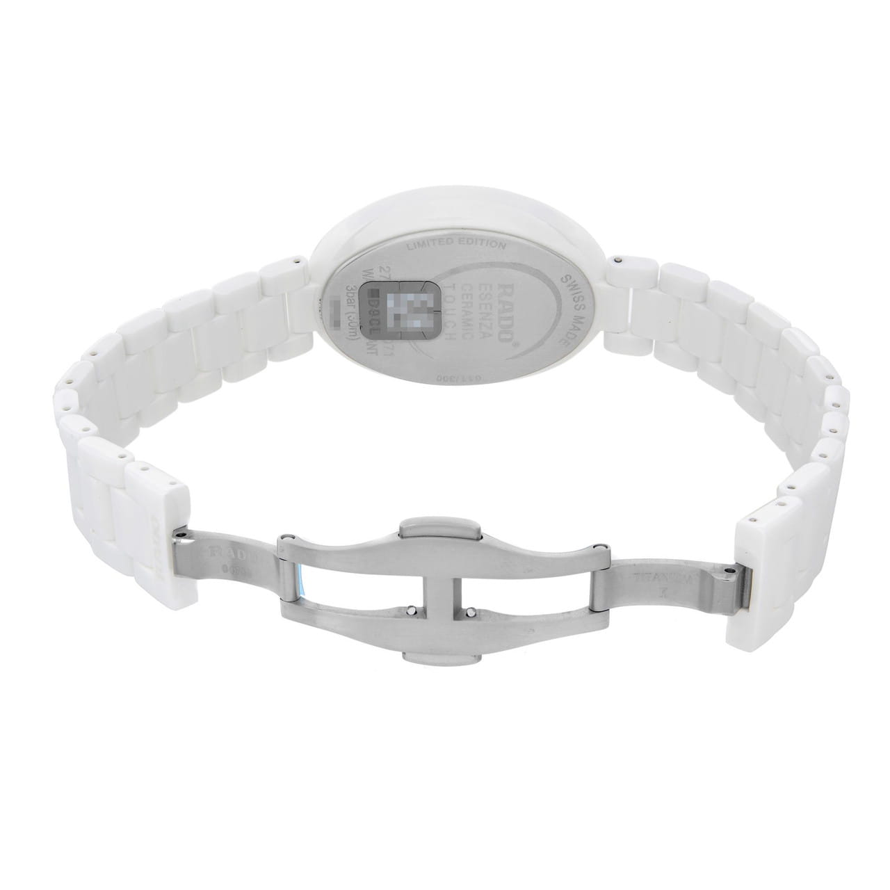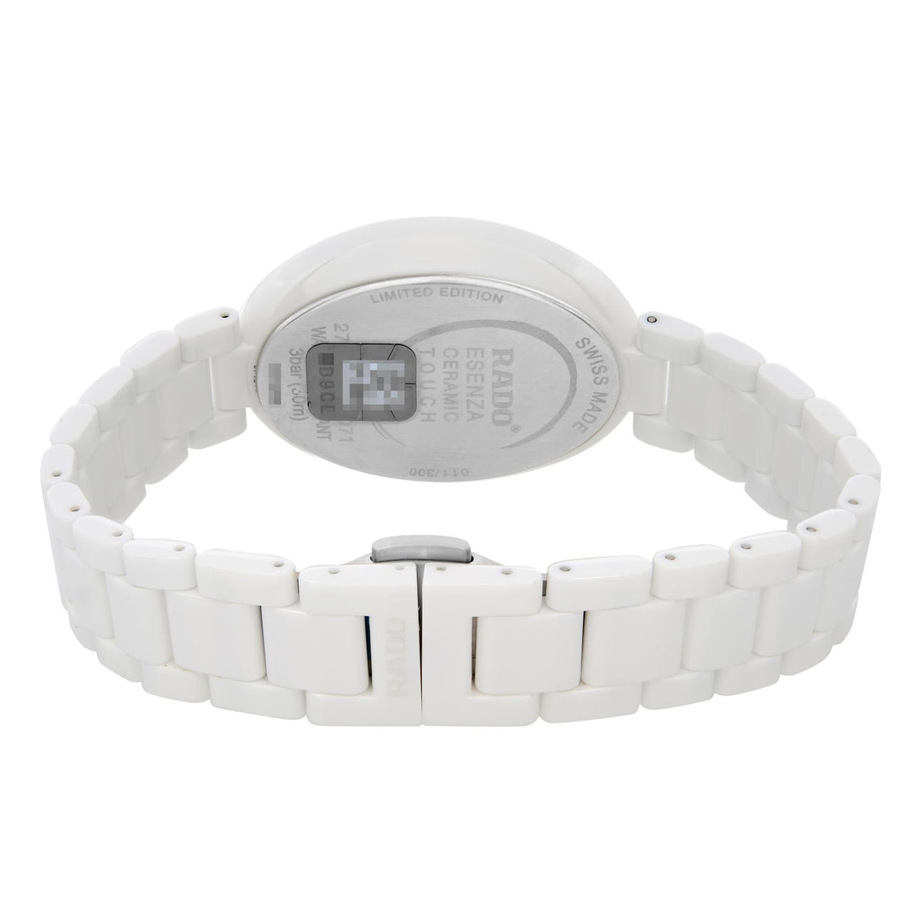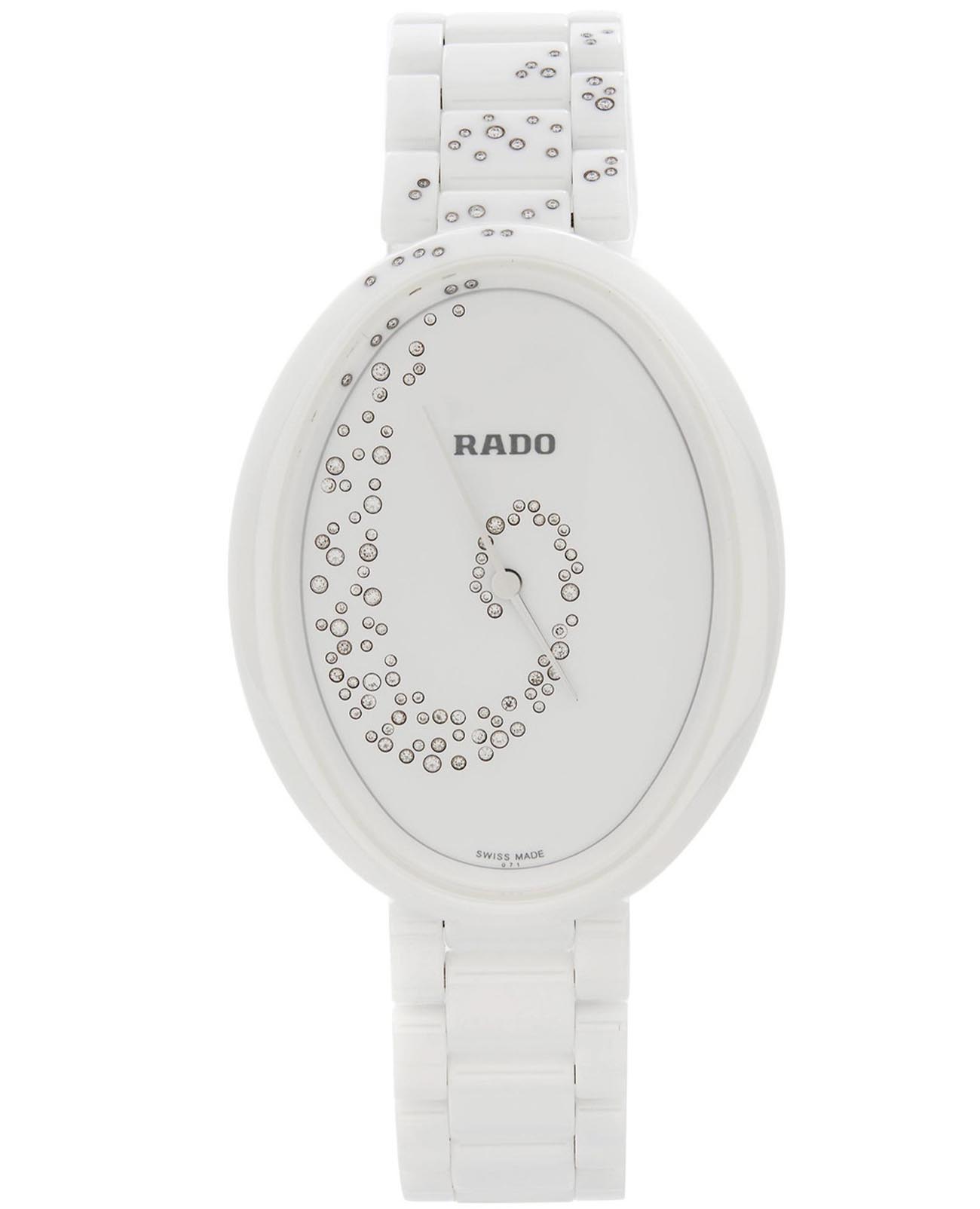 Женские керамические швейцарские часы с бриллиантами Rado Esenza R53042712, кварцевый механизм с высокой точностью. Сапфировое стеклоСапфировое стеклоПрочный и надёжный материал из кристалла сапфира синтетического происхождения, характеризующийся особой твёрдостью и устойчивостью к царапинам и повреждениям. устойчивое к появлению царапин, обладающее высокой прозрачностью. Класс водозащиты: 30 метров, позволит защитить корпус от случайных брызг или капель дождя. Корпус и браслет часов изготовлены из высокотехнологичной керамикиВысокотехнологичная керамикаИнновационный запатентованный Rado материал с гладкой или матовой поверхностью. Керамика за счёт кристаллической структуры обладает повышенной устойчивостью от возникновения царапин. Материал способен принимать температуру тела человека, обеспечивая невероятный комфорт при ношении.. Циферблат декорирован 132 бриллиантами 0,207сt.