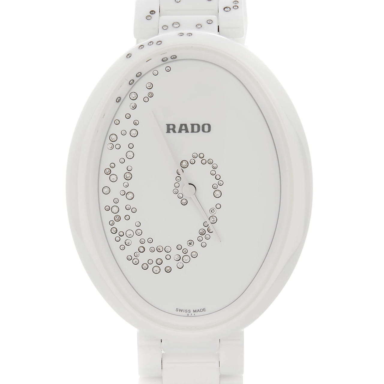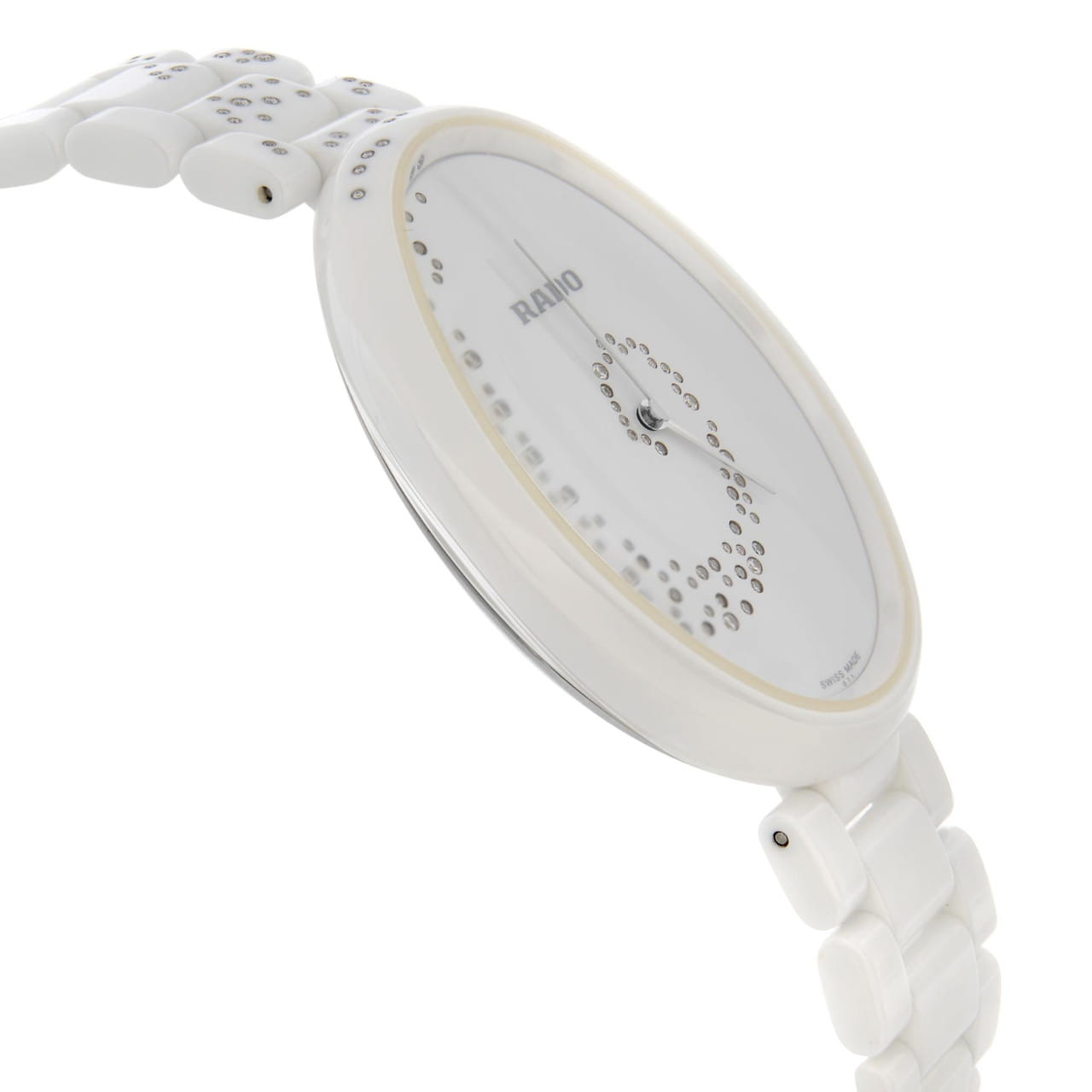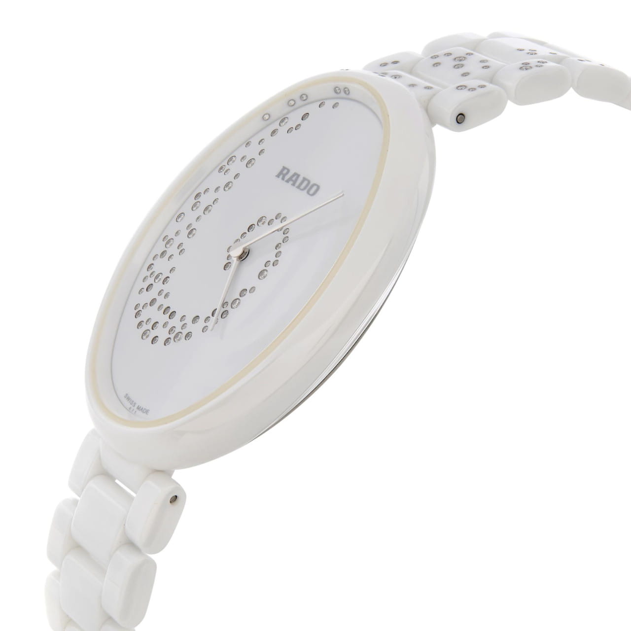 Женские керамические швейцарские часы с бриллиантами Rado Esenza R53042712, кварцевый механизм с высокой точностью. Сапфировое стеклоСапфировое стеклоПрочный и надёжный материал из кристалла сапфира синтетического происхождения, характеризующийся особой твёрдостью и устойчивостью к царапинам и повреждениям. устойчивое к появлению царапин, обладающее высокой прозрачностью. Класс водозащиты: 30 метров, позволит защитить корпус от случайных брызг или капель дождя. Корпус и браслет часов изготовлены из высокотехнологичной керамикиВысокотехнологичная керамикаИнновационный запатентованный Rado материал с гладкой или матовой поверхностью. Керамика за счёт кристаллической структуры обладает повышенной устойчивостью от возникновения царапин. Материал способен принимать температуру тела человека, обеспечивая невероятный комфорт при ношении.. Циферблат декорирован 132 бриллиантами 0,207сt.