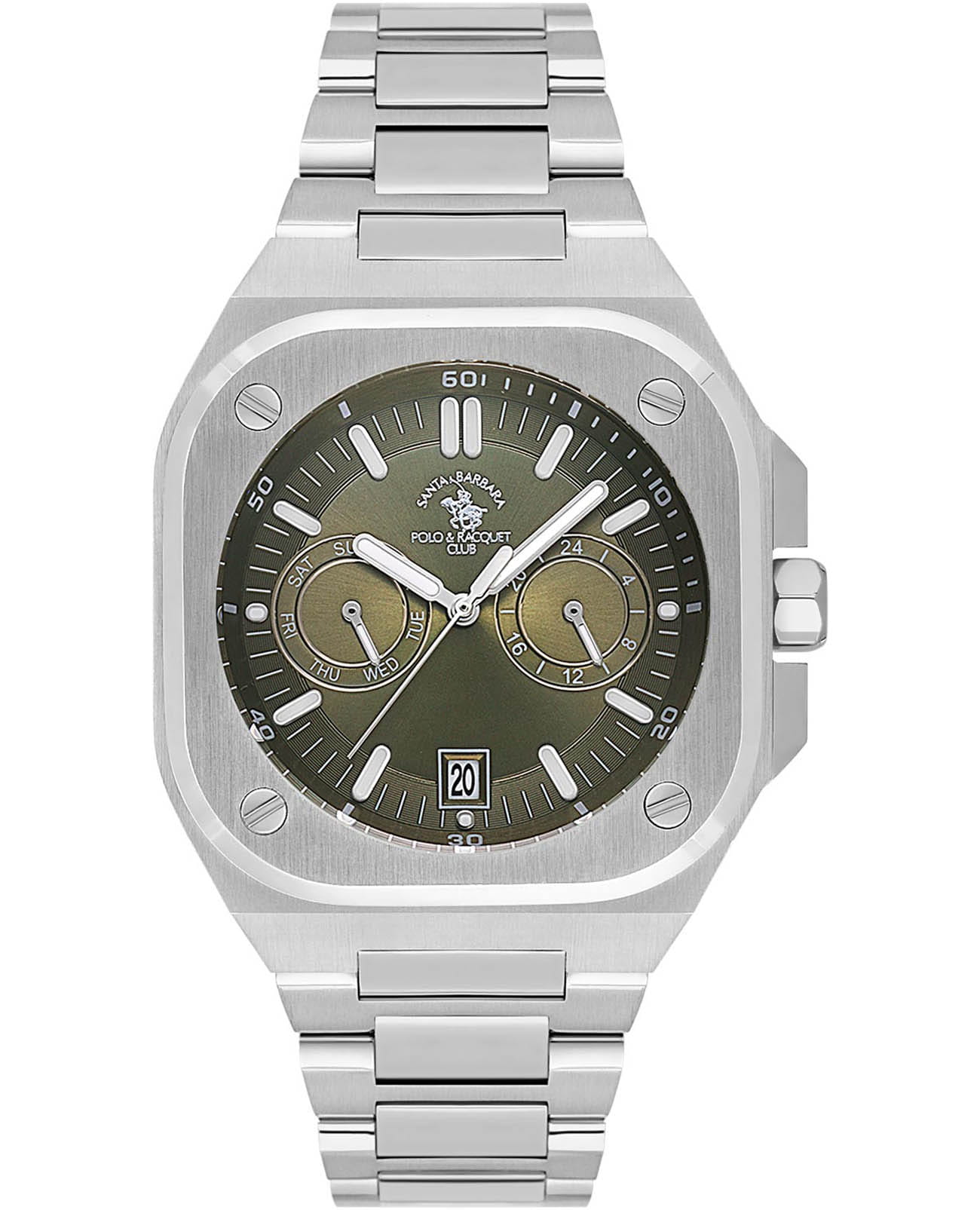 Мужские кварцевые часы Santa Barbara Polo & Racquet Club Luxury SB.1.10576-3 — воплощение элегантности и технического совершенства. Корпус из нержавеющей стали 316L, диаметром 41 мм, что делает их устойчивыми к внешним воздействиям и придает благородный вид. Стрелки и метки с люминесцентным покрытиемЛюминесцентное покрытиеПозволяет считывать показания времени в темноте. Производители наносят на стрелки, часовые индексы, безель или поверхность циферблата светонакопительный состав, дающий холодное свечение., обеспечивающим хорошую читаемость в темноте. Циферблат защищён минеральным стекломМинеральное стеклоМинеральное стекло представляет собой искусственно выращенный минерал кварца. Такое стекло отличается особой устойчивостью к повреждениям и царапинам. Уступает по некоторым качествам сапфировому стеклу. устойчивое к царапинам и механическим повреждениям. Окошко даты находится в положении отметки 6 часов. Указатель дня недели вынесен на отдельный циферблат, также присутствует индикация 24-часового формата времени. Часы оснащены надежным стальным браслетом с застёжкой-бабочкаЗастёжка "бабочка"Такой вид застёжки дополняется предохранителями, помогающими избежать случайного раскрытия браслета. Обладают изящным исполнением. , обеспечивающая комфортное и безопасное ношение. Водонепроницаемость 50 метров позволит защитить корпус от случайных брызг или капель дождя. Идеальный выбор для тех, кто ценит элегантный дизайн и качество.