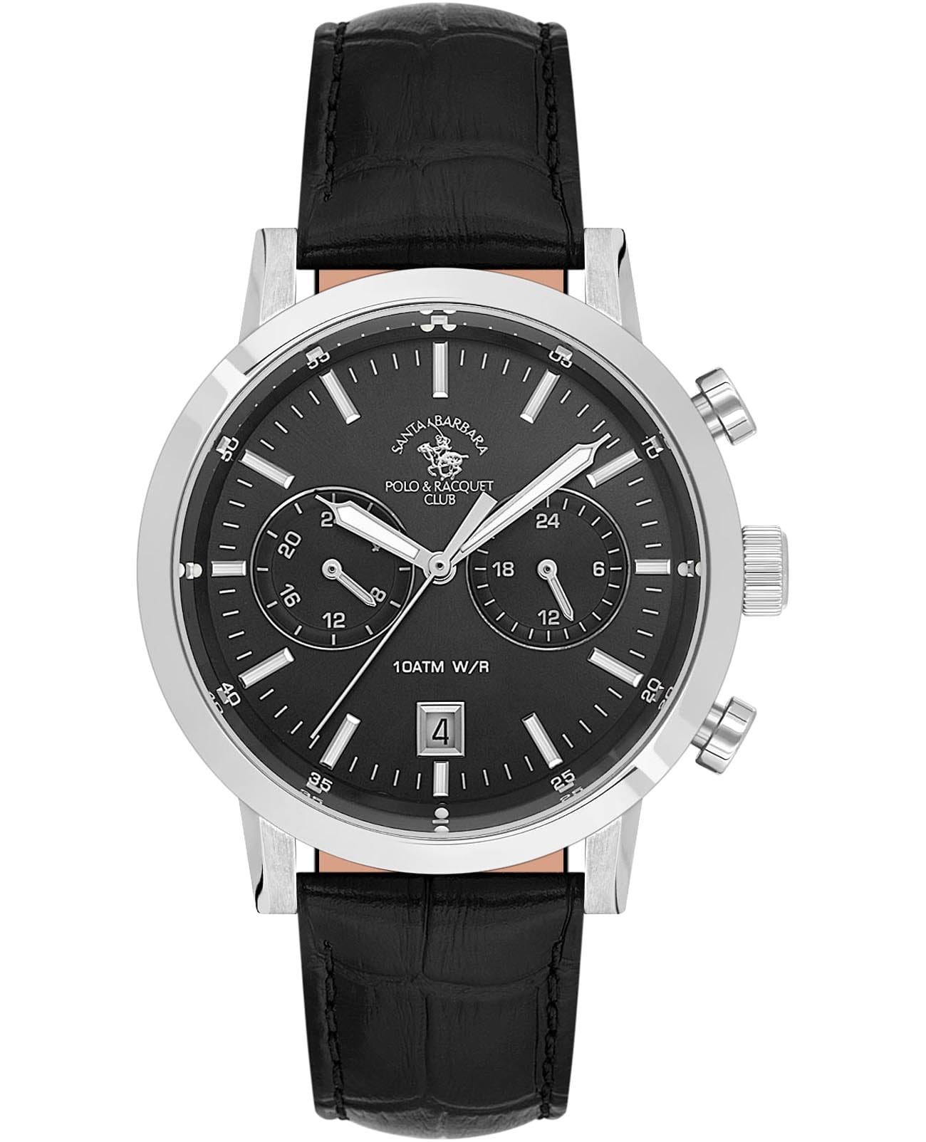 Мужские кварцевые Santa Barbara Polo & Racquet Club SB.1.10586-2 — воплощение элегантности и технического совершенства. Корпус из нержавеющей стали серебристого цвета, диаметром 41,5 мм, что делает их устойчивыми к внешним воздействиям и придает благородный вид. Циферблат украшен фирменным логотипом и защищён минеральным стекломМинеральное стеклоМинеральное стекло представляет собой искусственно выращенный минерал кварца. Такое стекло отличается особой устойчивостью к повреждениям и царапинам. Уступает по некоторым качествам сапфировому стеклу., устойчивое к царапинам и механическим повреждениям. Кожаный ремешок на застёжке-бабочке с кнопкамиЗастёжка "бабочка"Такой вид застёжки дополняется предохранителями, помогающими избежать случайного раскрытия браслета. Обладают изящным исполнением. обеспечивает комфортное и безопасное ношение. Стрелки с люминесцентным покрытиемЛюминесцентное покрытиеПозволяет считывать показания времени в темноте. Производители наносят на стрелки, часовые индексы, безель или поверхность циферблата светонакопительный состав, дающий холодное свечение., которое светится в темноте после непродолжительной зарядки на свету. Рифленая заводная головка. Второй часовой поясВторой часовой поясФункция, позволяющая отображать время двух часовых поясов одновременно.. 12-ти и 24-х часовой формат. Окошко даты находится в положении 6 часов. Водонепроницаемость 100 метров позволит плавать, нырять и заниматься другими водными видами спорта. Идеальный выбор для тех, кто ценит элегантный дизайн и качество.