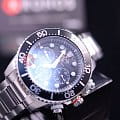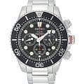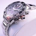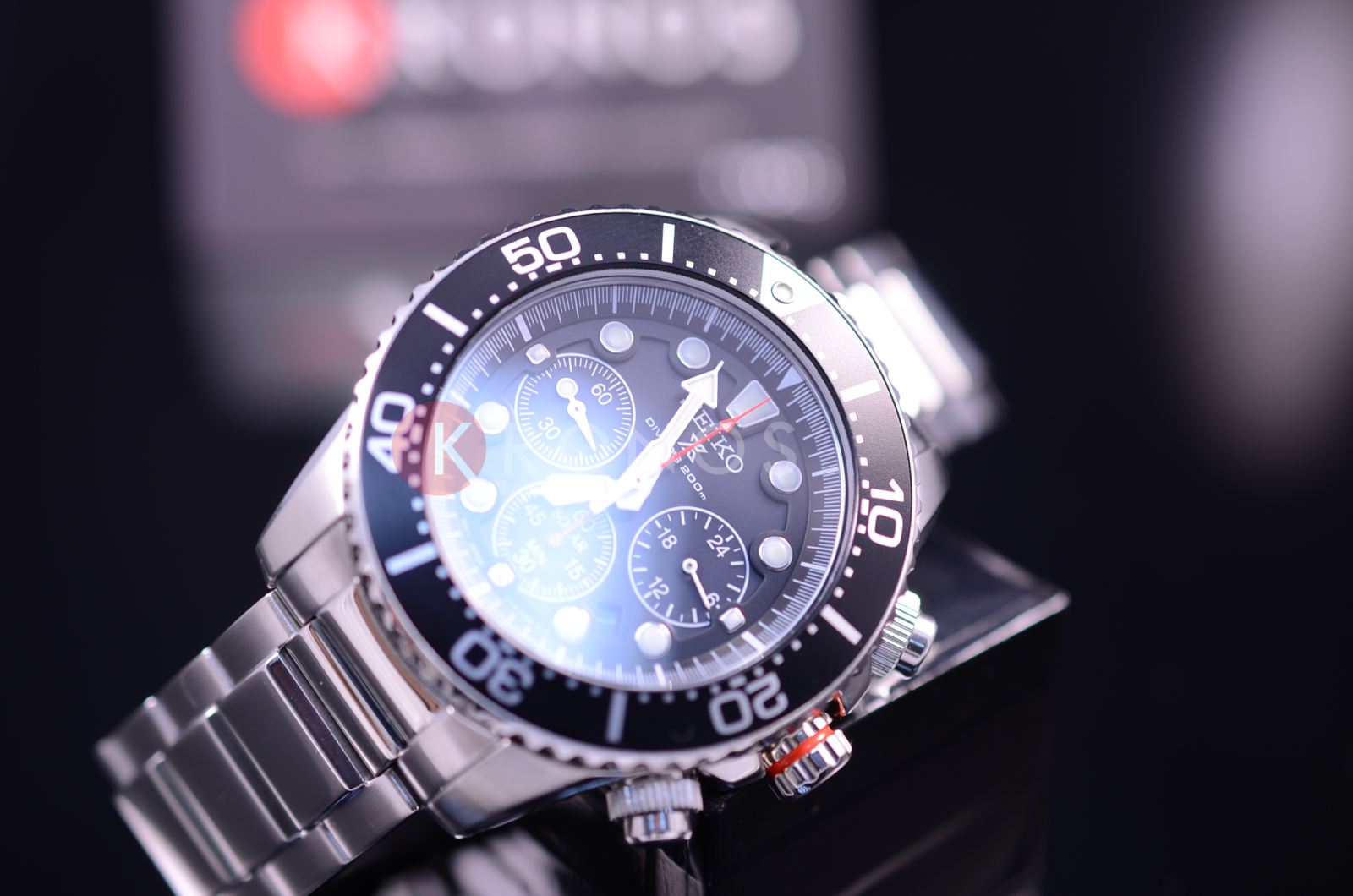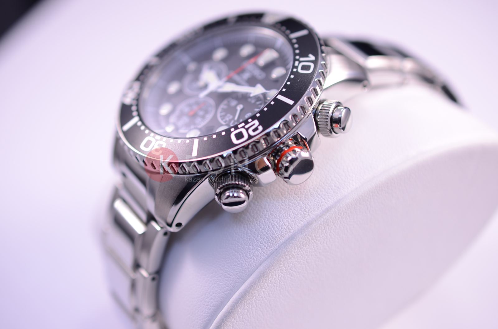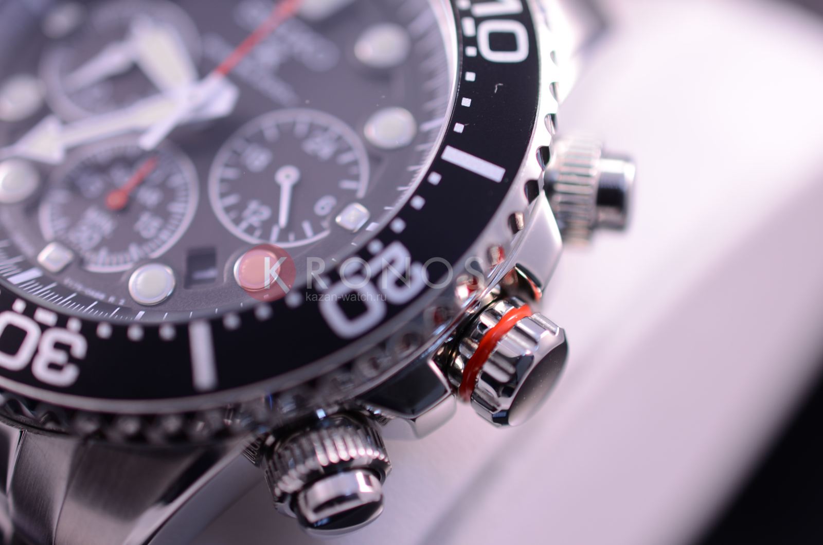 Мужские наручные часы пригодные для подводных погружений, работающие от солнечных батарей Секундомер с точностью показаний до 1/5 секунды и максимальным временем измерения - 60 минут. Индикация числа. Отдельный циферблат с 24-х часовым форматом времени (суточник). Устойчивое к механическим воздействиям многослойное минеральное стекло изготовленное по технологии Hardlex. Вращающийся безель. Задняя крышка с винтовым фиксатором. Завинчивающиеся заводная головка и кнопки управления хронографом. Минеральное стекло повышенной прочности. Люминесцентные стрелки и индексы. Диаметр корпуса 44 мм.