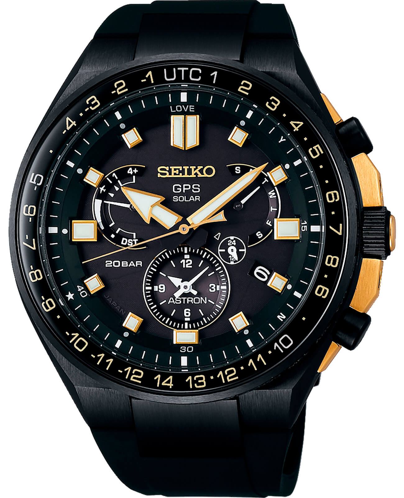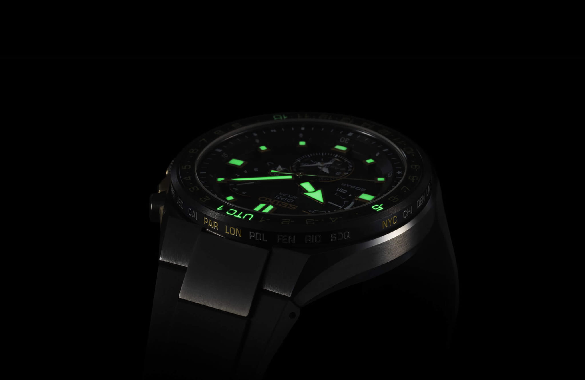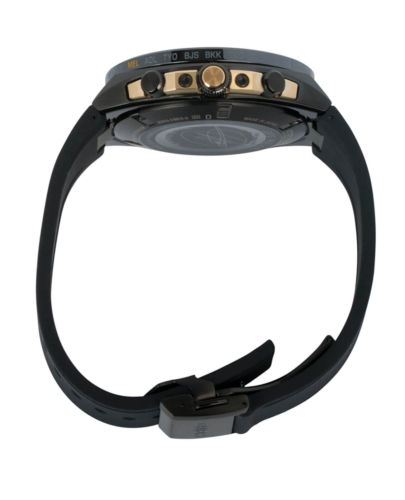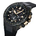 -сигнала. Он определяет точное время, дату, часовой пояс по данным со спутника. Кварцевый японский механизм Seiko 8X53 получает питание от солнечной батареи . Стекло из сапфира. Титановый корпус с PVD-покрытиемPVDУльтратонкое покрытие наносится в технике вакуумного напыления, сочетает в себе нитрид титана особой прочности со слоем золота или оксида хрома. Несёт в себе декоративную или защитную функцию.. Вращающийся безельБезельВнешний ободок, закрепляющий стекло. В спортивных часах так называется поворотное кольцо с делениями на циферблате, выполняет роль таймера – замеряет отрезки времени на шкале. Неподвижный безель – элемент декора. Однонаправленно вращающийся безель на дайверских часах позволяет фиксировать моменты погружения и выныривания на поверхность. из керамики. Водостойкость 200 метров. Заводная головка с системой защиты. Силиконовый ремешок. Вечный календарьВечный календарьКлассическое часовое усложнение, представляющее собой календарь, рассчитанный на несколько лет вперёд (стандартно – до 2099 года). Определяет текущую дату, день недели, месяц.. Стрелки и метки с люминесцентнымЛюминесцентное покрытиеПозволяет считывать показания времени в темноте. Производители наносят на стрелки, часовые индексы, безель или поверхность циферблата светонакопительный состав, дающий холодное свечение. покрытием. Диаметр корпуса: 46,7 мм.