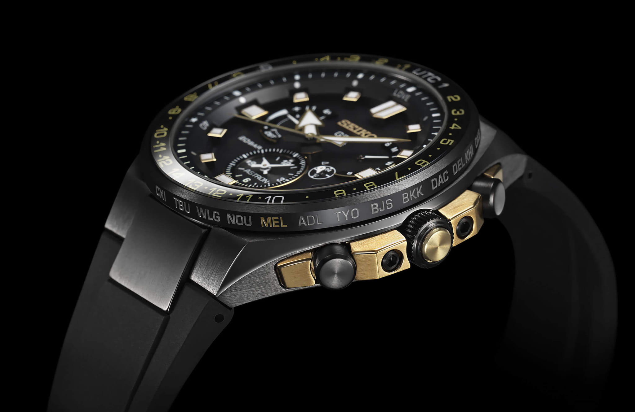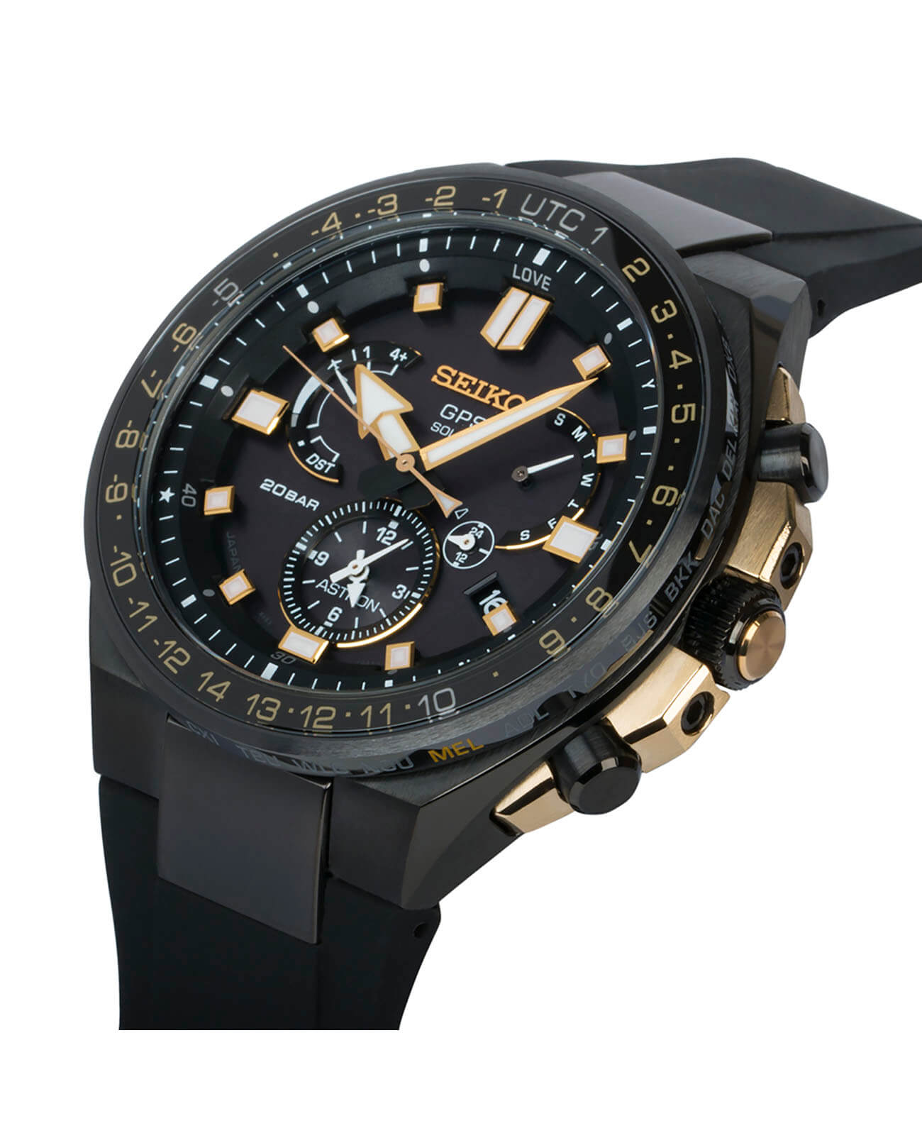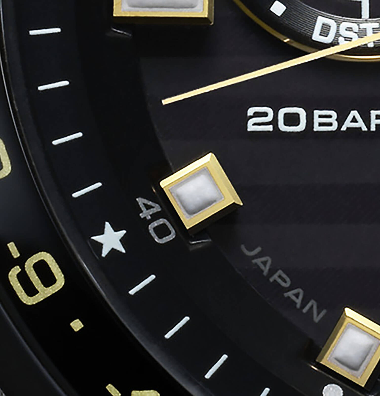 -сигнала. Он определяет точное время, дату, часовой пояс по данным со спутника. Кварцевый японский механизм Seiko 8X53 получает питание от солнечной батареи . Стекло из сапфира. Титановый корпус с PVD-покрытиемPVDУльтратонкое покрытие наносится в технике вакуумного напыления, сочетает в себе нитрид титана особой прочности со слоем золота или оксида хрома. Несёт в себе декоративную или защитную функцию.. Вращающийся безельБезельВнешний ободок, закрепляющий стекло. В спортивных часах так называется поворотное кольцо с делениями на циферблате, выполняет роль таймера – замеряет отрезки времени на шкале. Неподвижный безель – элемент декора. Однонаправленно вращающийся безель на дайверских часах позволяет фиксировать моменты погружения и выныривания на поверхность. из керамики. Водостойкость 200 метров. Заводная головка с системой защиты. Силиконовый ремешок. Вечный календарьВечный календарьКлассическое часовое усложнение, представляющее собой календарь, рассчитанный на несколько лет вперёд (стандартно – до 2099 года). Определяет текущую дату, день недели, месяц.. Стрелки и метки с люминесцентнымЛюминесцентное покрытиеПозволяет считывать показания времени в темноте. Производители наносят на стрелки, часовые индексы, безель или поверхность циферблата светонакопительный состав, дающий холодное свечение. покрытием. Диаметр корпуса: 46,7 мм.