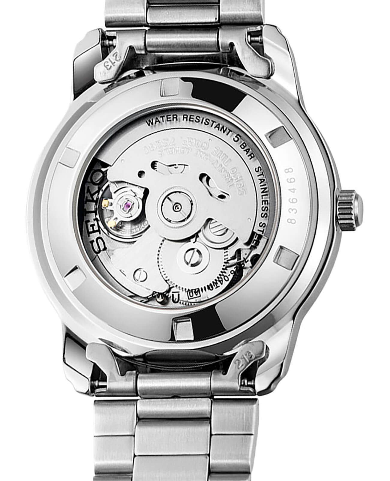 Наручные часы с золотистыми деталями выполнены в классическом стиле, спортивные элементы делают акцент на надёжности и функциональности модели. Традиционный характер выражается в оснащении аксессуара японским механизмом Seiko 7S26 с возможностью ручного и автоматического завода. Калибр отличается сохранением запаса хода на 40 часов, его работу можно отследить через прозрачную завинчивающуюся заднюю крышку. В качестве основного материала была выбрана хирургическая сталь 316L, характеризующаяся устойчивостью к царапинам, повреждениям. Защиту циферблата обеспечивает прочное минеральное стекло Hardlex. На стрелки и метки нанесено яркое люминесцентное покрытиеЛюминесцентное покрытиеПозволяет считывать показания времени в темноте. Производители наносят на стрелки, часовые индексы, безель или поверхность циферблата светонакопительный состав, дающий холодное свечение.. Водостойкость при давлении до 5 бар позволяет принимать душ в часах, они выдержат дождь или мойку машины. На позиции 3 часов размещено окошко даты и дня недели. Диаметр корпуса: 42,3 мм.