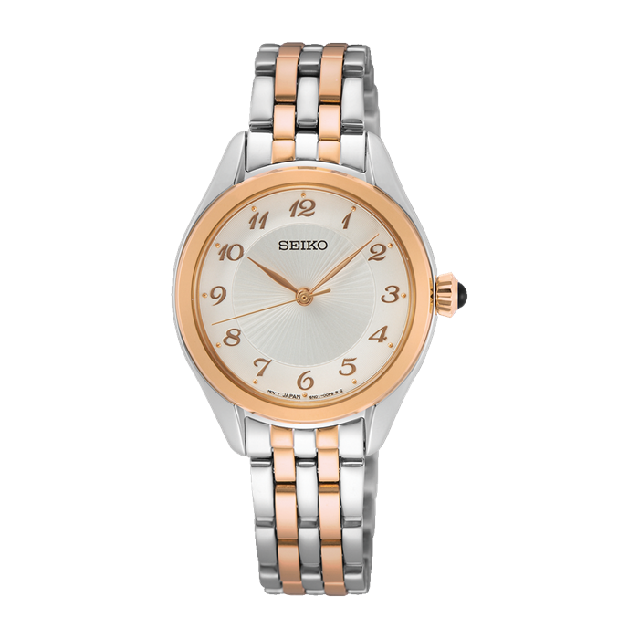 Женские японские часы Seiko Prospex SUR382P1, кварцевый механизм с высокой точностью. Класс водозащиты: 50 метров, позволит защитить корпус от случайных брызг или капель дождя. Корпус часов изготовлен из стали, разноцветного цвета.