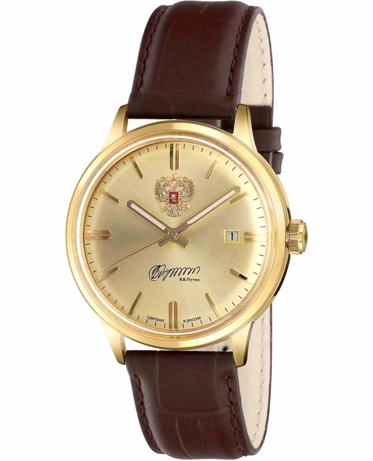 Российские механические наручные часы Слава 1459055/8215-300, которые станут идеальным аксессуаром для повседневного ношения. Эти часы сочетают в себе элегантность и практичность, предлагая безупречный стиль и надежность. Оснащенные механизмом Miyota 8215 с автоподзаводом, они обеспечивают точность и долговечность, поддерживая запас хода до 42 часов. Стальной корпус с IP-покрытиемIP-покрытиеМетод ионного напыления. Демонстрирует повышенную устойчивость к истиранию, окислению и химическим веществам. Под воздействием высокого давления и температуры около 1500°C молекулы металла надёжно соединяются с частицами корпуса часов. и минеральным стекломМинеральное стеклоМинеральное стекло представляет собой искусственно выращенный минерал кварца. Такое стекло отличается особой устойчивостью к повреждениям и царапинам. Уступает по некоторым качествам сапфировому стеклу. защищает золотистый циферблат, выполненный по технологии Sunray. Стрелки  в стиле Baton с люминесцентным покрытиемЛюминесцентное покрытиеПозволяет считывать показания времени в темноте. Производители наносят на стрелки, часовые индексы, безель или поверхность циферблата светонакопительный состав, дающий холодное свечение. облегчают чтение времени даже в условиях слабого освещения. На циферблате изображены герб Российской Федерации и автограф В.В. Путина. Часы также имеют календарь с окошком даты на 3 часах и водозащиту до 50WR, что делает их надежными в различных условиях. Текстурированный кожаный ремешок с классической застежкой завершает этот изысканный образ.