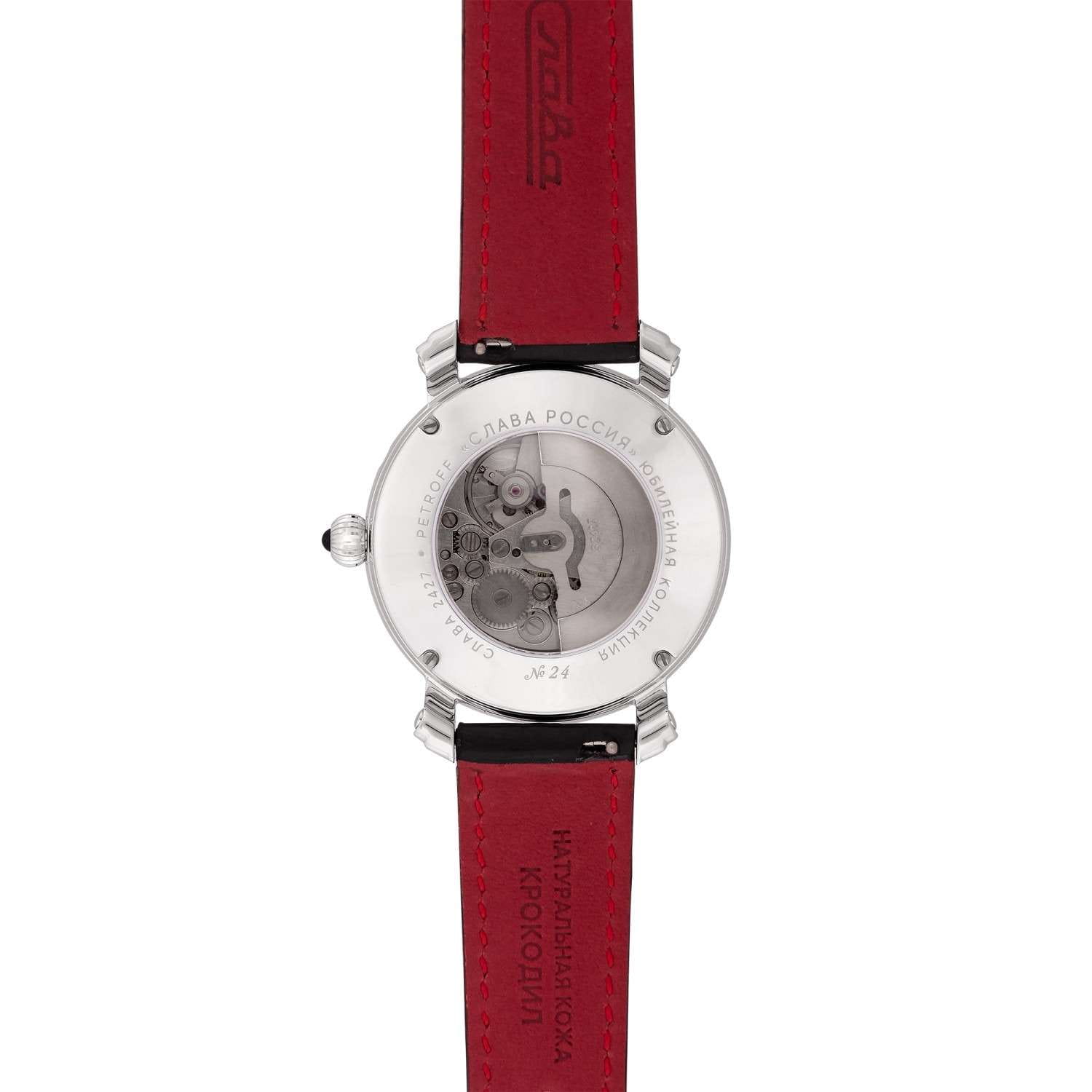 Наручные часы Слава Слава России 2440616/300-2427 — воплощение классического стиля и исключительного качества, произведенные в России. Эта модель из лимитированной коллекции, выпущенной в количестве всего 300 экземпляров, станет великолепным дополнением к вашему образу. Часы оснащены надежным механическим механизмом "Слава 2427" с автоподзаводом, обеспечивающим точный ход и оснащены двойным календарем, что позволяет всегда быть в курсе текущей даты. Корпус из нержавеющей стали с родиевым покрытием диаметром 41 мм и толщиной 14,2 мм отличается высокой прочностью и водозащитой до 5 ATM. Серебристо-голубой циферблат с арабскими цифрами защищен сапфировым стекломСапфировое стеклоПрочный и надёжный материал из кристалла сапфира синтетического происхождения, характеризующийся особой твёрдостью и устойчивостью к царапинам и повреждениям., устойчивым к царапинам, что позволяет надолго сохранить безупречный вид часов. На 3 часах расположено окошко с указателем даты и дня недели. Кожаный ремень из крокодила с застежкой «бабочка»Застёжка "бабочка"Такой вид застёжки дополняется предохранителями, помогающими избежать случайного раскрытия браслета. Обладают изящным исполнением. добавляет элегантности и комфорта, создавая ощущение роскоши и изысканности. Эта модель станет идеальным выбором для тех, кто ценит традиции и высокое качество в сочетании с современным дизайном.