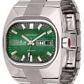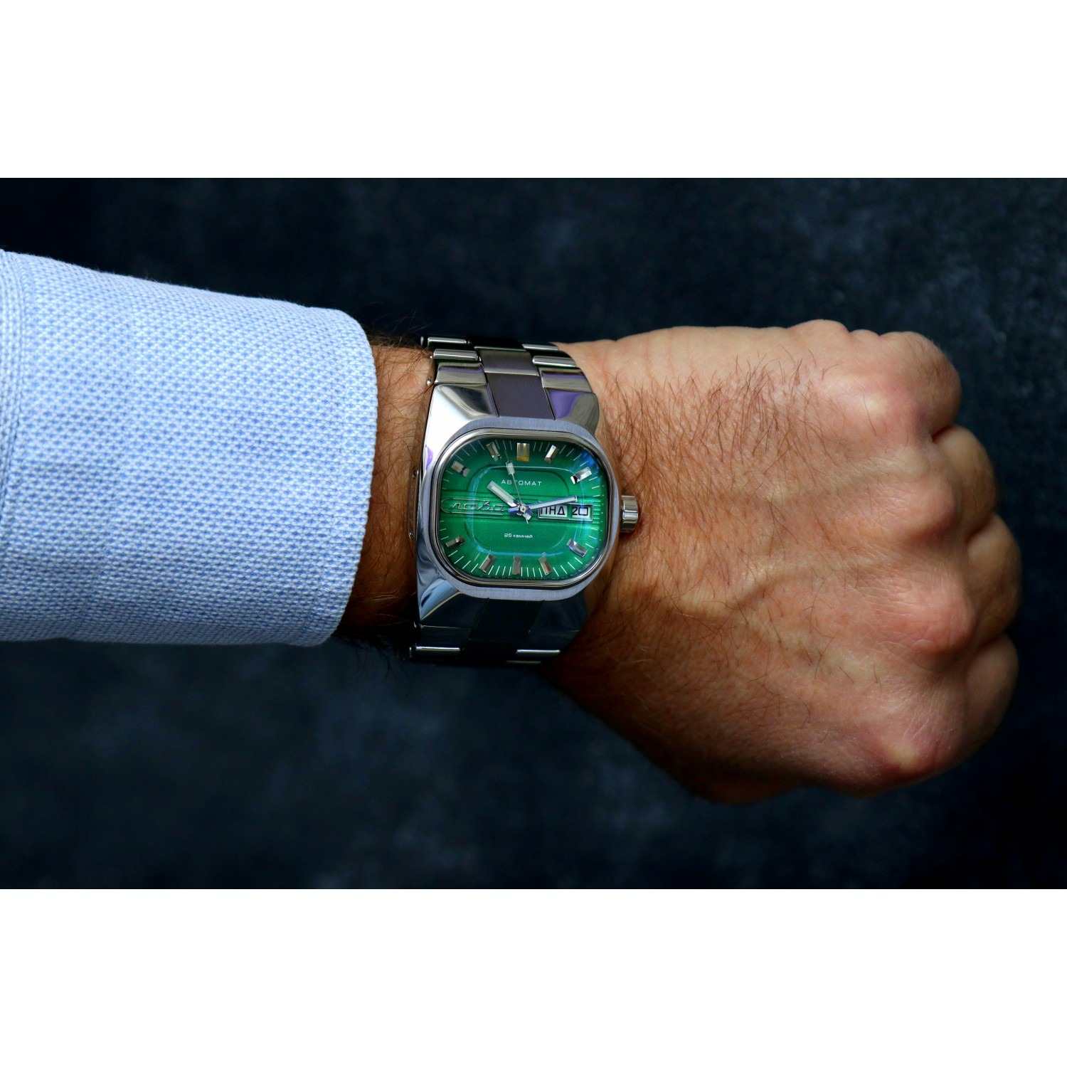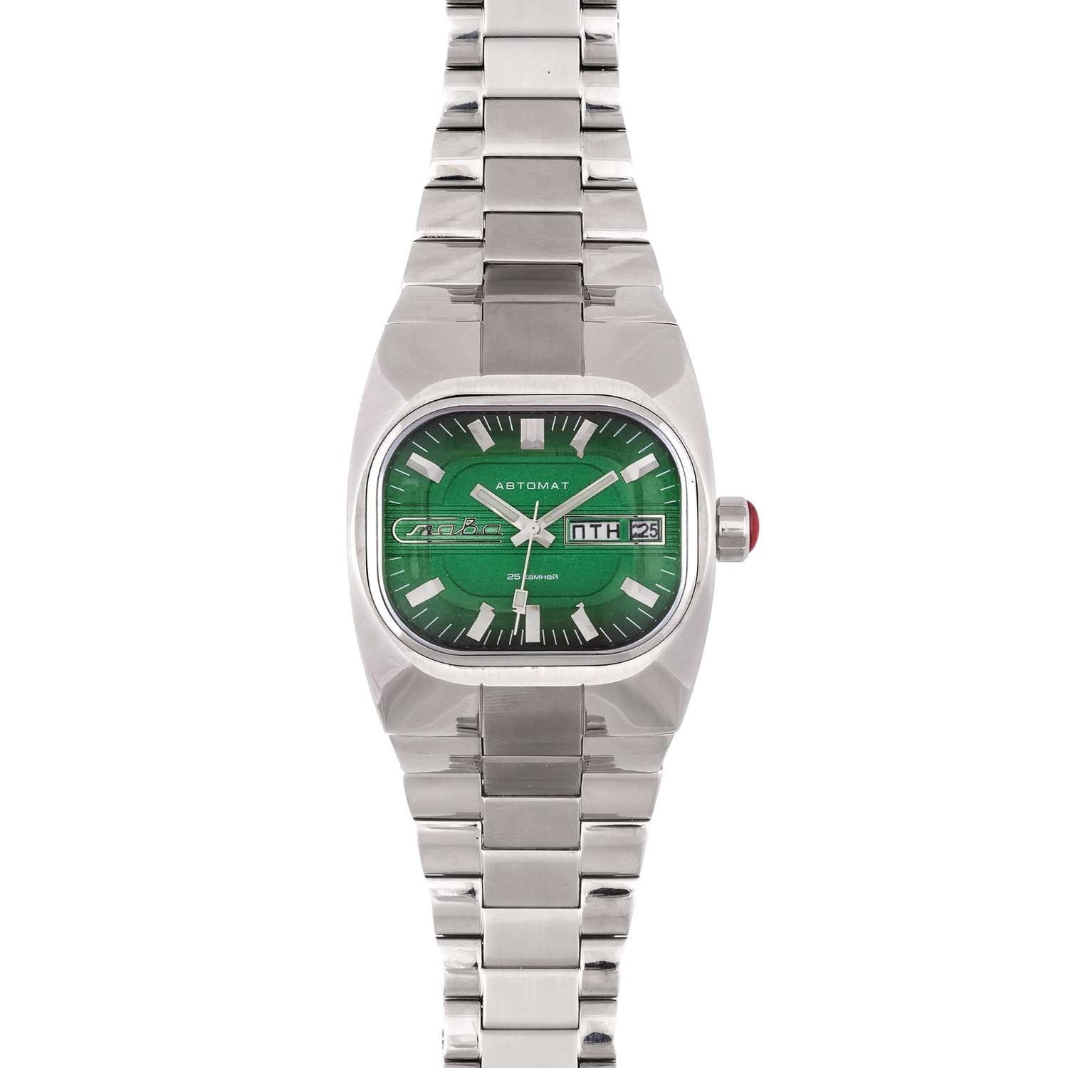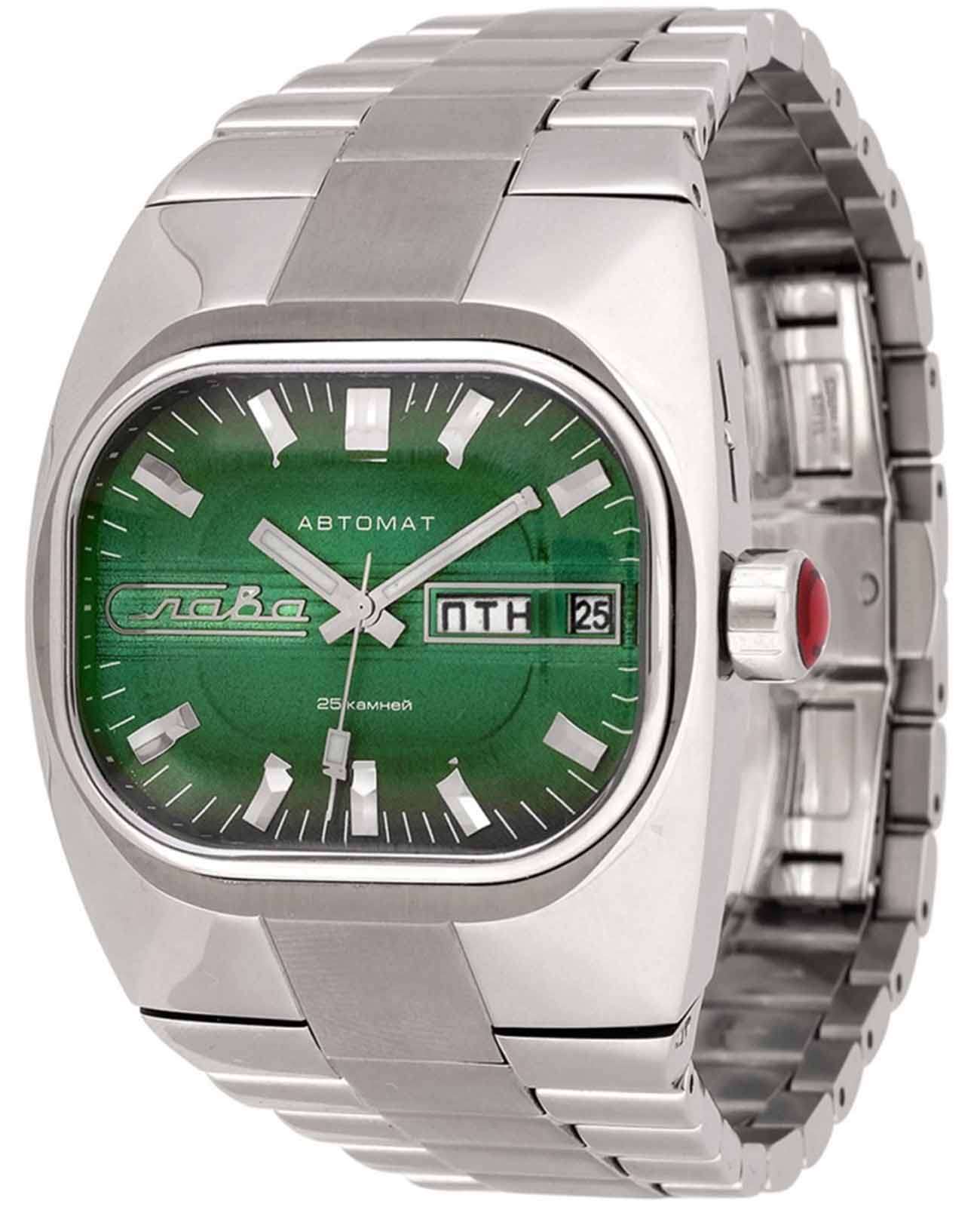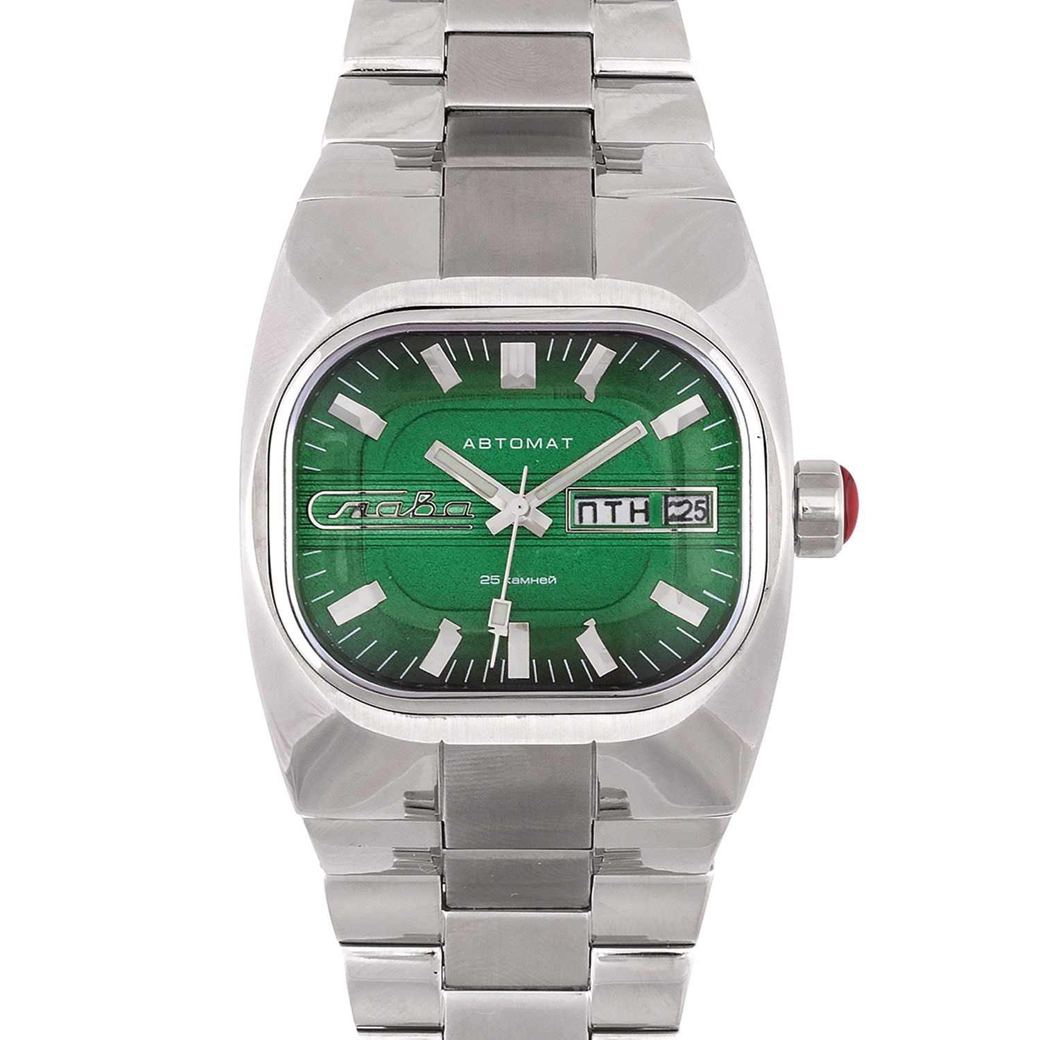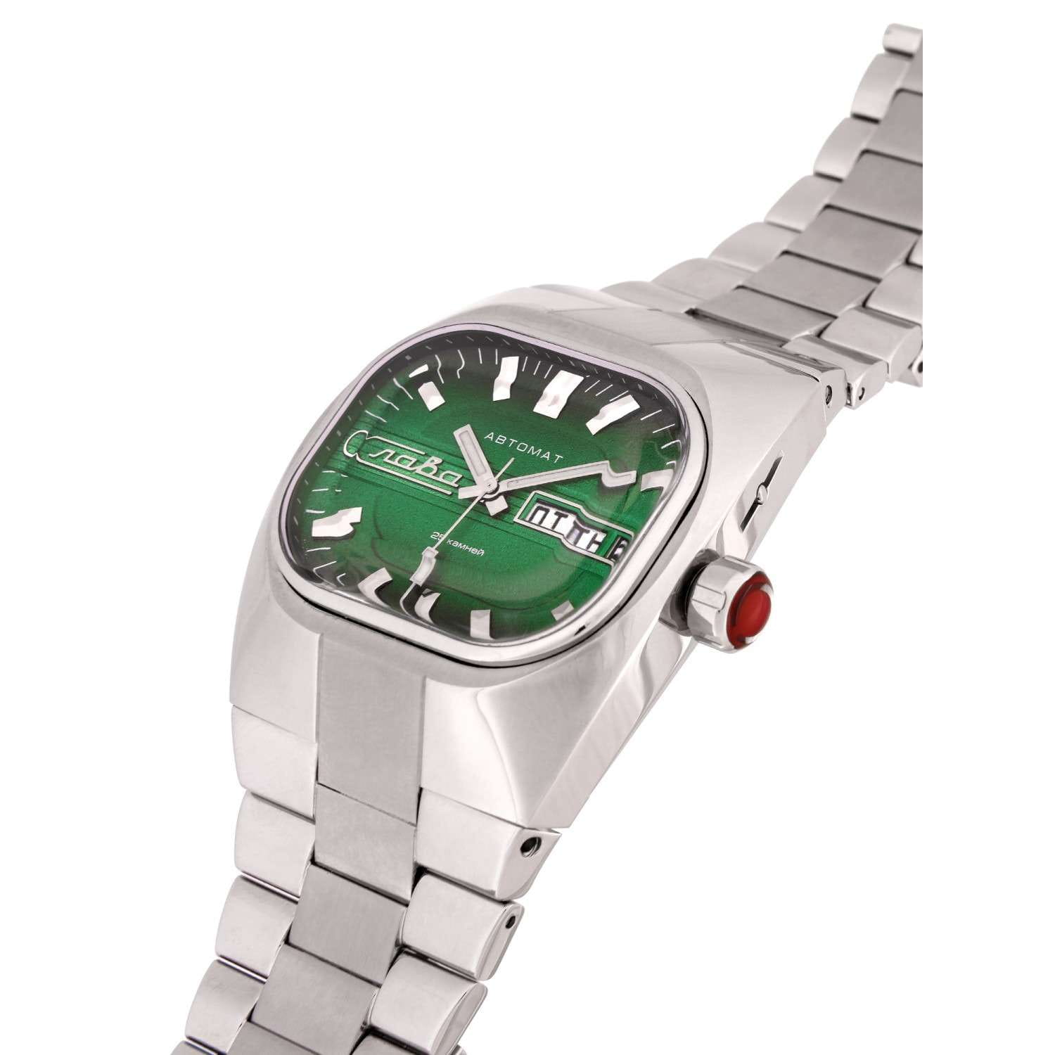 Часы Слава Танк 4320677/100-2427 — это элегантное сочетание ретро стиля и современных технологий, способное подчеркнуть изысканный вкус владельца и дополнить любой образ. Эта лимитированная серия, состоящая из 300 экземпляров, является современной интерпретацией легендарного выпуска часов, созданного специально для делегатов XXV съезда КПСС в 1975 году. Механизм часов с автоподзаводом оснащен калибром «Слава 2427». Запас хода составляет 31 час, что обеспечивает надежность и долговечность в использовании. Корпус и браслет с застежкой «бабочка»Застёжка "бабочка"Такой вид застёжки дополняется предохранителями, помогающими избежать случайного раскрытия браслета. Обладают изящным исполнением. выполнены из высококачественной стали 904L, придающей модели прочность и устойчивость к внешним воздействиям. Диаметр корпуса составляет 42 мм, а толщина — 13 мм, что делает часы удобными в ношении. Зеленый циферблат с метками в виде штрихов защищен выпуклым сапфировым стекломСапфировое стеклоПрочный и надёжный материал из кристалла сапфира синтетического происхождения, характеризующийся особой твёрдостью и устойчивостью к царапинам и повреждениям., стойким к царапинам. Стрелки и метки обладают люминесцентным покрытиемЛюминесцентное покрытиеПозволяет считывать показания времени в темноте. Производители наносят на стрелки, часовые индексы, безель или поверхность циферблата светонакопительный состав, дающий холодное свечение., которое светится в темноте после зарядки на свету, обеспечивая отличную видимость в любых условиях. Календарь с указанием числа и дня недели расположен в положении 3 часа, добавляя функциональности модели. Каждые часы имеют индивидуальный серийный номер, выгравированный на боковой части корпуса, что подчеркивает их уникальность. Прозрачная задняя крышка позволяет наблюдать за работой механизма, а надежный стальной браслет с раскладывающейся застежкой обеспечивает комфорт и безопасность при носке. Часы обладают водозащитой 100WR, что делает их идеальными для активного образа жизни.