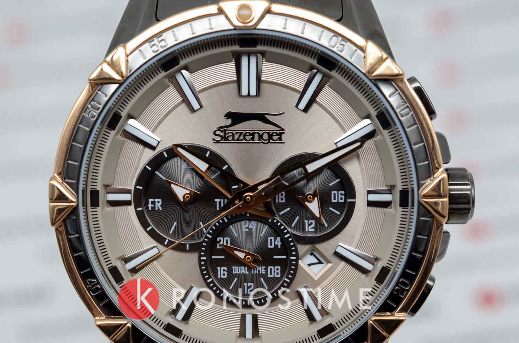 Мужские наручные часы Slazenger SL.09.2035.2.03 — это элегантный и функциональный аксессуар, сочетающий в себе классический дизайн и современные технологии. Модель обладает круглым корпусом диаметром 46 мм, выполненный из суперметалла и безельБезельВнешний ободок, закрепляющий стекло. В спортивных часах так называется поворотное кольцо с делениями на циферблате, выполняет роль таймера – замеряет отрезки времени на шкале. Неподвижный безель – элемент декора. Однонаправленно вращающийся безель на дайверских часах позволяет фиксировать моменты погружения и выныривания на поверхность. с IP-покрытиемIP-покрытиеМетод ионного напыления. Демонстрирует повышенную устойчивость к истиранию, окислению и химическим веществам. Под воздействием высокого давления и температуры около 1500°C молекулы металла надёжно соединяются с частицами корпуса часов., что обеспечивает устойчивость к царапинам и коррозии.