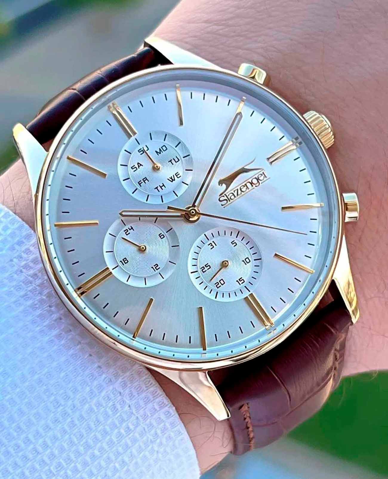 Мужские наручные часы Slazenger SL.09.2124.2.02 сочетают в себе классический дизайн и надежность современных технологий. Модель обладает круглым корпусом диаметром 42 мм, изготовленным из суперметалла с IP-покрытиемIP-покрытиеМетод ионного напыления. Демонстрирует повышенную устойчивость к истиранию, окислению и химическим веществам. Под воздействием высокого давления и температуры около 1500°C молекулы металла надёжно соединяются с частицами корпуса часов., что обеспечивает высокую устойчивость к внешним воздействиям. Браслет выполнен из натуральной кожи коричневого цвета, гарантирующий комфортное ношение и стильный внешний вид. Циферблат серебристого цвета декорирован стрелками, которые обеспечивают читаемость времени даже в условиях недостаточной освещенности. Для защиты используется минеральное стеклоМинеральное стеклоМинеральное стекло представляет собой искусственно выращенный минерал кварца. Такое стекло отличается особой устойчивостью к повреждениям и царапинам. Уступает по некоторым качествам сапфировому стеклу., обеспечивающее прочную защиту от царапин. Часы работают на кварцевом механизме, что гарантирует точное время без необходимости подзаводки. Модель также оснащена дополнительными функциями, такими как отображение даты и дня недели, делая ее практичной для повседневного использования. Водонепроницаемость часов достигает 5 атмосфер (WR50), что позволяет использовать их во время плавания, однако не рекомендуется для дайвинга или других водных видов спорта. Толщина часов составляет 14 мм.