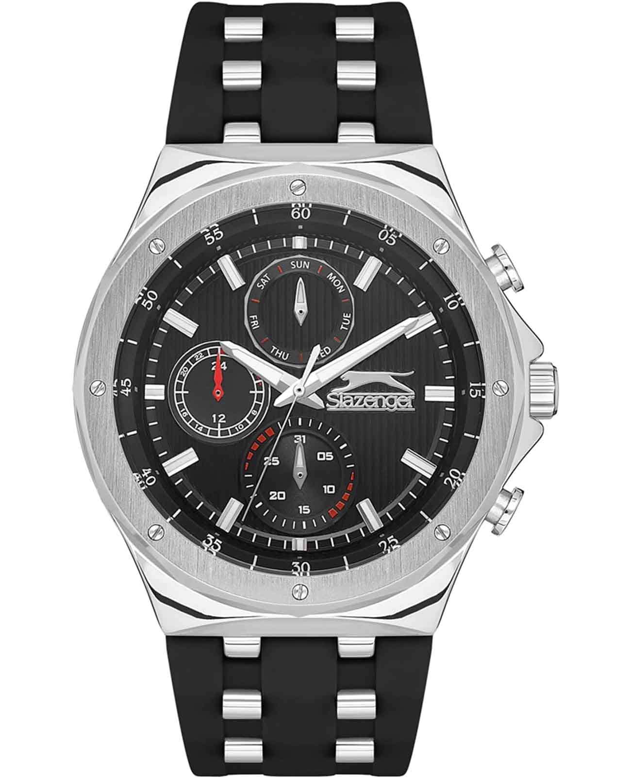 Мужские наручные часы Slazenger SL.09.2218.2.01 — идеальный аксессуар для тех, кто ценит стиль и функциональность. Эти часы, созданные известным британским брендом, отличаются высоким качеством и надежностью. Оснащенные кварцевым механизмом, они гарантируют точность хода и долгий срок службы. Корпус часов выполнен из прочного металла, а черный циферблат защищен минеральным стекломМинеральное стеклоМинеральное стекло представляет собой искусственно выращенный минерал кварца. Такое стекло отличается особой устойчивостью к повреждениям и царапинам. Уступает по некоторым качествам сапфировому стеклу., устойчивым к царапинам и повреждениям. Черный резиновый ремешок с металлическими вставками и классической застежкой обеспечивает комфортное ношение и надежную фиксацию на запястье. Диаметр корпуса составляет 46 мм, а толщина — 12 мм, что придает часам современный и стильный вид. Благодаря водозащите уровня WR 50, вы можете не беспокоиться о случайных попаданиях влаги, что делает эти часы идеальными для повседневного использования. Стрелки снабжены люминесцентным покрытиемЛюминесцентное покрытиеПозволяет считывать показания времени в темноте. Производители наносят на стрелки, часовые индексы, безель или поверхность циферблата светонакопительный состав, дающий холодное свечение., что позволяет легко считывать время в темноте. Функциональность модели включает в себя отображение даты, дня недели и времени в 24-часовом формате на дополнительных малых циферблатах, что делает часы не только стильными, но и практичными.