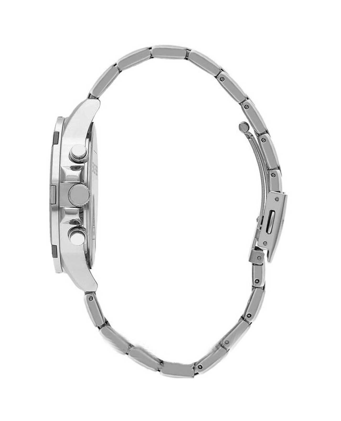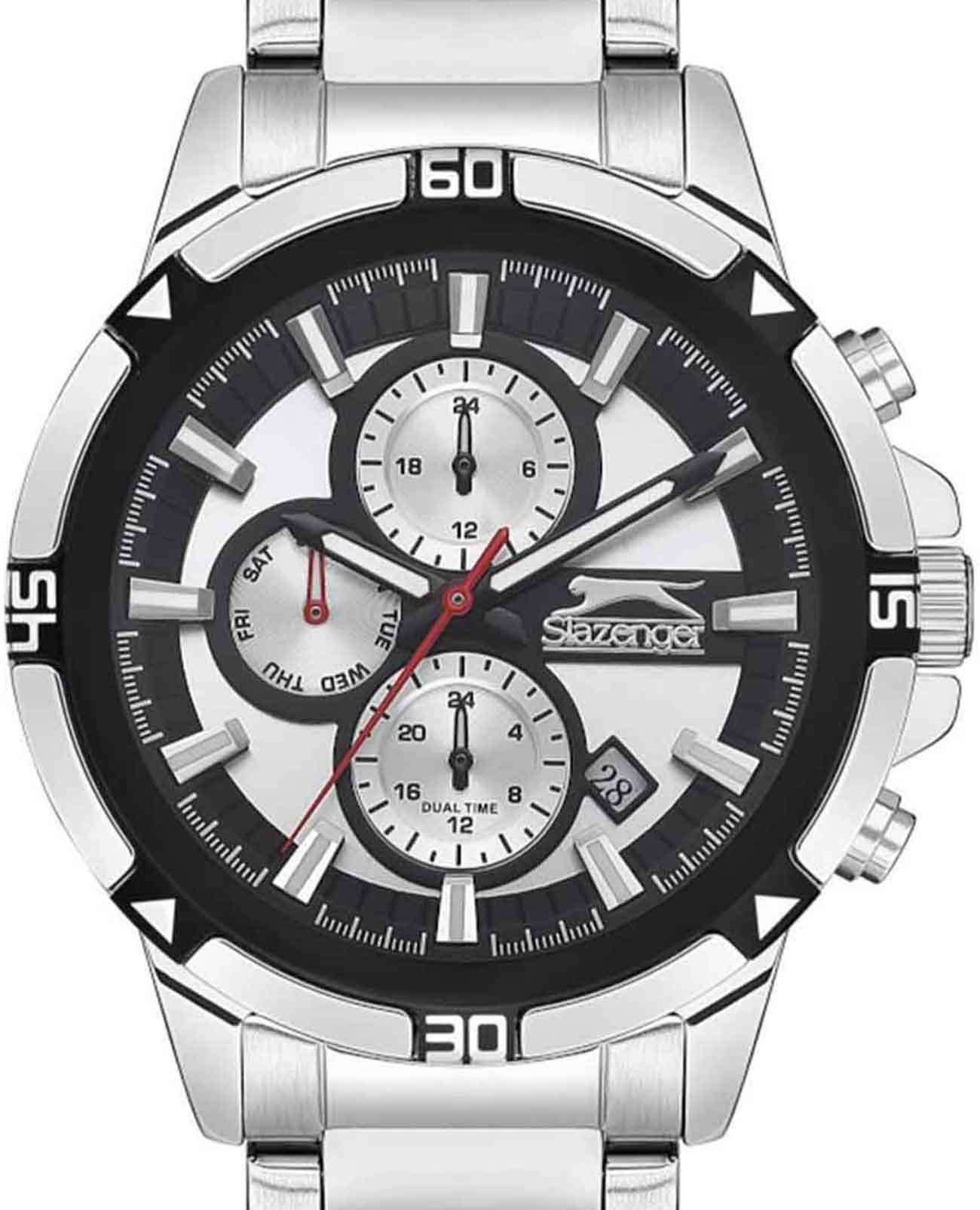 Часы Slazenger SL.09.2249.2.01 — это стильная и практичная модель, выполненная в элегантном серебристом цвете. Корпус и браслет изготовлены из металла, что обеспечивает прочность и долговечность. На безельБезельВнешний ободок, закрепляющий стекло. В спортивных часах так называется поворотное кольцо с делениями на циферблате, выполняет роль таймера – замеряет отрезки времени на шкале. Неподвижный безель – элемент декора. Однонаправленно вращающийся безель на дайверских часах позволяет фиксировать моменты погружения и выныривания на поверхность. частично нанесено черное IP-покрытиеIP-покрытиеМетод ионного напыления. Демонстрирует повышенную устойчивость к истиранию, окислению и химическим веществам. Под воздействием высокого давления и температуры около 1500°C молекулы металла надёжно соединяются с частицами корпуса часов.. Минеральное стеклоМинеральное стеклоМинеральное стекло представляет собой искусственно выращенный минерал кварца. Такое стекло отличается особой устойчивостью к повреждениям и царапинам. Уступает по некоторым качествам сапфировому стеклу. надежно защищает черно-серебристый циферблат от царапин и повреждений. Диаметр корпуса составляет 45 мм, а толщина — 12 мм, благодаря чему часы смотрятся солидно и современно. Модель оснащена кварцевым механизмом, отличающимся точностью и надежностью. На циферблате представлены дополнительные малые циферблаты для отображения второго часового поясаВторой часовой поясФункция, позволяющая отображать время двух часовых поясов одновременно., дня недели и времени в 24-часовом формате, а также имеется отдельное окошко даты. Для удобства использования в темное время суток предусмотрено люминесцентное покрытиеЛюминесцентное покрытиеПозволяет считывать показания времени в темноте. Производители наносят на стрелки, часовые индексы, безель или поверхность циферблата светонакопительный состав, дающий холодное свечение. стрелок и меток. Удобный металлический браслет шириной 22 мм снабжен раскладной застёжкойРаскладная застёжкаТакой тип застёжки используется только на браслетах из металла. Она никогда не раскрывается полностью, происходит разделение на 2 и более частей. Раскладывающая застёжка снизит вероятность потери часов к минимуму., обеспечивающей надежную фиксацию на запястье. Заводная головка оснащена защитой. Водозащита уровня WR 50 позволяет не снимать часы при мытье рук или попадании под дождь. Вес модели составляет 151 грамм.