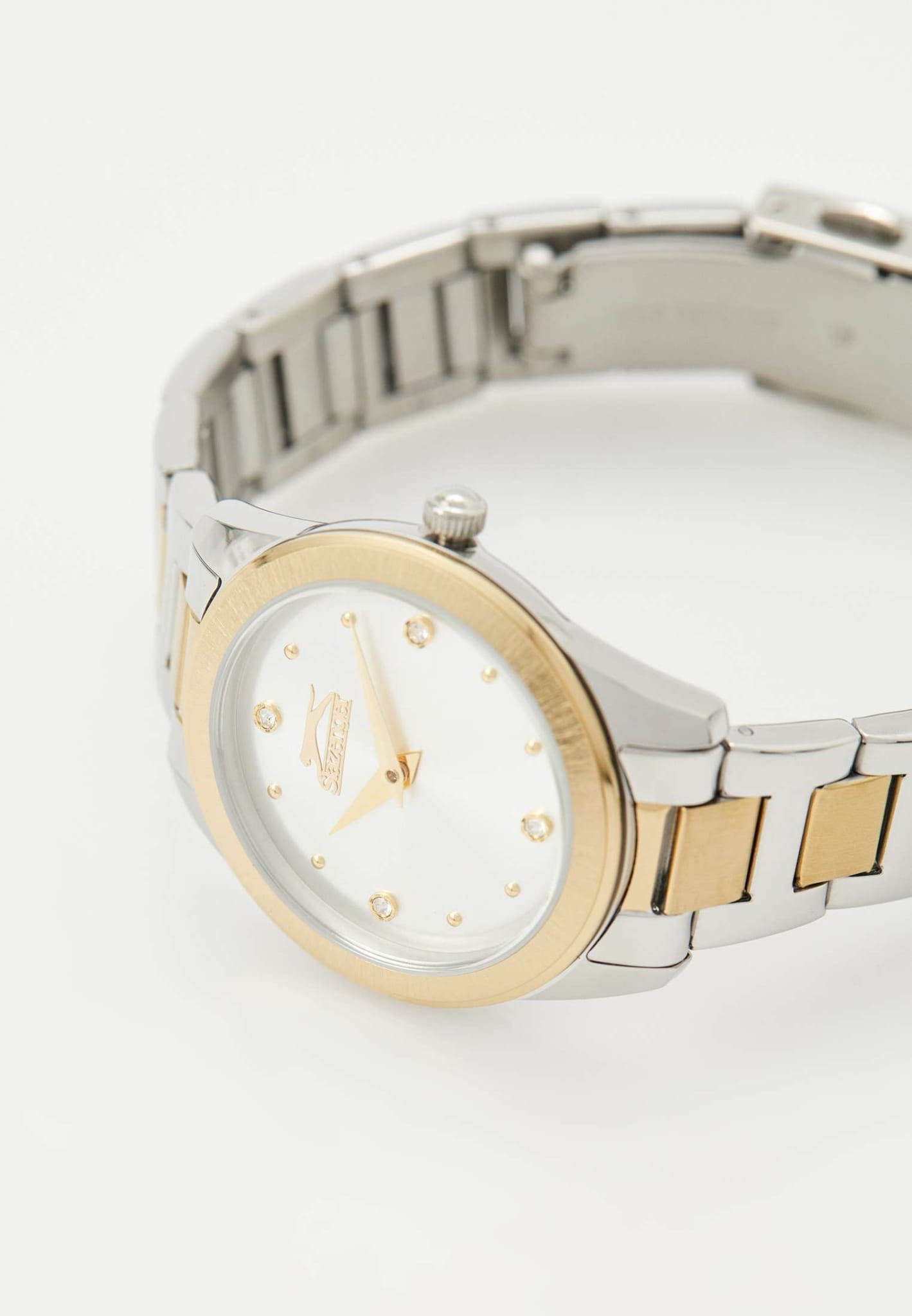 Часы Slazenger SL.09.2253.3.02 — это стильная и элегантная модель, созданная для тех, кто ценит утонченность и надежность. Корпус выполнен из прочного металла, а изящный серебристый браслет с частичным золотистым IP-покрытиемIP-покрытиеМетод ионного напыления. Демонстрирует повышенную устойчивость к истиранию, окислению и химическим веществам. Под воздействием высокого давления и температуры около 1500°C молекулы металла надёжно соединяются с частицами корпуса часов. оснащен удобной раскладной застёжкойРаскладная застёжкаТакой тип застёжки используется только на браслетах из металла. Она никогда не раскрывается полностью, происходит разделение на 2 и более частей. Раскладывающая застёжка снизит вероятность потери часов к минимуму.. На безельБезельВнешний ободок, закрепляющий стекло. В спортивных часах так называется поворотное кольцо с делениями на циферблате, выполняет роль таймера – замеряет отрезки времени на шкале. Неподвижный безель – элемент декора. Однонаправленно вращающийся безель на дайверских часах позволяет фиксировать моменты погружения и выныривания на поверхность. нанесено золотистое IP-покрытиеIP-покрытиеМетод ионного напыления. Демонстрирует повышенную устойчивость к истиранию, окислению и химическим веществам. Под воздействием высокого давления и температуры около 1500°C молекулы металла надёжно соединяются с частицами корпуса часов.. Минеральное стеклоМинеральное стеклоМинеральное стекло представляет собой искусственно выращенный минерал кварца. Такое стекло отличается особой устойчивостью к повреждениям и царапинам. Уступает по некоторым качествам сапфировому стеклу. защищает серебристый циферблат, украшенный сияющими кристаллами, придающими аксессуару особый шарм. Кварцевый механизм обеспечивает точность хода, а водозащита класса WR 30 позволяет не беспокоиться о случайных брызгах. Диаметр корпуса составляет 33 мм, ширина браслета — 16 мм, толщина корпуса — 8 мм, что делает эти часы аккуратными и комфортными для повседневной носки. Модель весит 70 грамм. Часы прекрасно дополнят как деловой, так и повседневный образ, подчеркивая индивидуальность своей обладательницы.